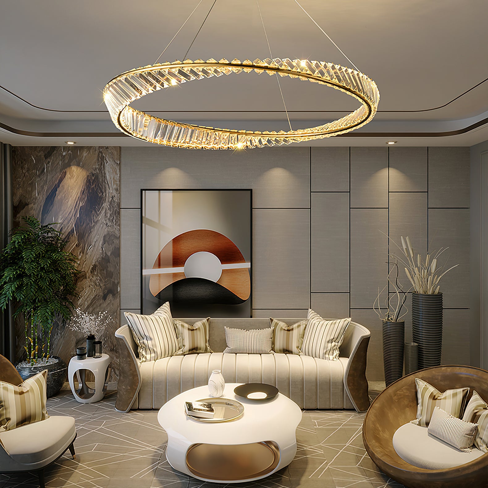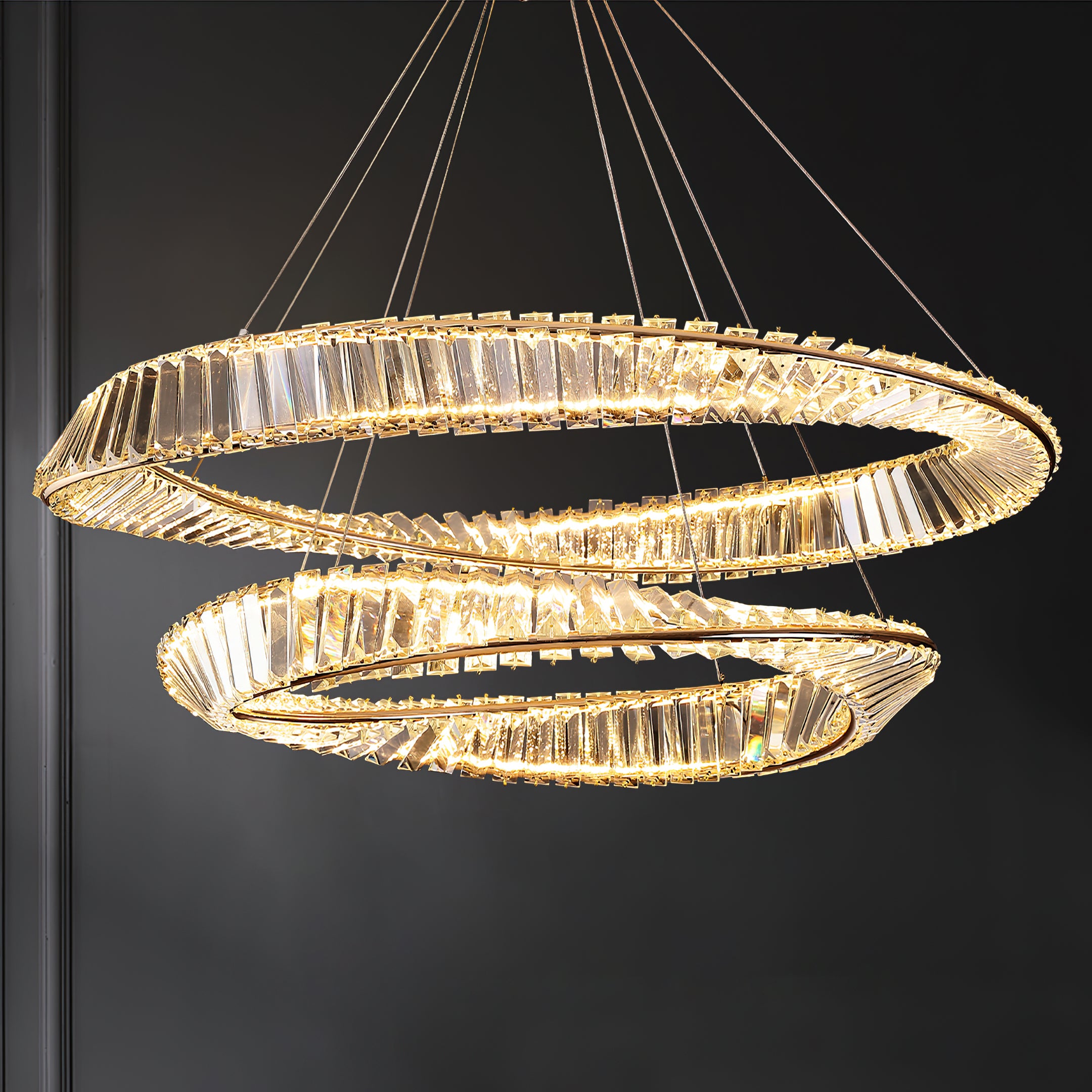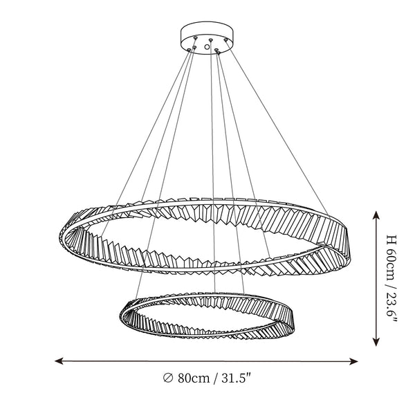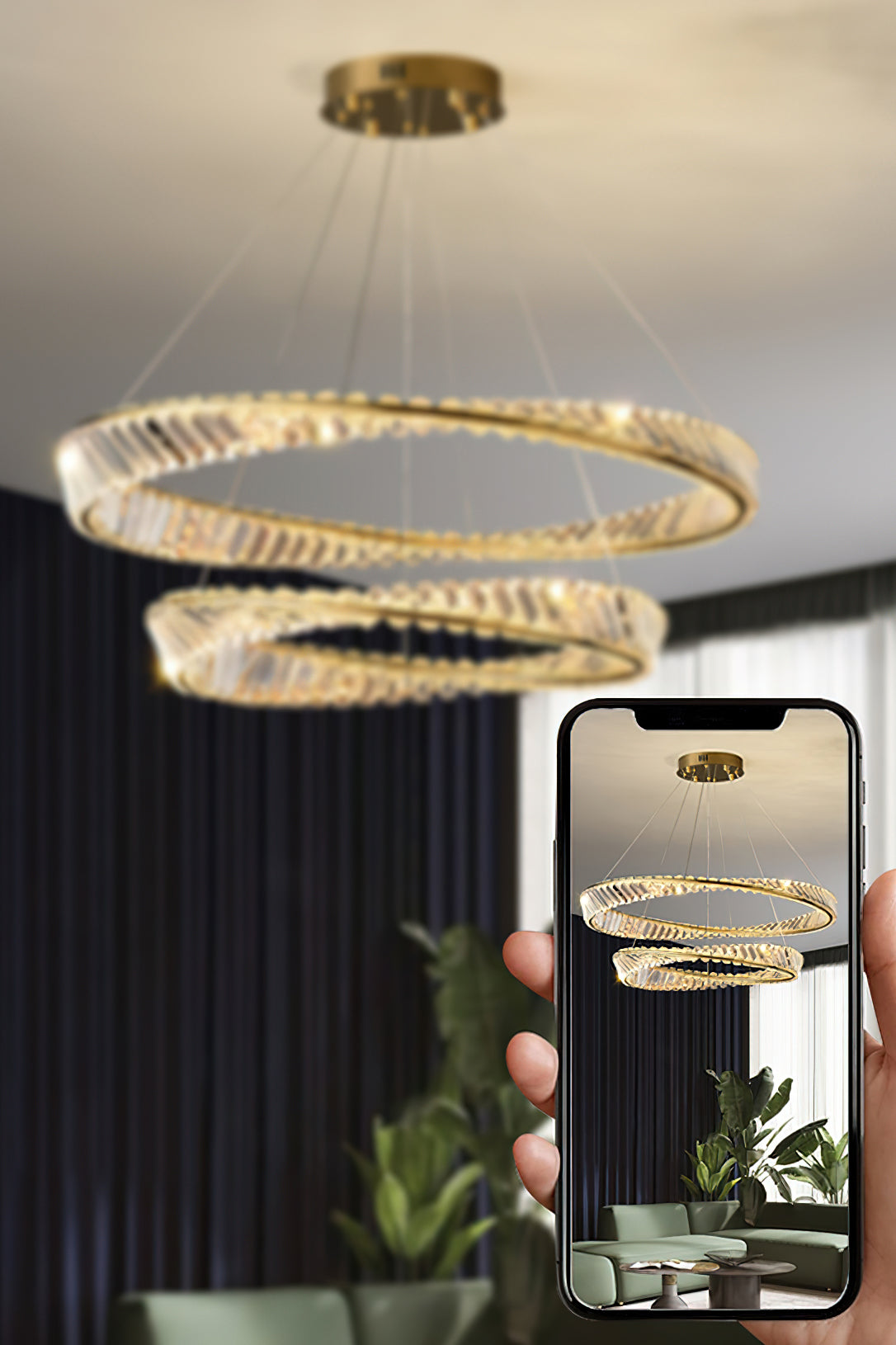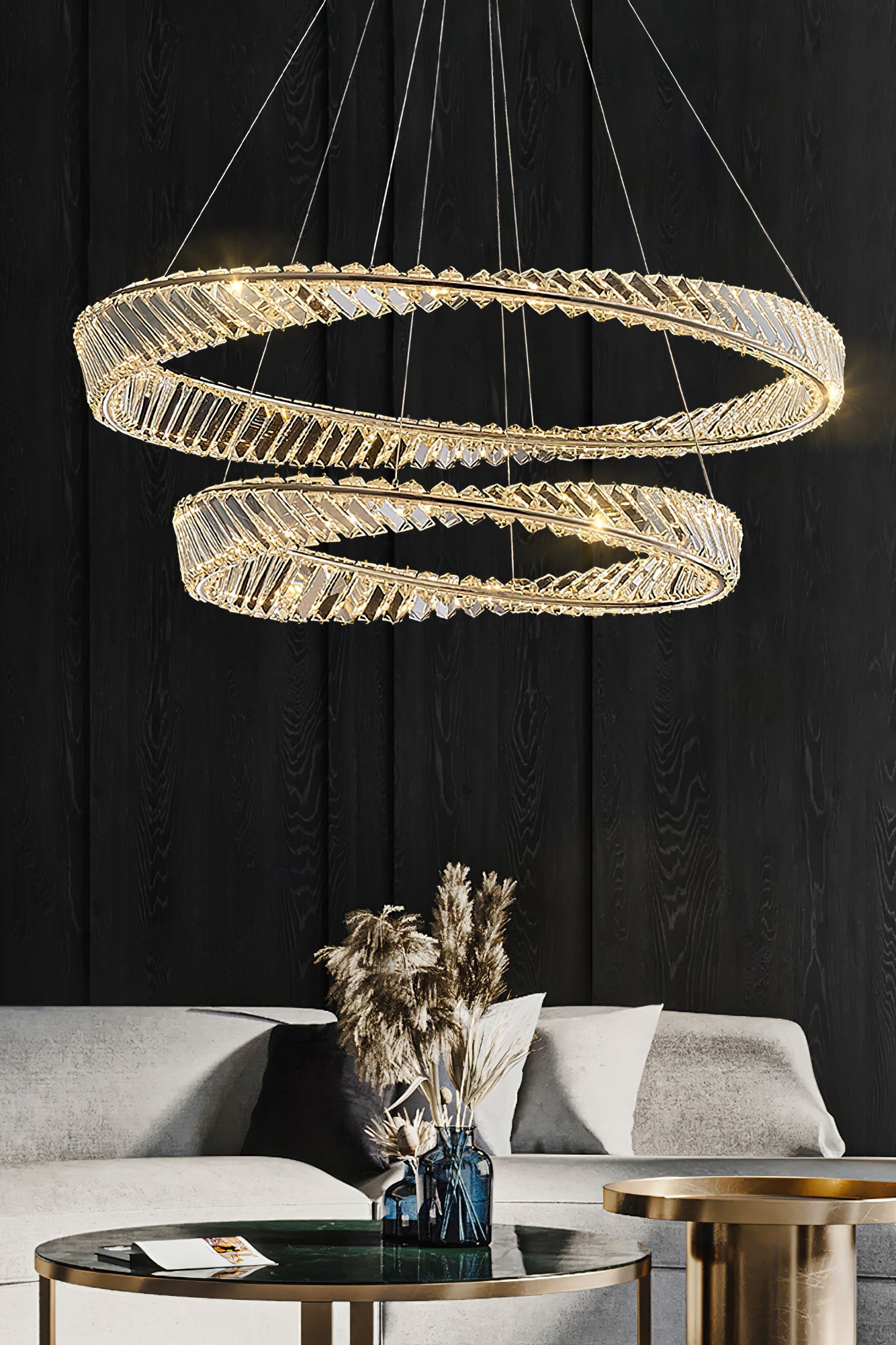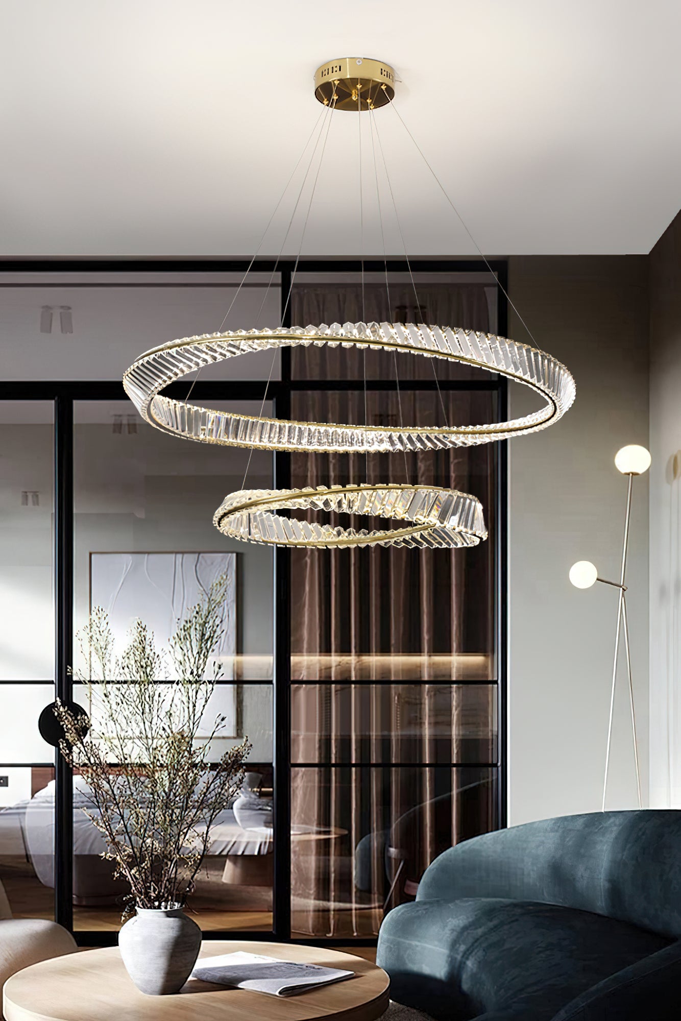 Glittering from every angle, it's timeless. Dreamy light and sheer clarity, this pendant features faceted crystal cut in the shape of a Möbius ring and framed in brushed brass. Outline the atmospheric charm of modern style with straightforward and concise lines, and endow the space with a touch of light luxury. As your eyes follow the frame, it orbits the crystal in a unique way.