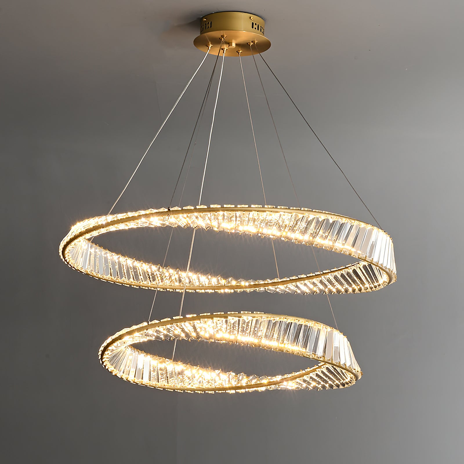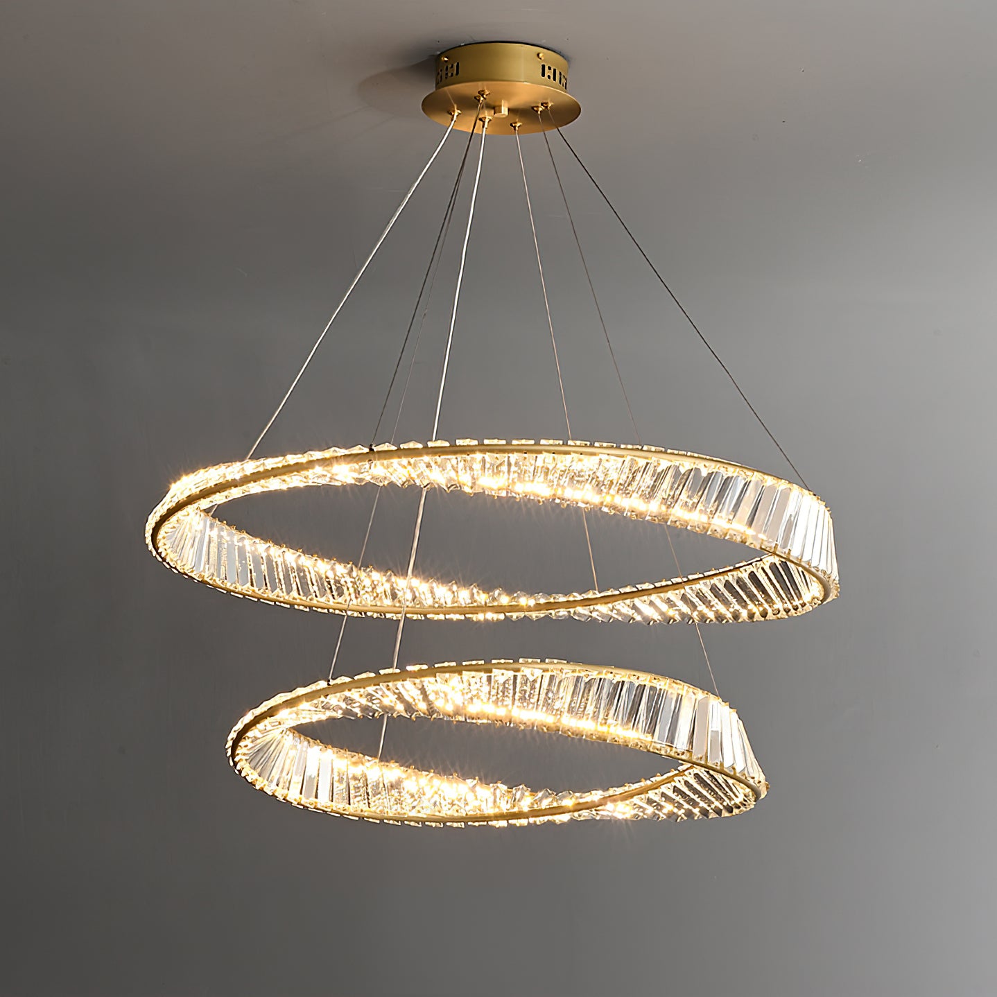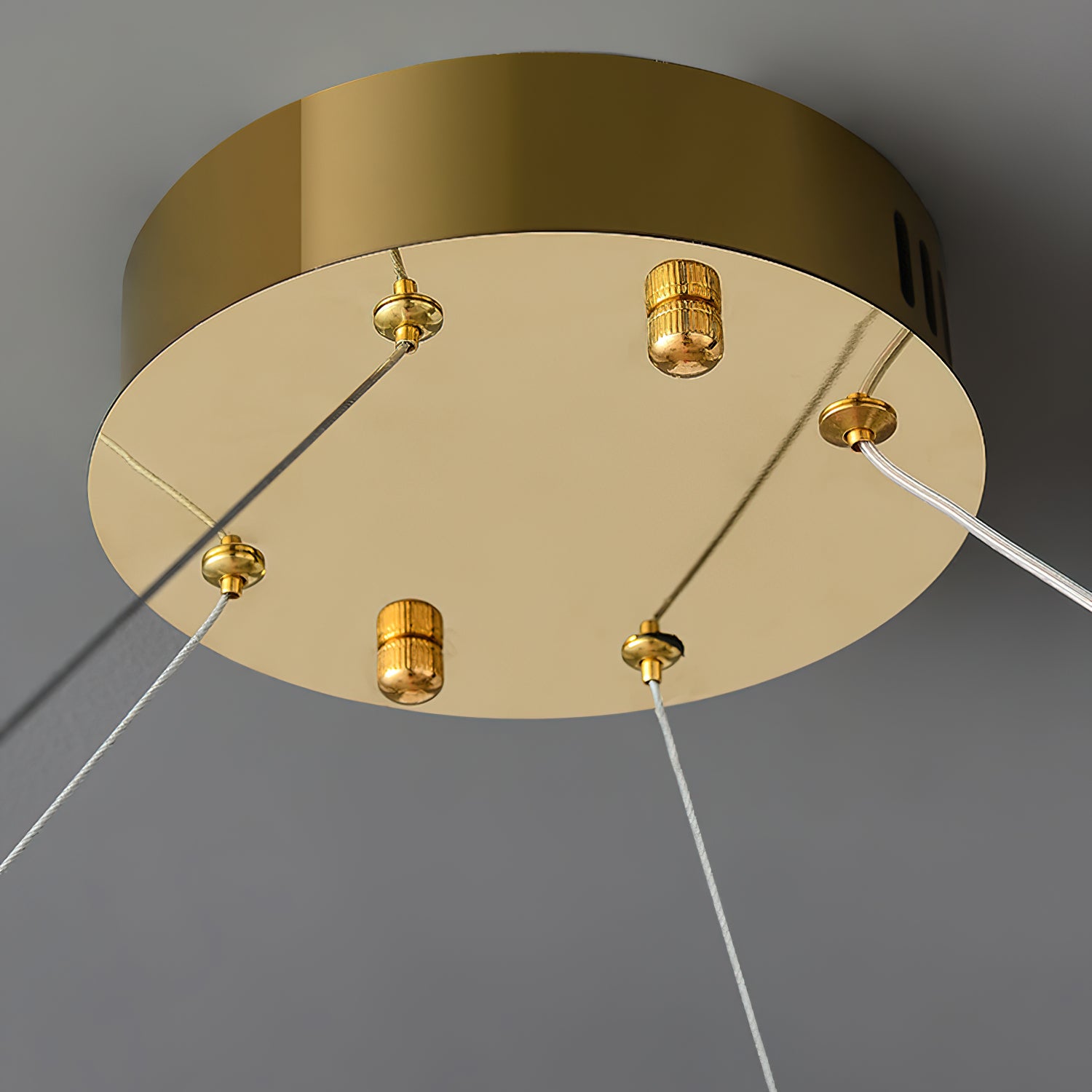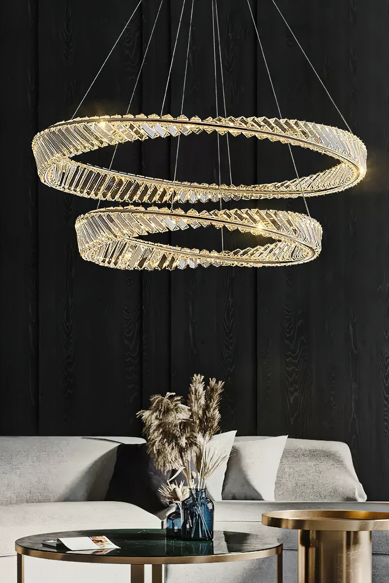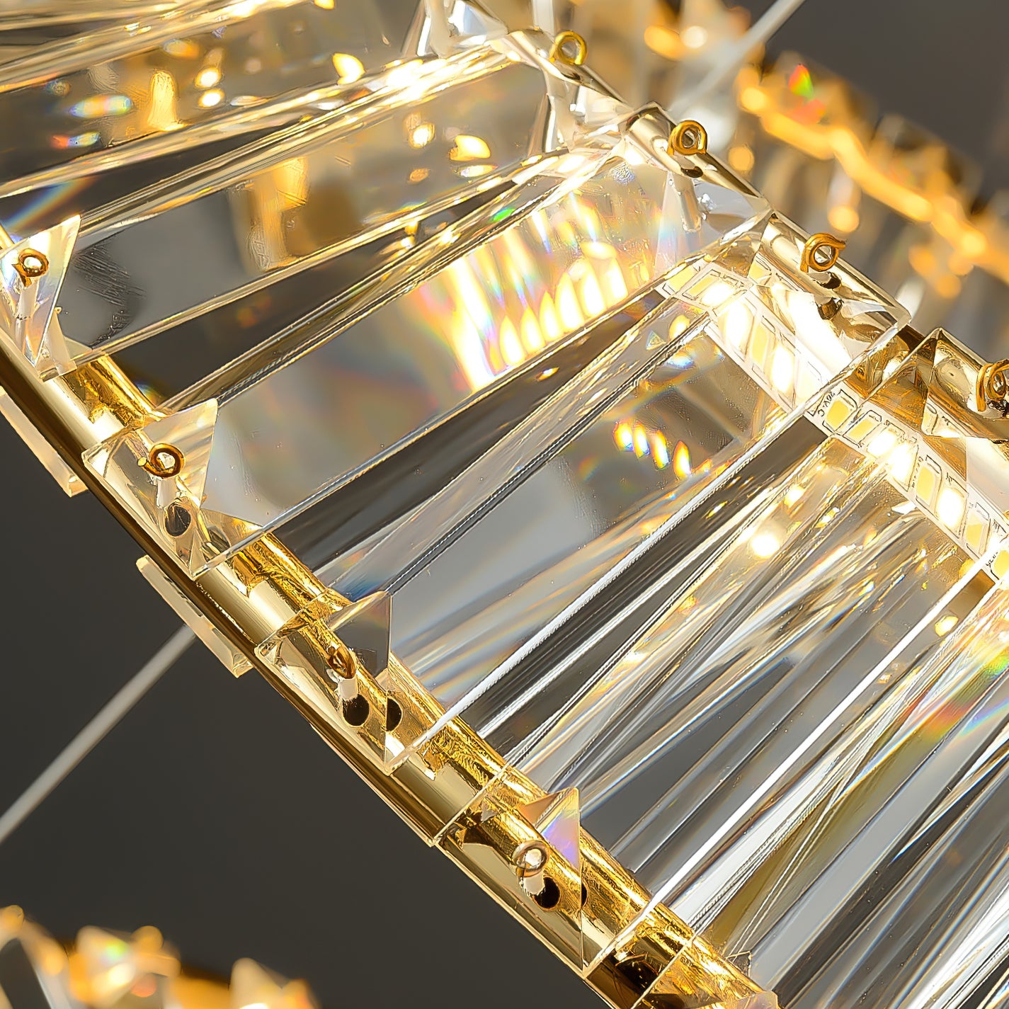 Glittering from every angle, it's timeless. Dreamy light and sheer clarity, this pendant features faceted crystal cut in the shape of a Möbius ring and framed in brushed brass. Outline the atmospheric charm of modern style with straightforward and concise lines, and endow the space with a touch of light luxury. As your eyes follow the frame, it orbits the crystal in a unique way.