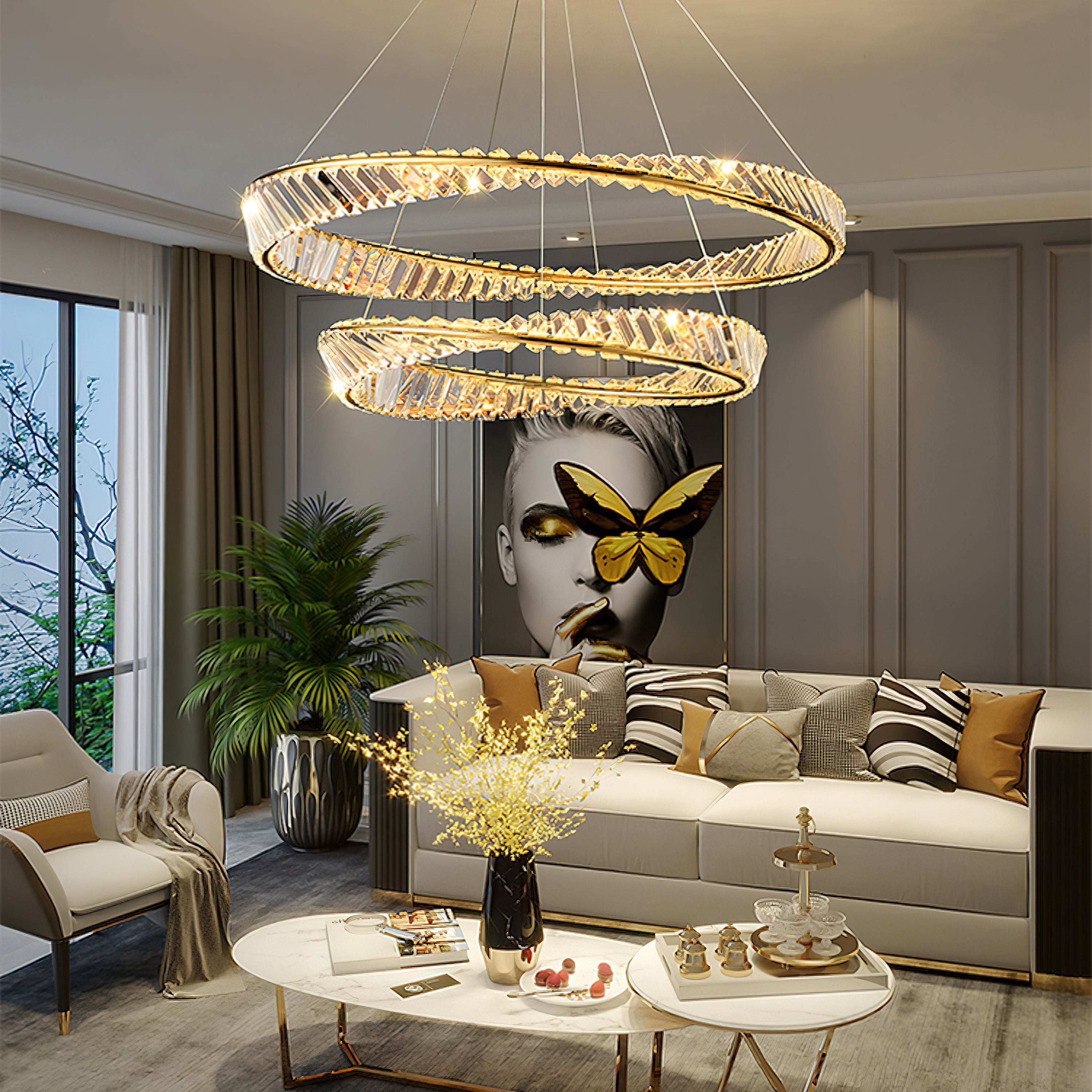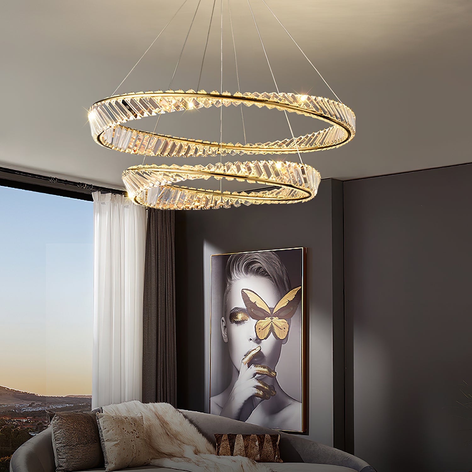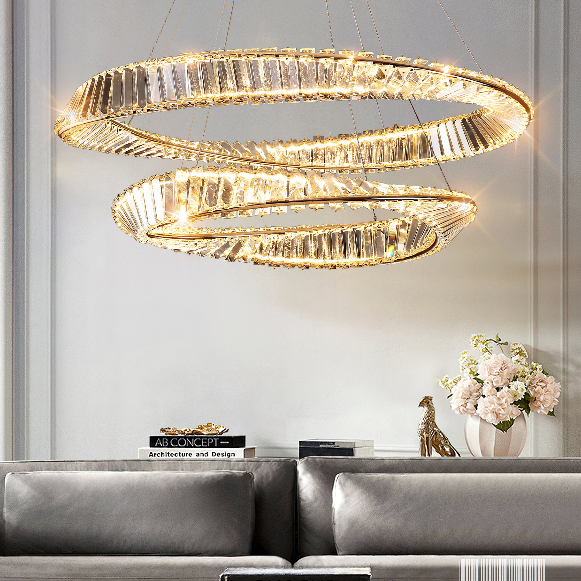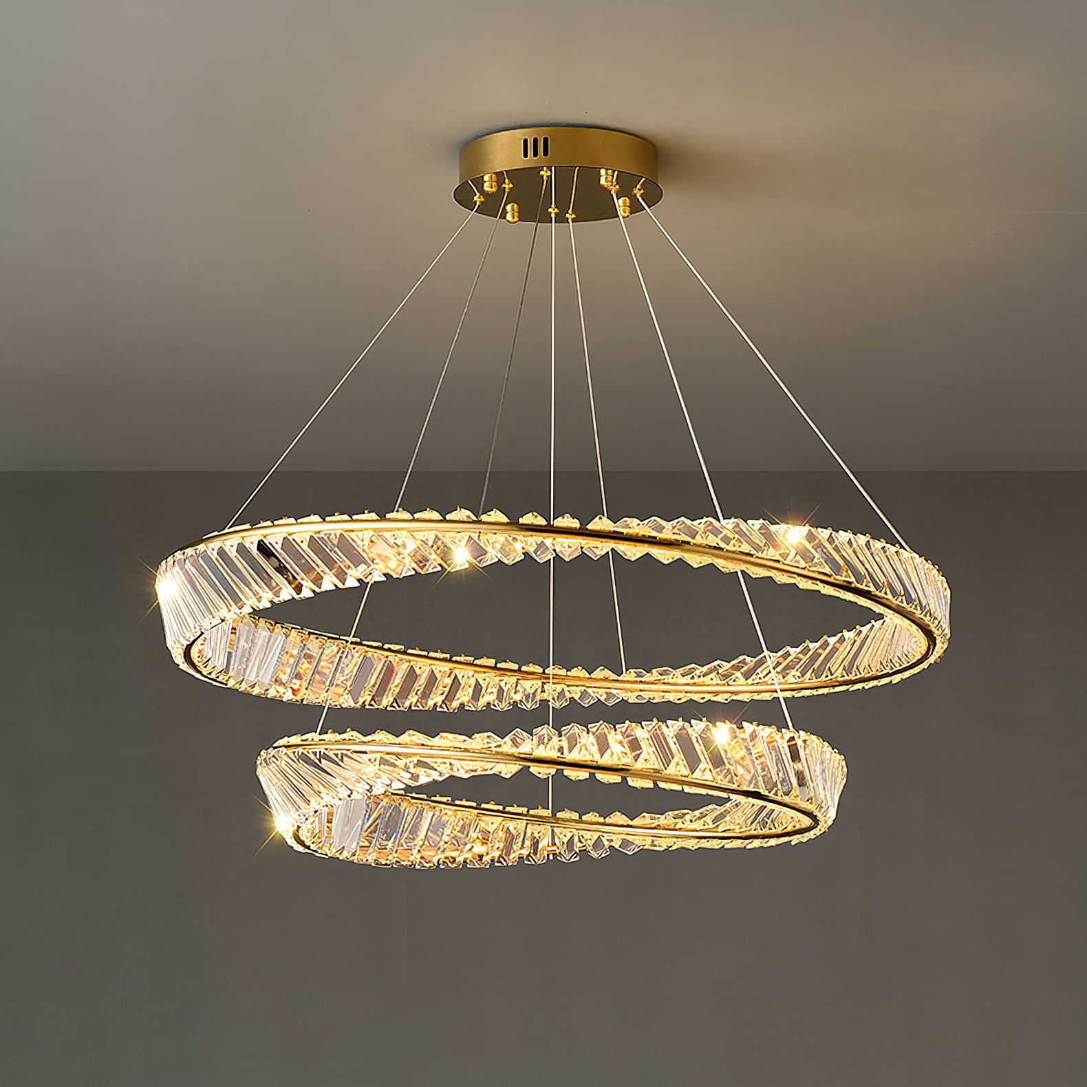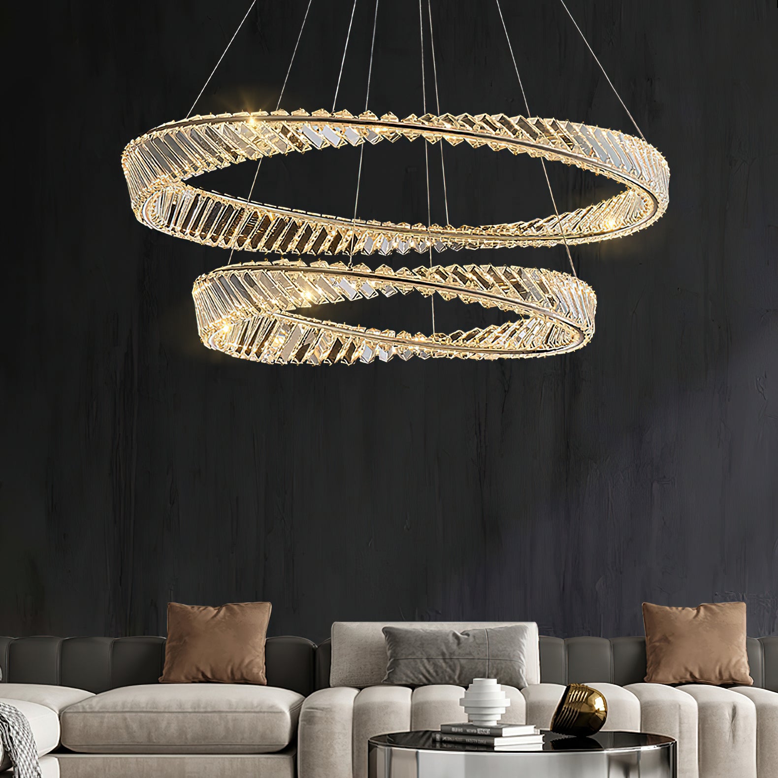 Glittering from every angle, it's timeless. Dreamy light and sheer clarity, this pendant features faceted crystal cut in the shape of a Möbius ring and framed in brushed brass. Outline the atmospheric charm of modern style with straightforward and concise lines, and endow the space with a touch of light luxury. As your eyes follow the frame, it orbits the crystal in a unique way.