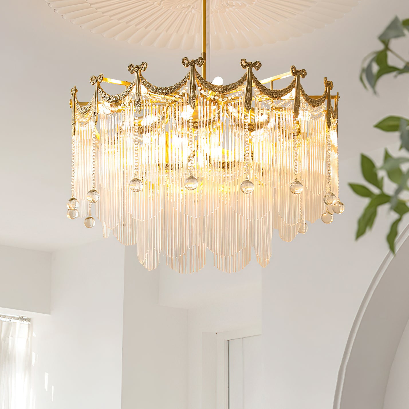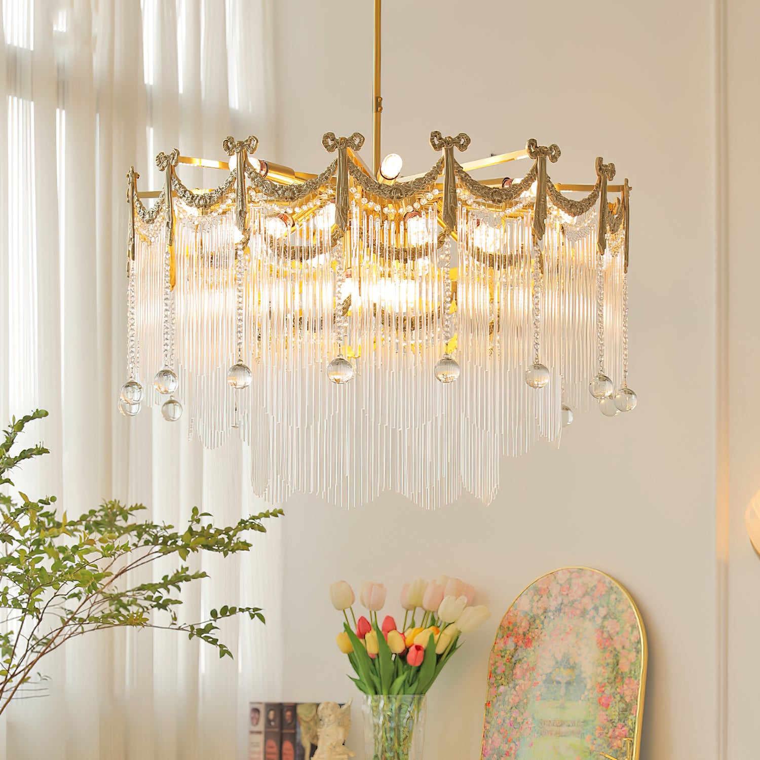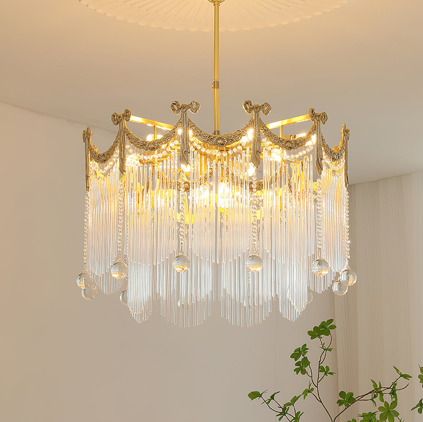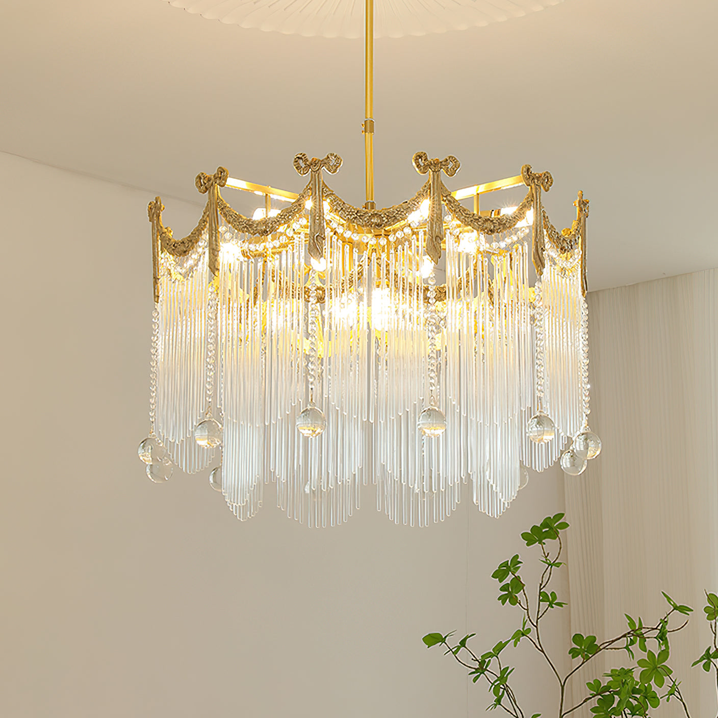Transform your space with our Palace Water Drop Chandelier. This charming modern chandelier has an old-world beauty that adds a touch of elegance to any room. The crystal chain and round beads create a warm and romantic atmosphere, creating a chic ambiance at the flick of a switch. This chandelier will enhance the style of your home, perfect for the foyer, dining room, living room, and bedroom.