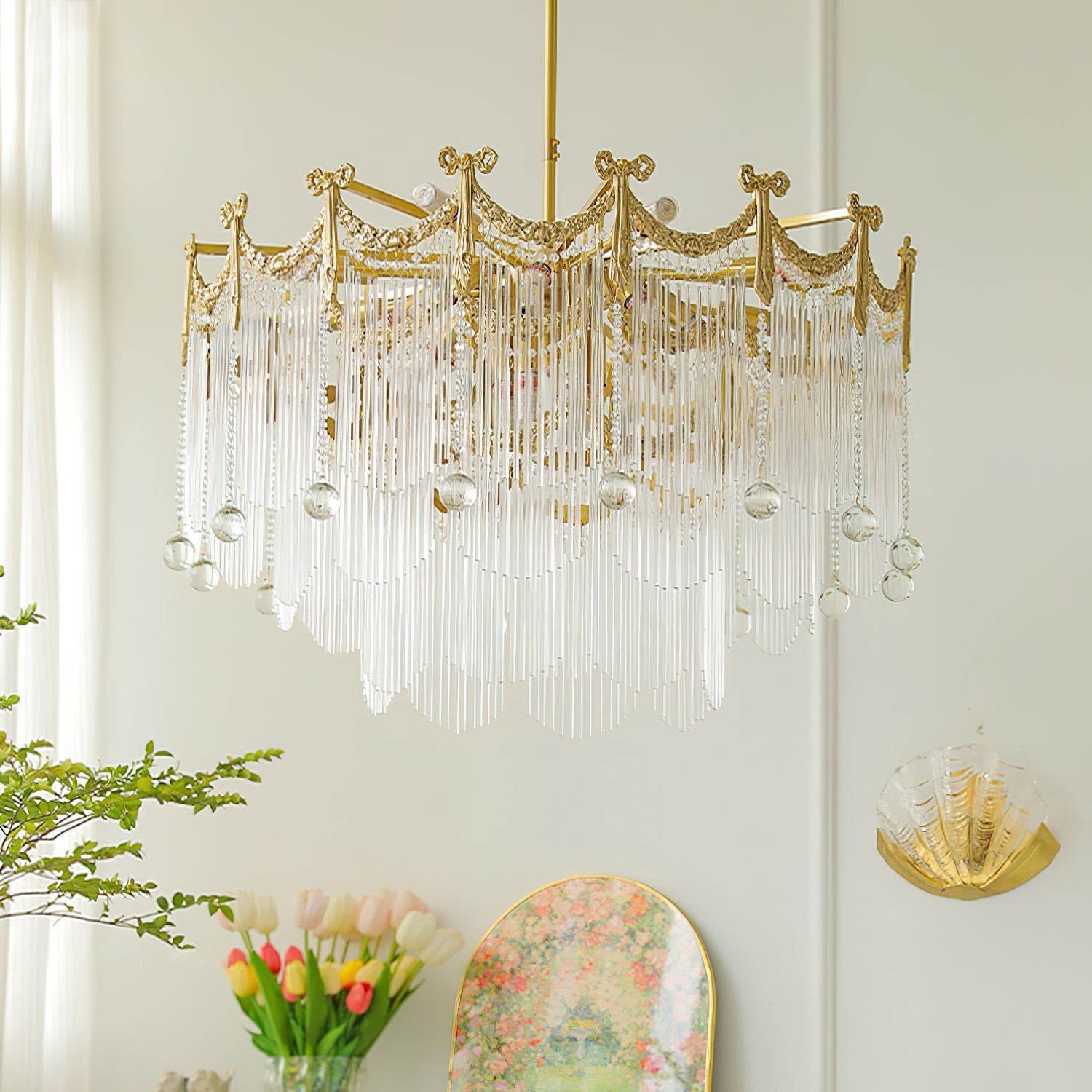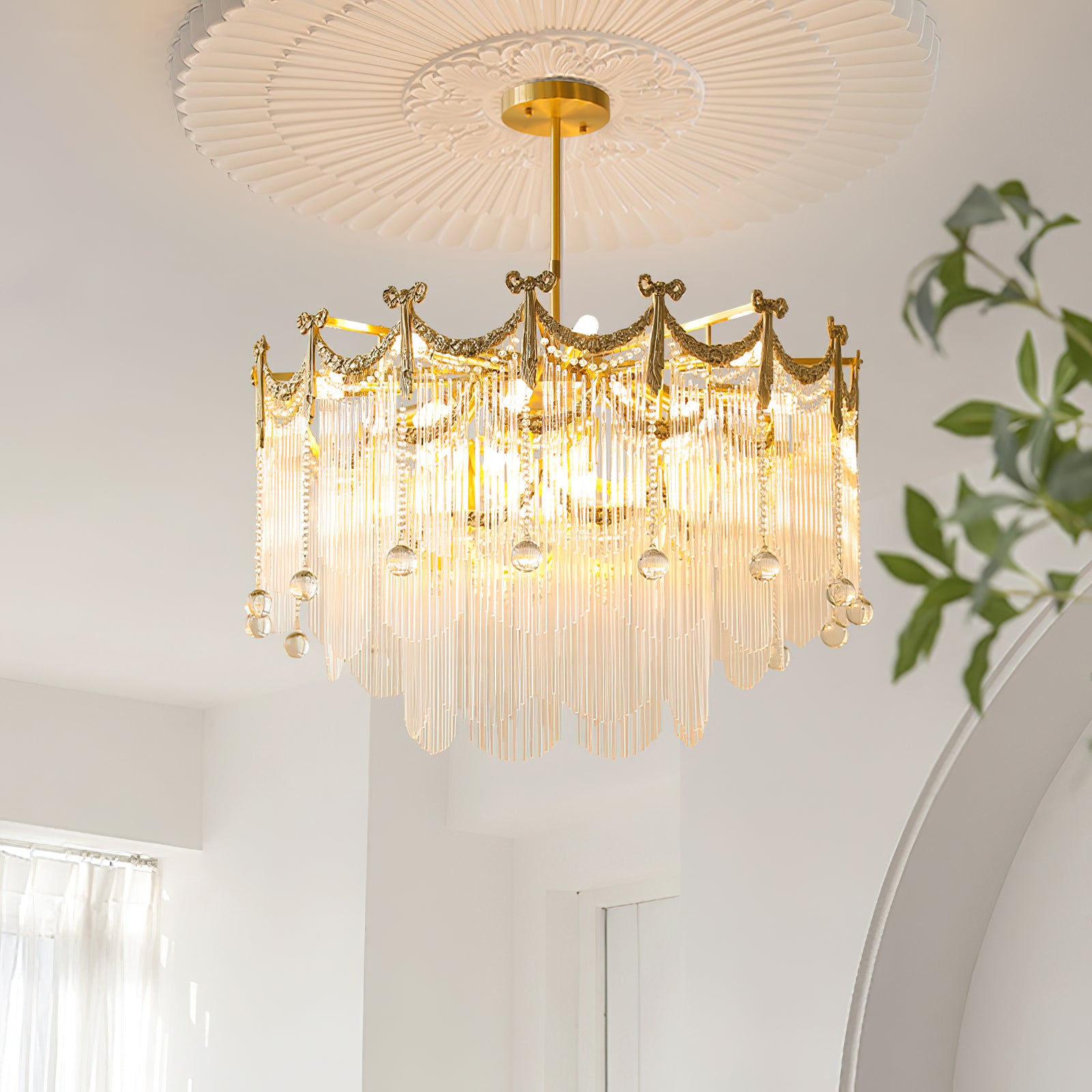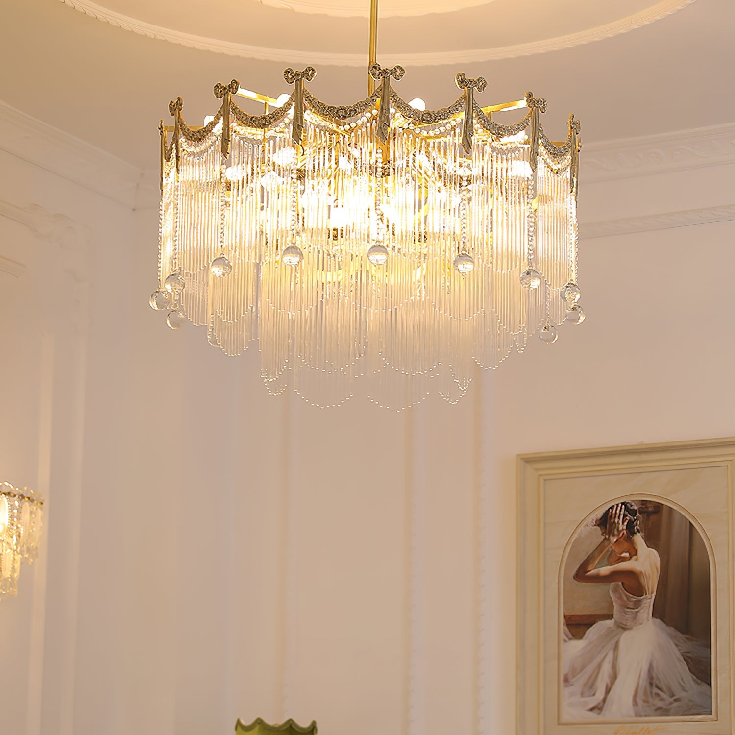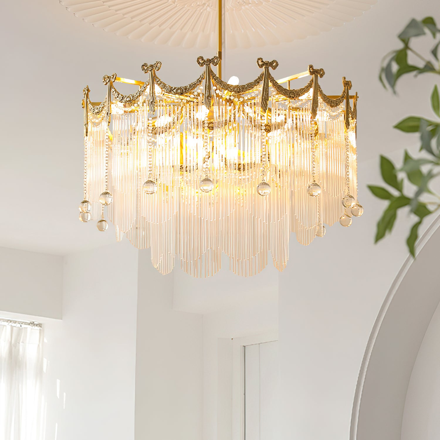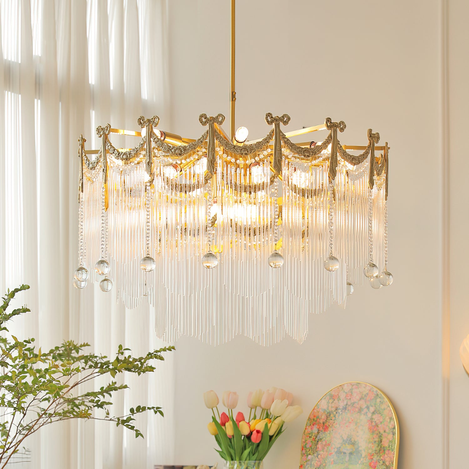 Transform your space with our Palace Water Drop Chandelier. This charming modern chandelier has an old-world beauty that adds a touch of elegance to any room. The crystal chain and round beads create a warm and romantic atmosphere, creating a chic ambiance at the flick of a switch. This chandelier will enhance the style of your home, perfect for the foyer, dining room, living room, and bedroom.