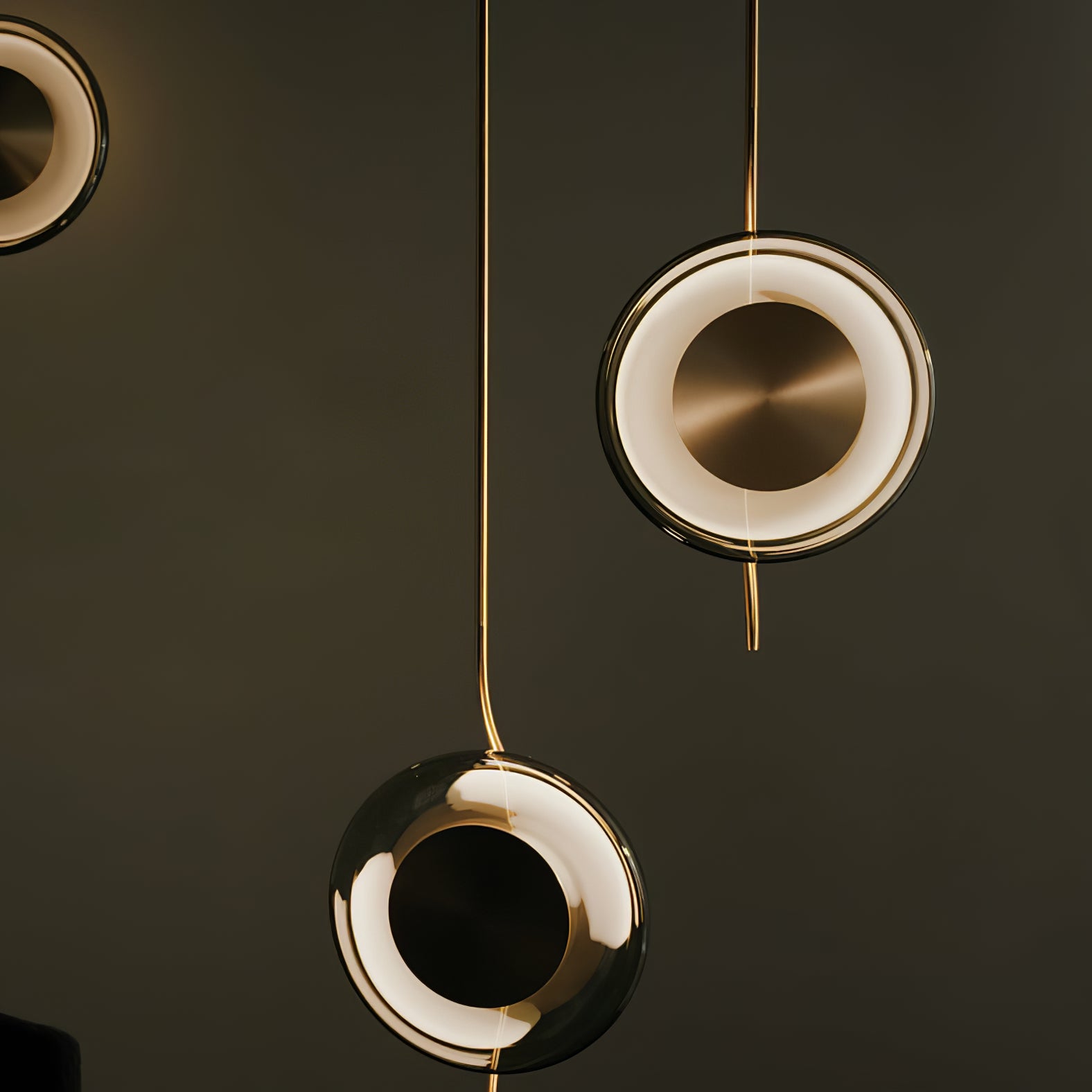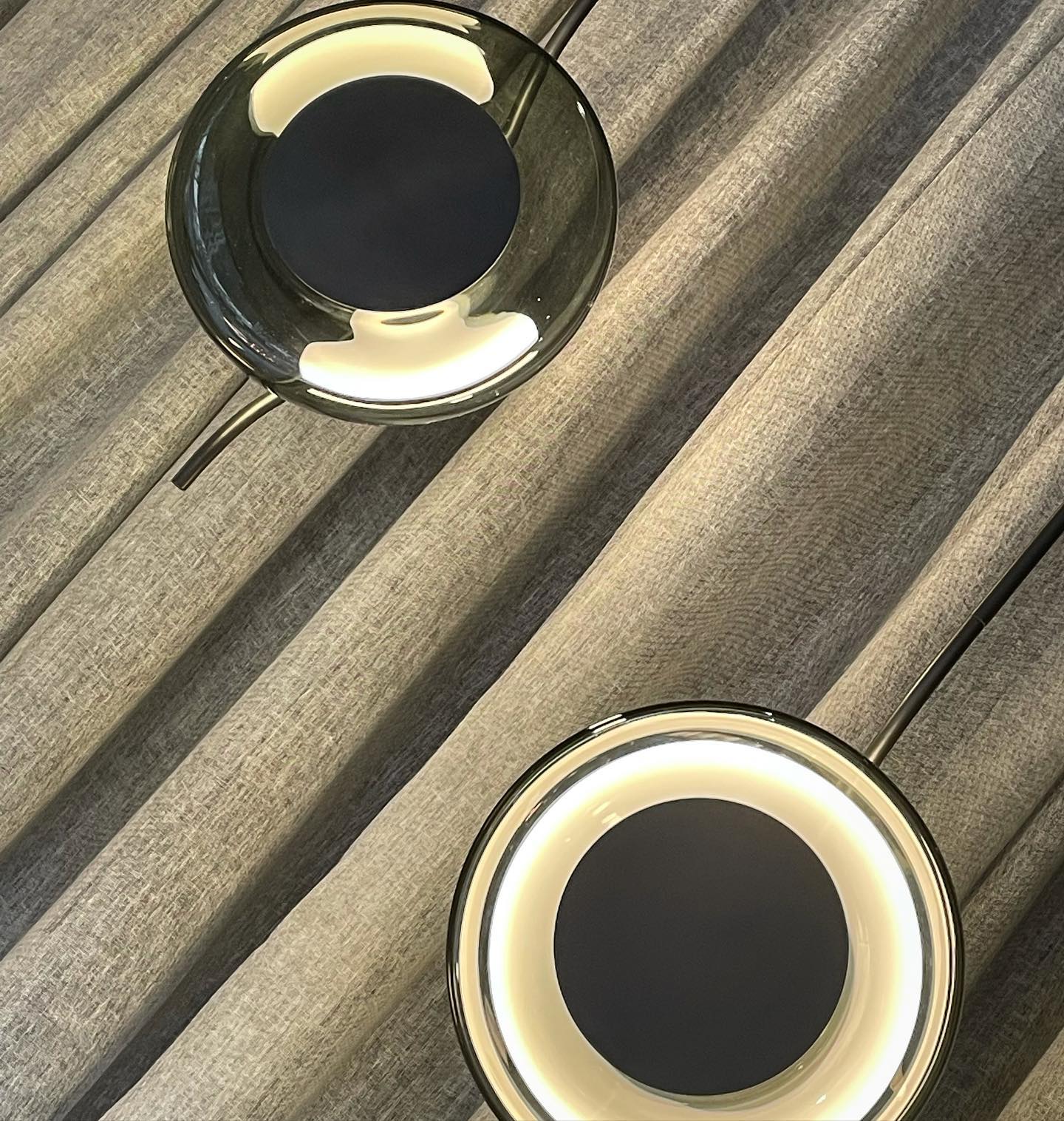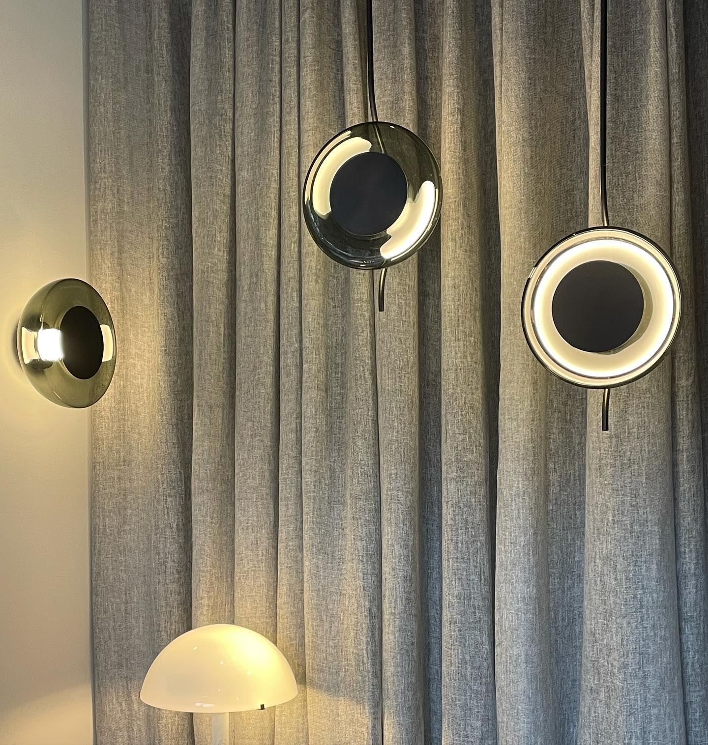 Balance and refinement are the key elements of the pendulum collection, inspired by the timepiece, with its mesmerizing and hypnotic qualities. The pendulum collection emanates light, which appears to oscillate in concentric bands from the light source, encased and diffused by the mouth-blown, curved glass.