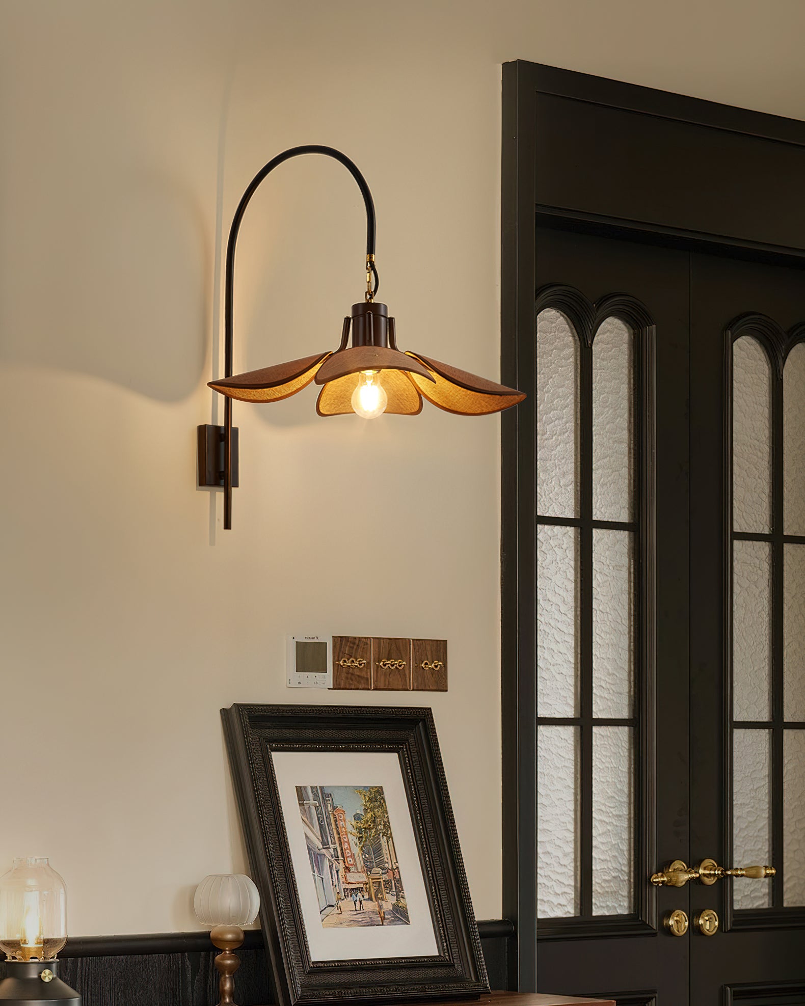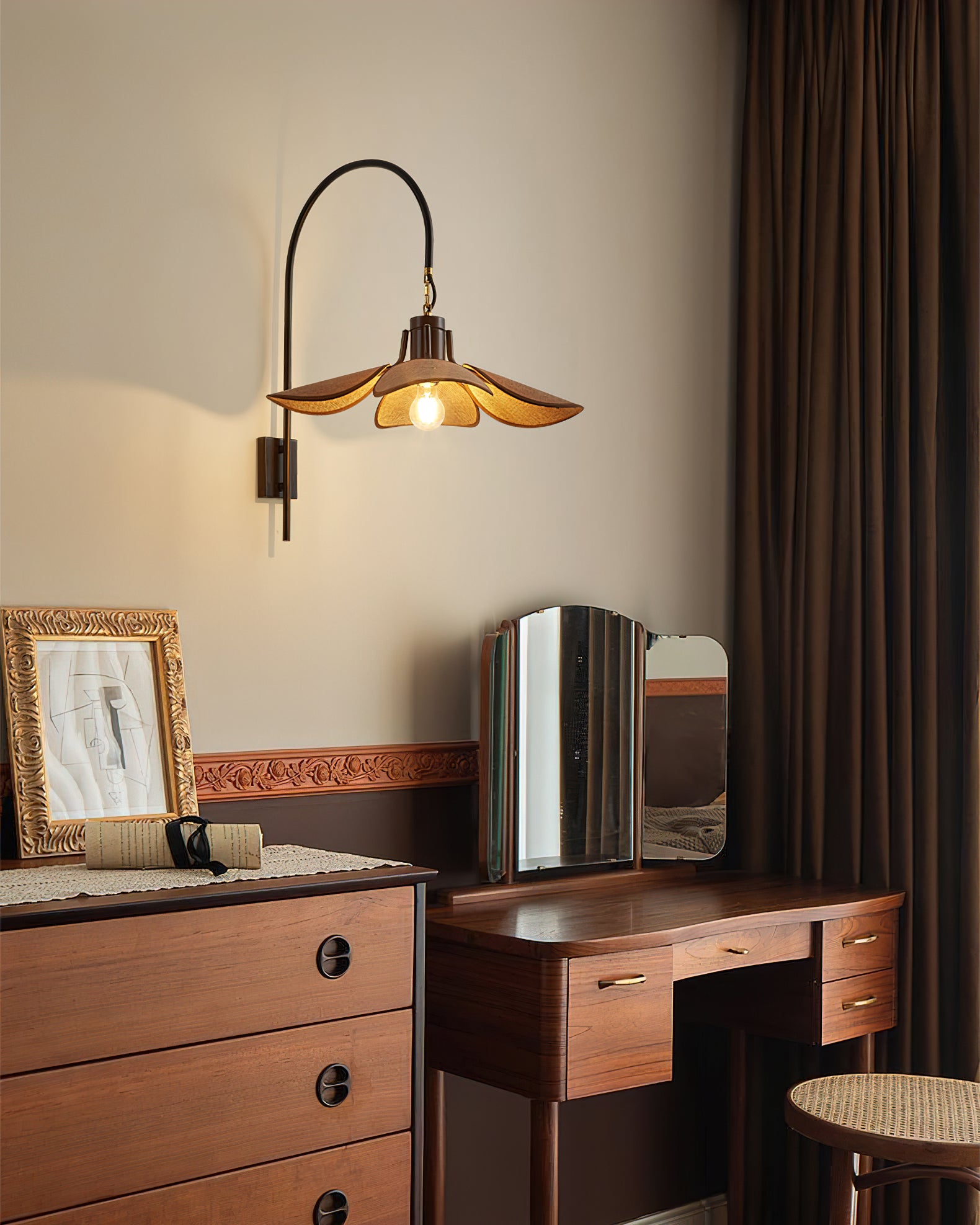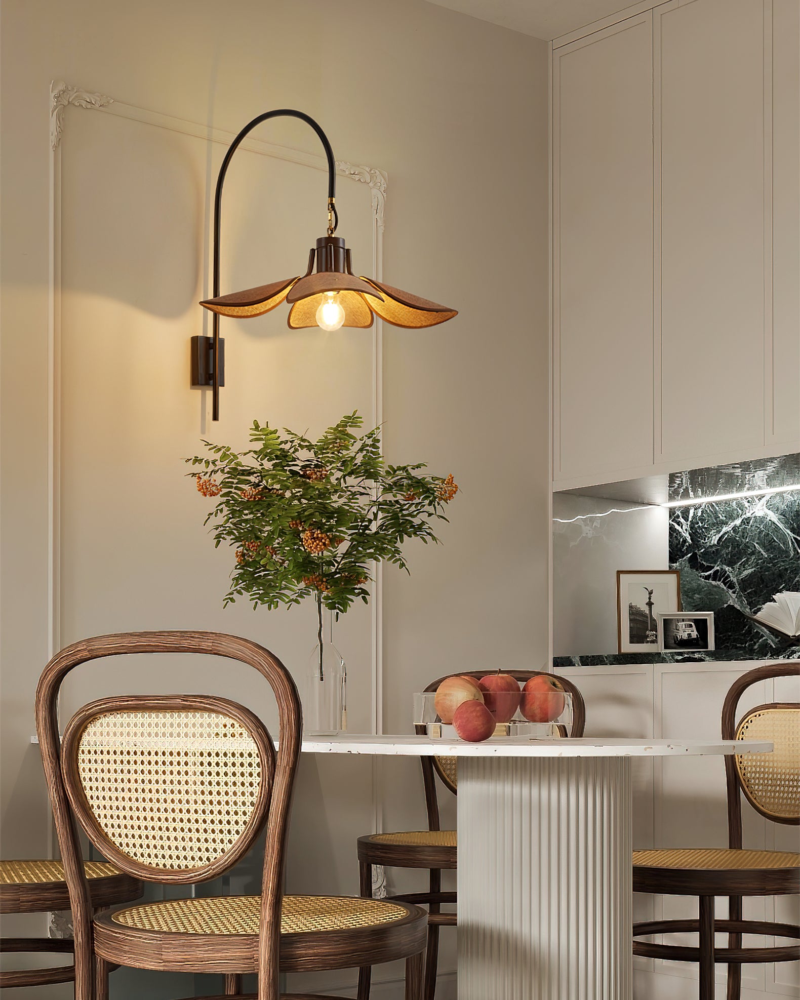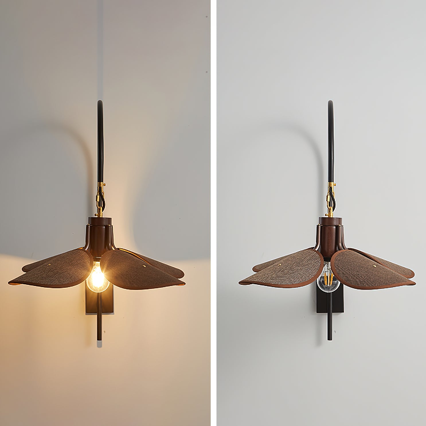 Elevate your home decor with the Petal Bloom Wall Lamp from Mooijane. With its delicate chestnut-inspired design, this lamp brings a touch of vintage elegance to any room. The soft fabric shade and intricate floral details add warmth and sophistication, making it the perfect addition to your space.