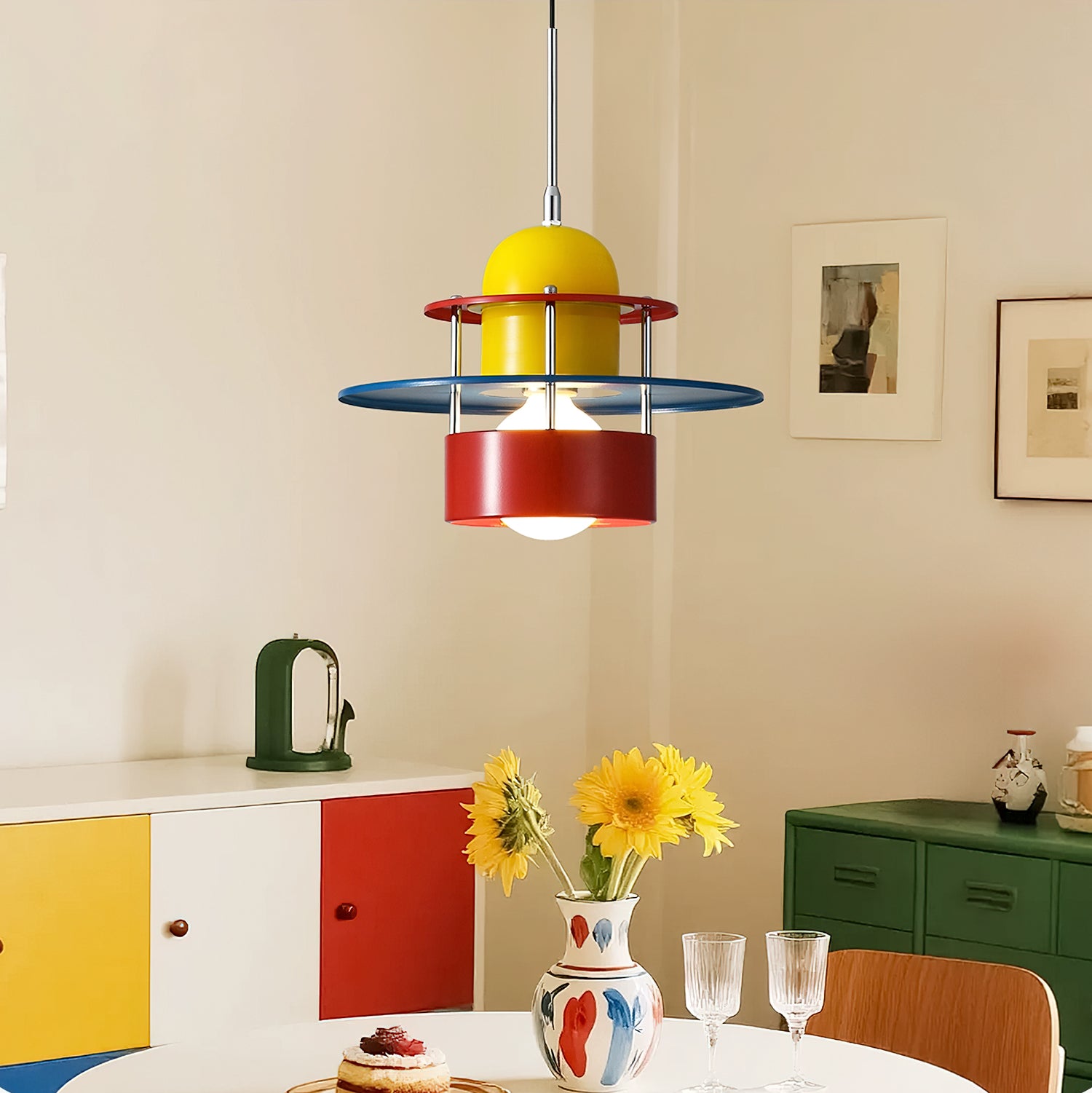 The Phillip Pendant Lamp by Mooijane embodies bold Bauhaus-inspired design with its striking geometric form and vibrant color palette of red, yellow, and blue. Simple yet impactful, it provides both illumination and visual intrigue. Perfect for restaurants, art spaces, or modern homes, this pendant lamp infuses any setting with vitality and a unique artistic presence.