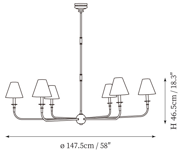 - 6-Lights Size: Dia 147.5cm x H 46.5cm / ∅ 58″ x H 18.3"