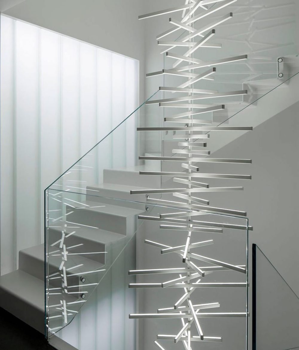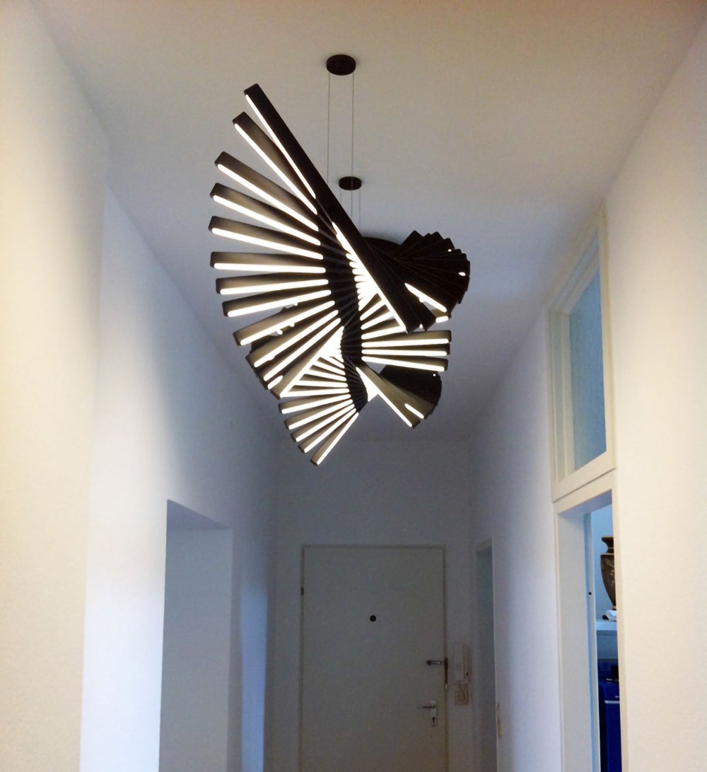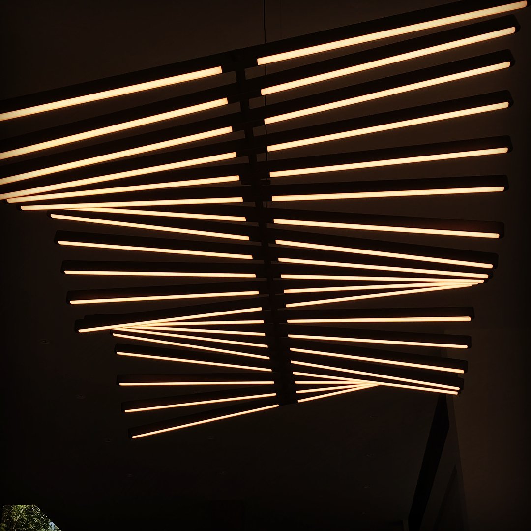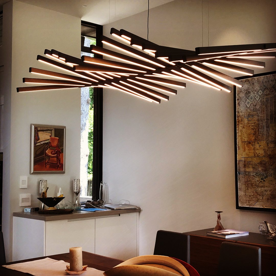 The Rhythm lamps are an Arik Levy design. The Rhythm collection is capable of adopting many configurations thanks to its rotation around a central axis which allows for free movement at an angle of its light sticks. This approach allows the Rhythm lamps to be configured into smooth waves or bespoke chaotic shapes.