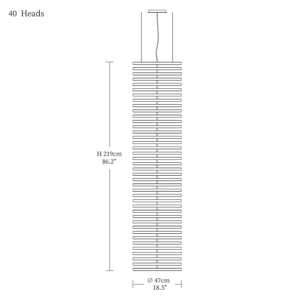- 40heads size: Dia 47cm x H 219cm / L 18.5″ x W 86.2″