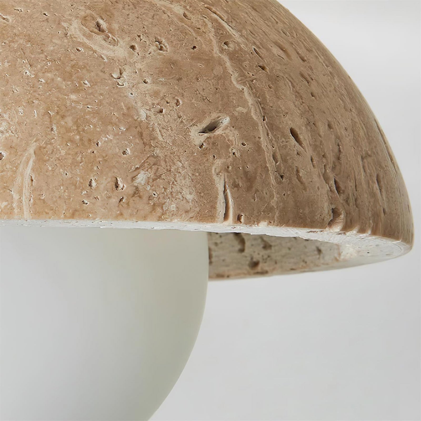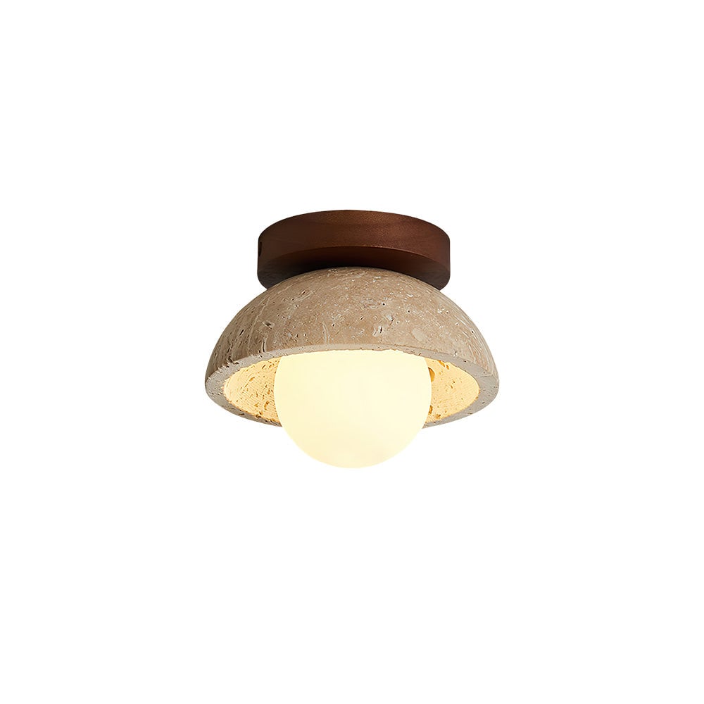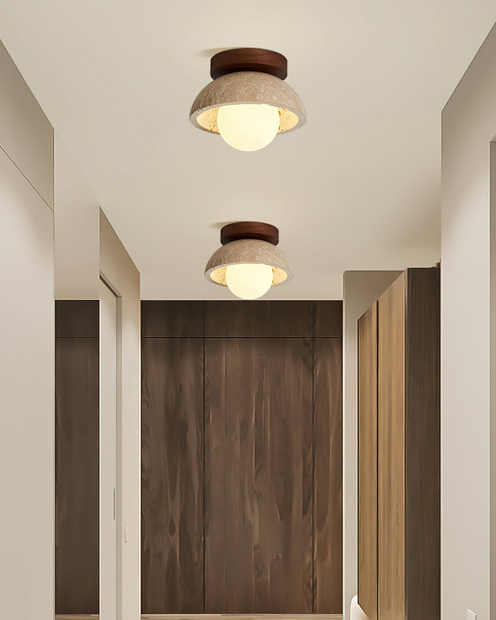 The Piedra Wood Ceiling Lamp combines natural materials with minimalist design for a warm, inviting aesthetic. This ceiling lamp features a travertine stone half-dome shade that showcases earthy textures, paired with a smooth wooden mount for an organic, rustic appeal. The soft, diffused light from the rounded glass diffuser creates a cozy ambiance, making it ideal for entryways, hallways, or intimate spaces. Its blend of wood and stone elements brings a touch of nature indoors, enhancing interiors with its understated elegance and warmth.