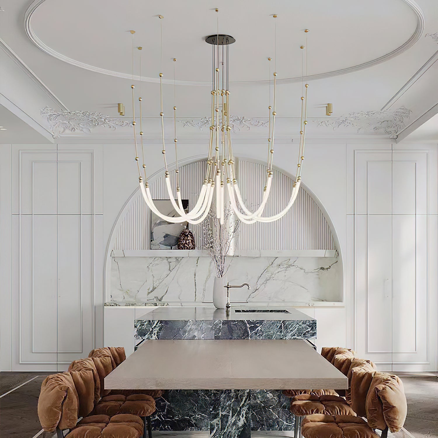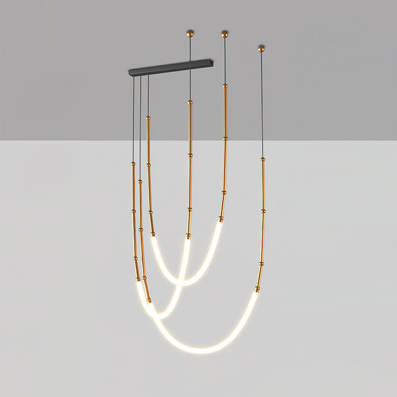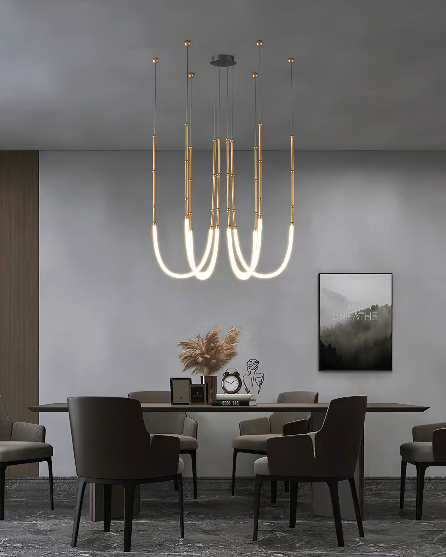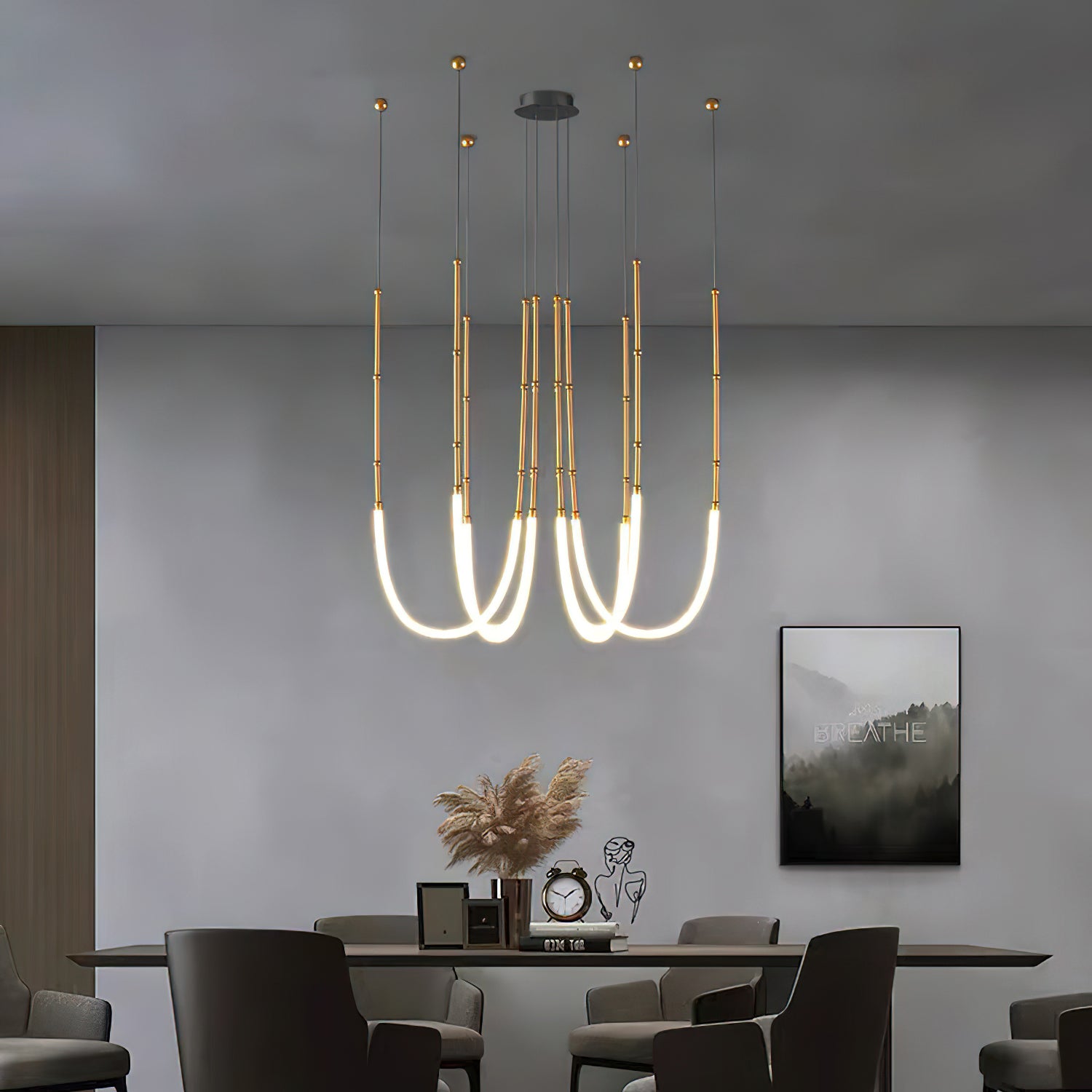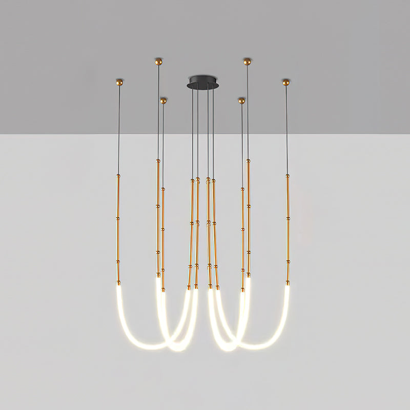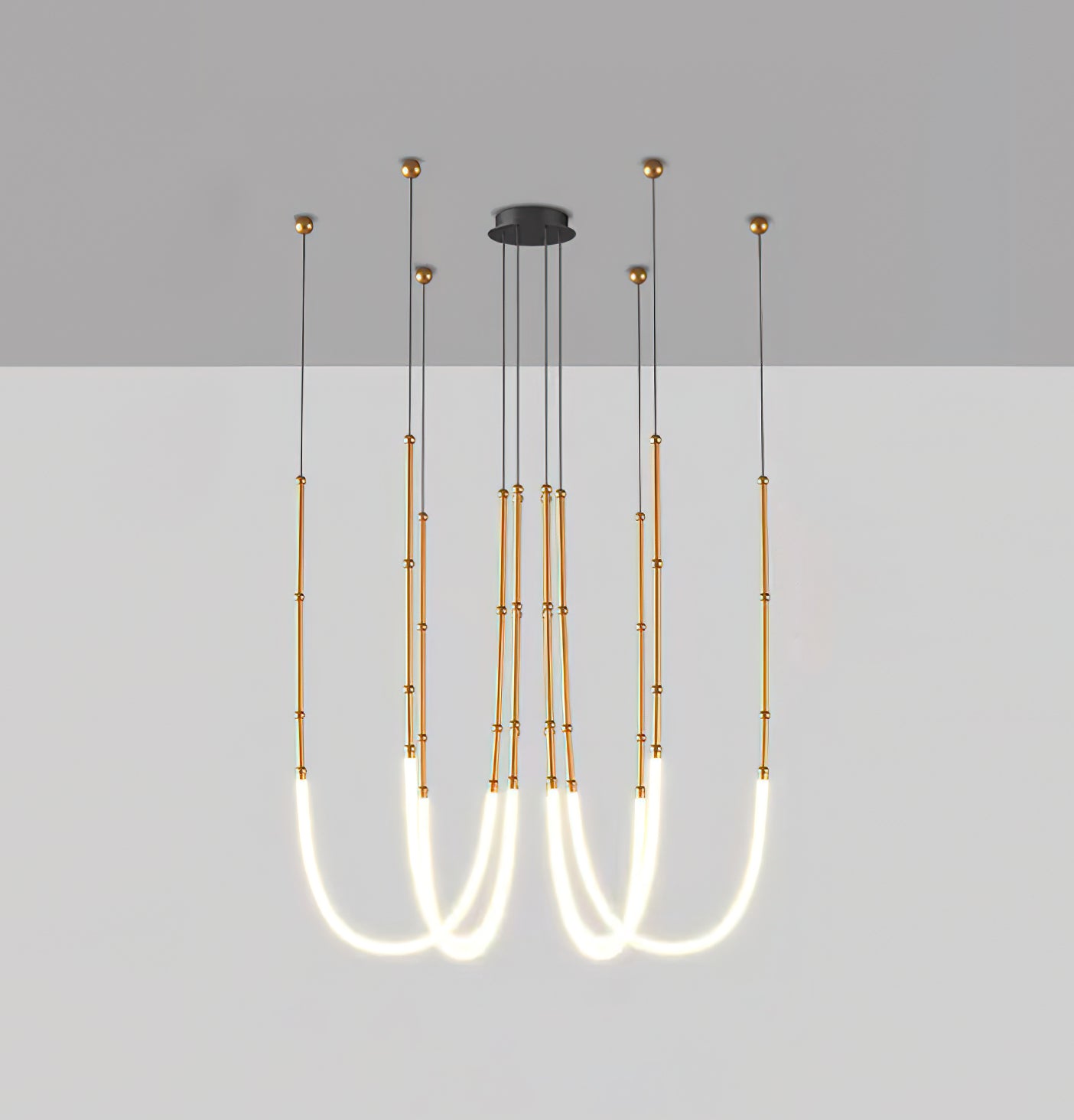 This Pierlas Chandelier by Mooijane is a modern, minimalist lamp that will add elegance and sophistication to any room. With its unique shape and gold finish, this chandelier creates a luxurious ambiance and upgrades your lighting to a sleek and modern design. Add a touch of glamour to your space with this eye-catching lamp.