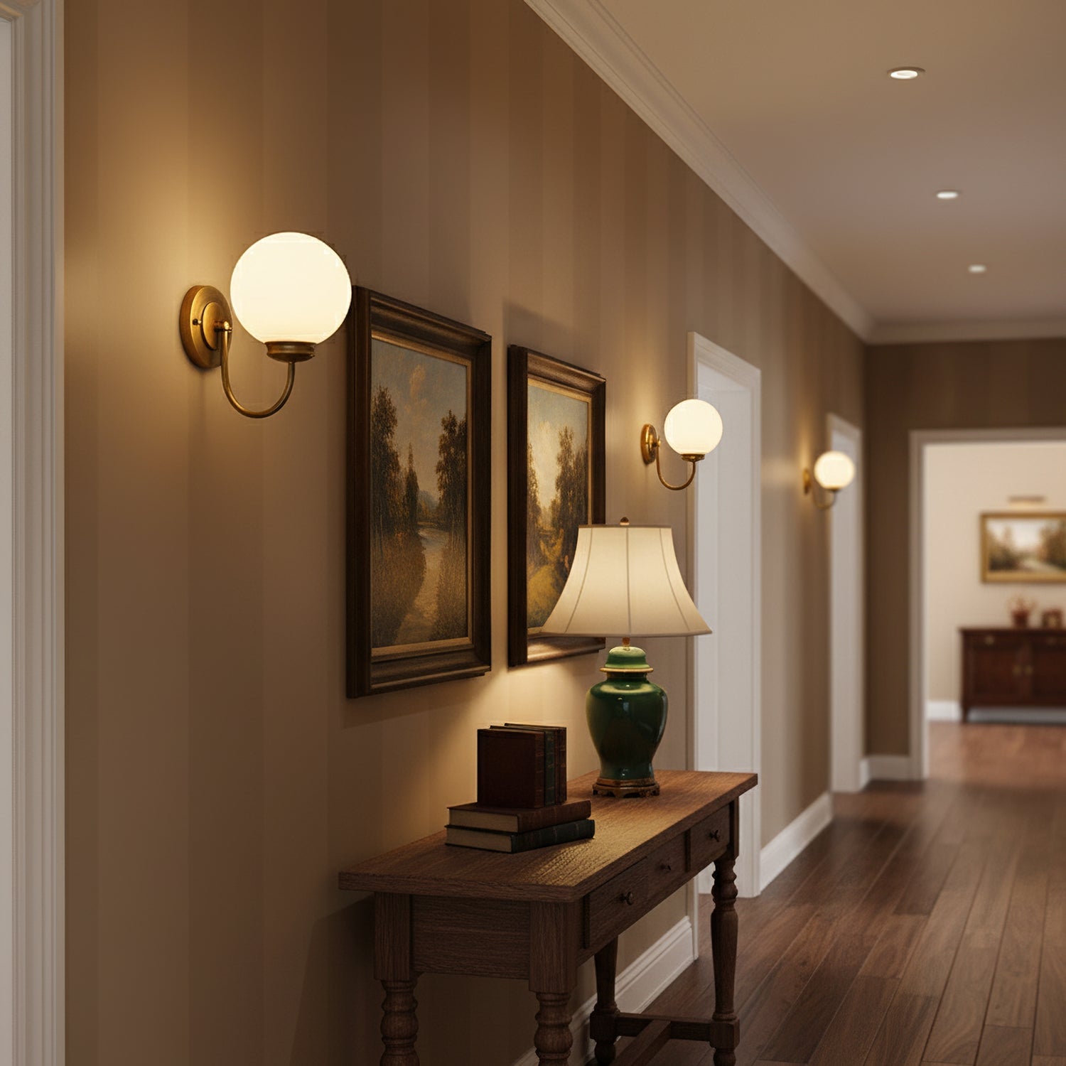 The Pittock Wall Lamp from Mooijane embodies timeless elegance with its clean lines and minimalist form. Crafted from brushed brass, it radiates a warm, vintage sheen, beautifully complemented by a frosted glass globe that casts a soft, moonlike glow. The curved arm and round backplate create a sense of balance and refinement, making it ideal for bedrooms, hallways, or living areas.