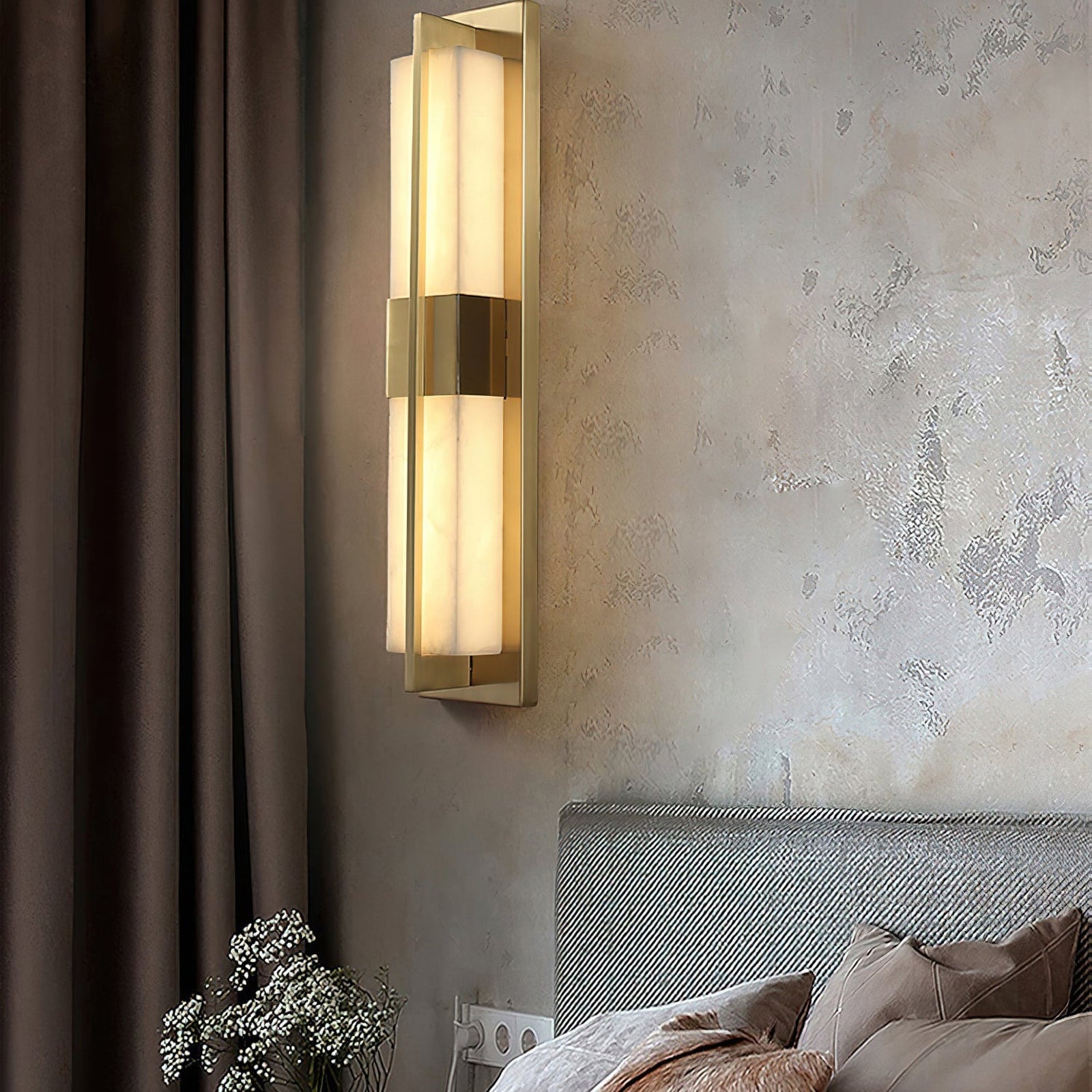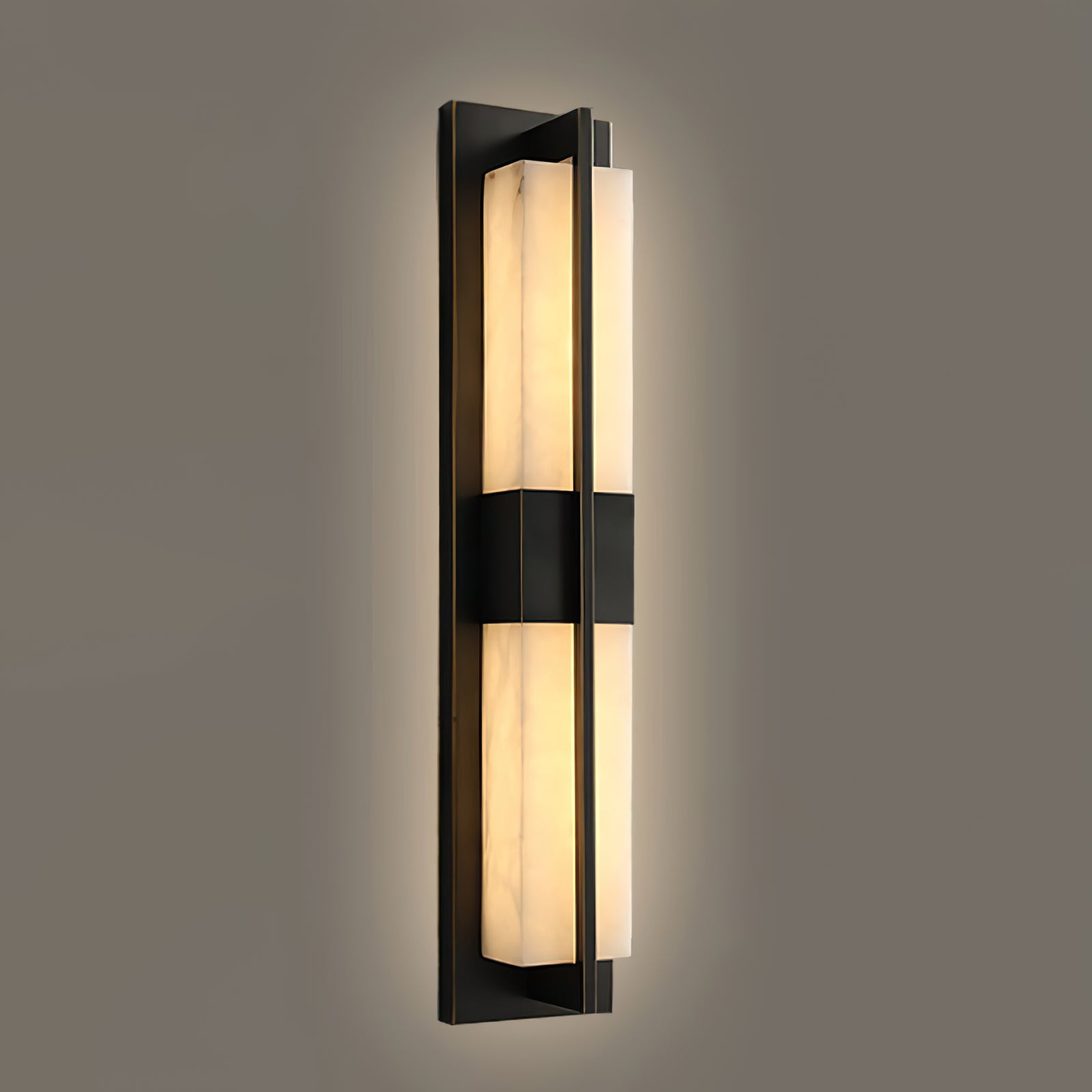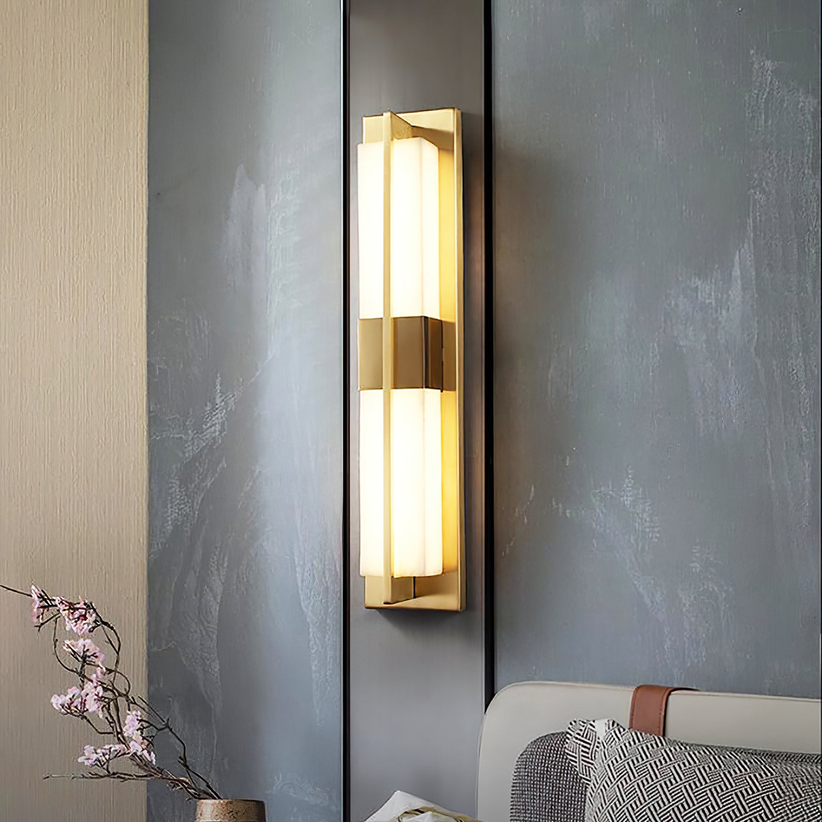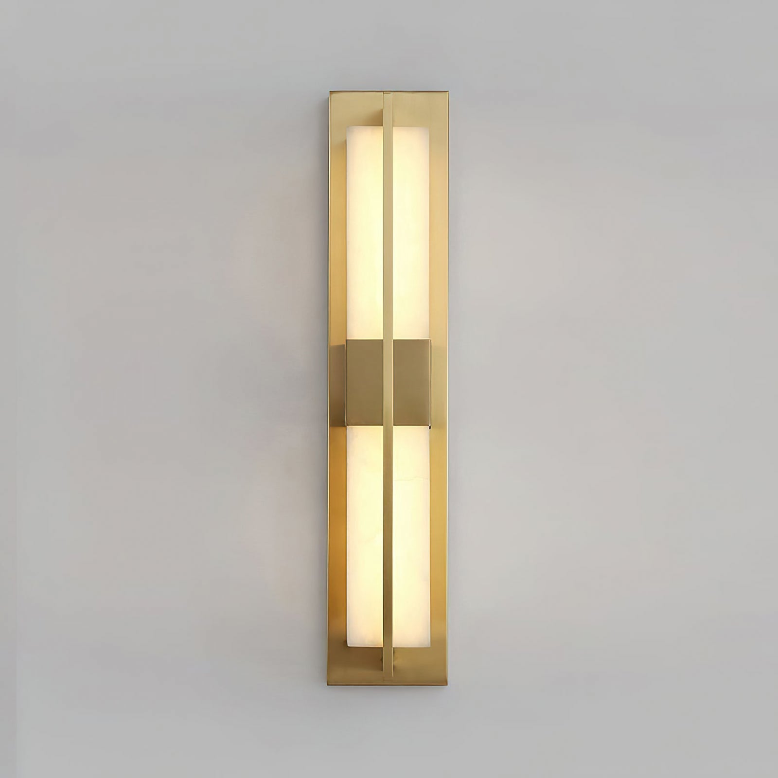 The Polished Brass Lumina Outdoor Wall Sconce exudes elegance and sophistication with its refined vertical design. Featuring a polished brass frame encased in a diffused alabaster or frosted glass panel, this fixture emits a warm, cozy glow. A central brass accent adds visual interest, evenly distributes light, and enhances the fixture's architectural appeal. Its sleek lines and luxurious finish make it a great addition to modern or classic outdoor settings, providing both practical lighting and a stylish statement. Perfect for an entryway, living room, or bedroom, this wall sconce adds a touch of sophisticated beauty to any space.