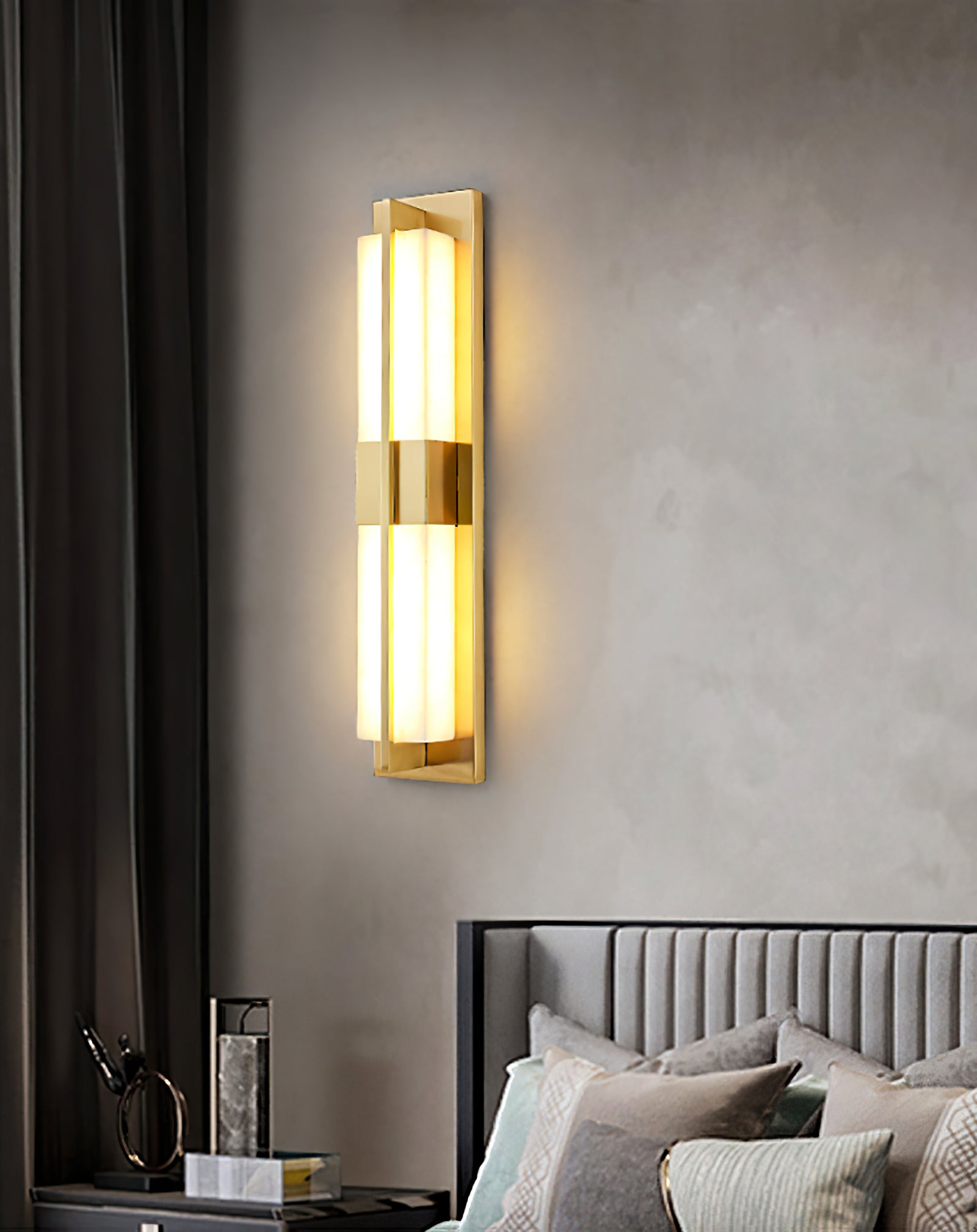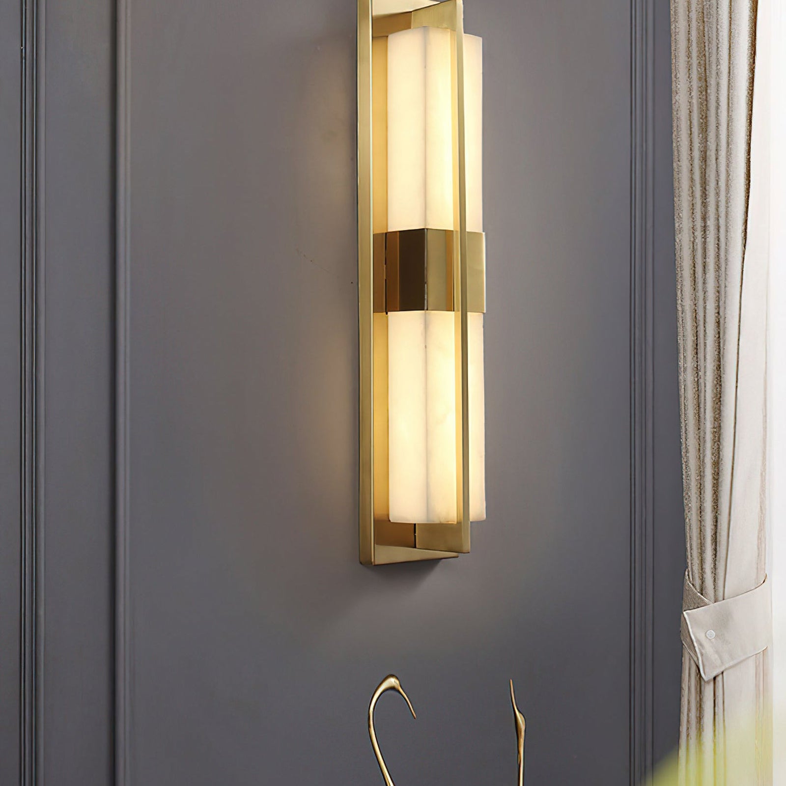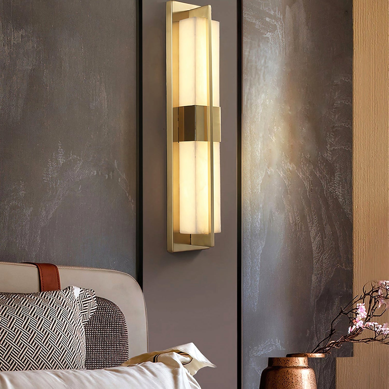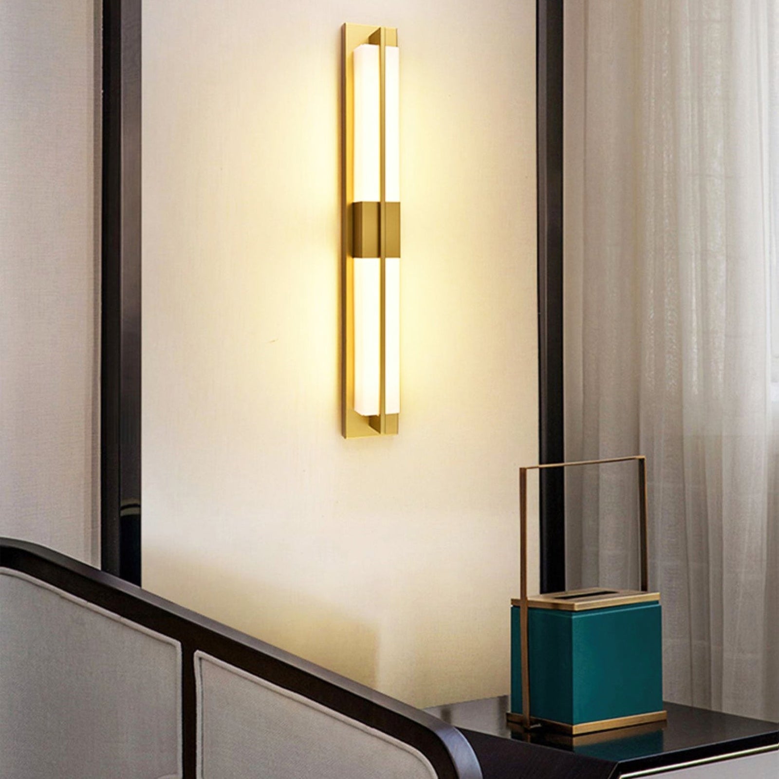 The Polished Brass Lumina Outdoor Wall Sconce exudes elegance and sophistication with its refined vertical design. Featuring a polished brass frame encased in a diffused alabaster or frosted glass panel, this fixture emits a warm, cozy glow. A central brass accent adds visual interest, evenly distributes light, and enhances the fixture's architectural appeal. Its sleek lines and luxurious finish make it a great addition to modern or classic outdoor settings, providing both practical lighting and a stylish statement. Perfect for an entryway, living room, or bedroom, this wall sconce adds a touch of sophisticated beauty to any space.