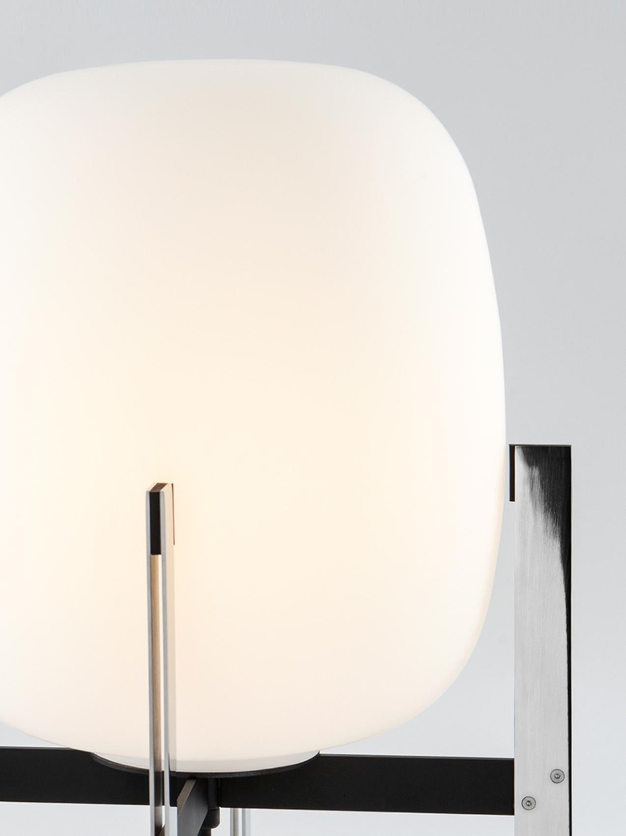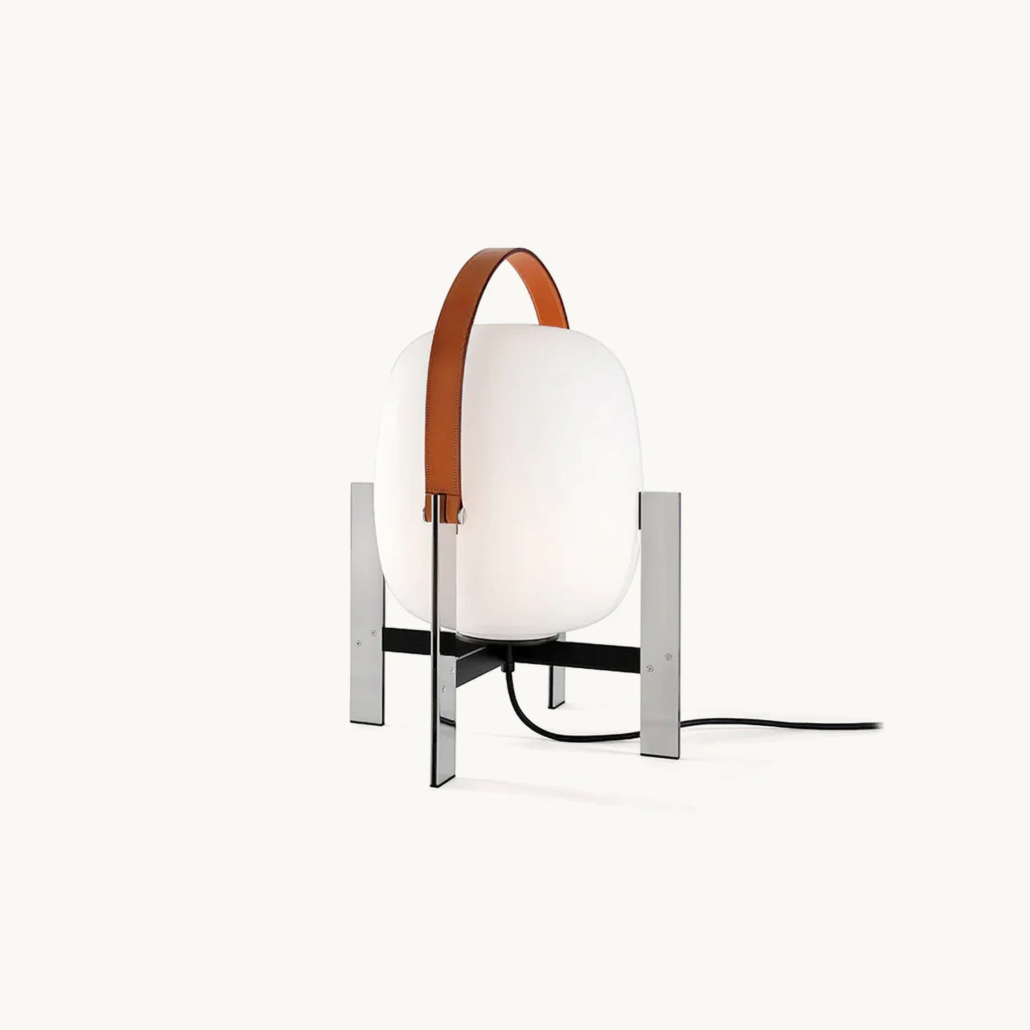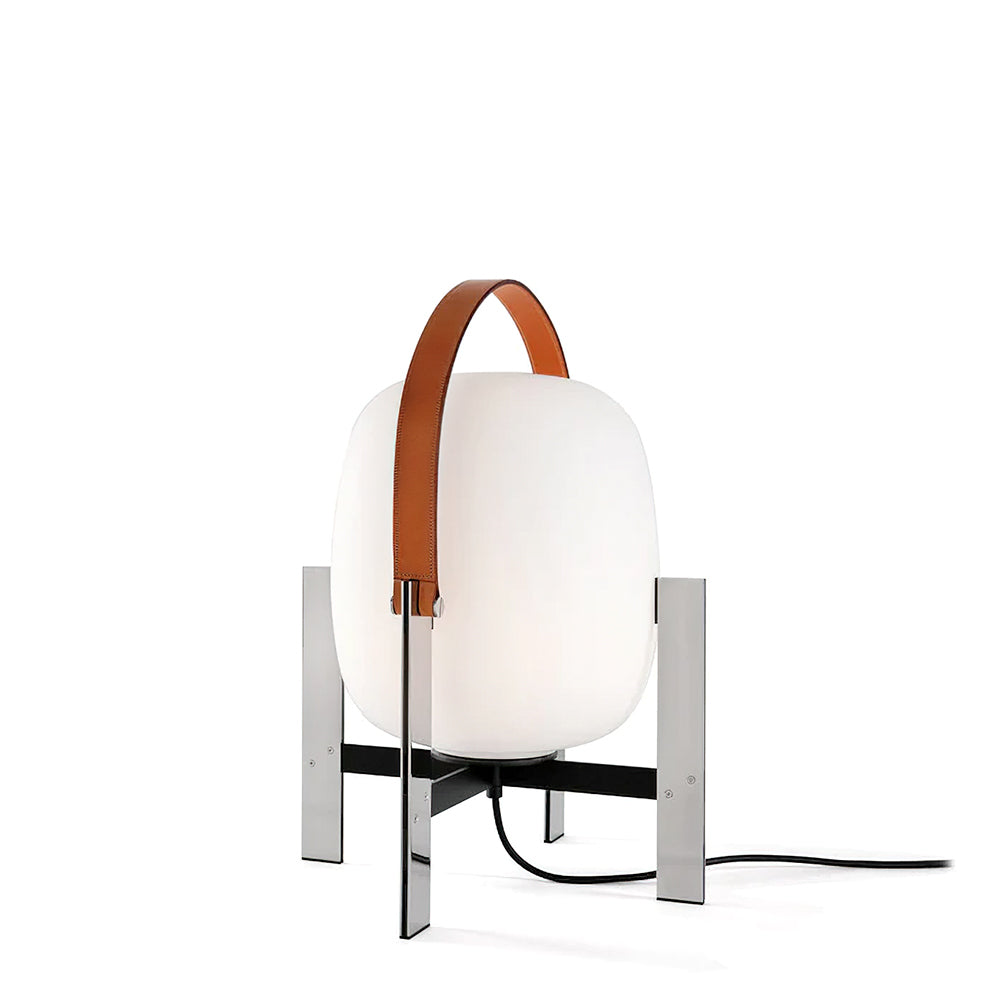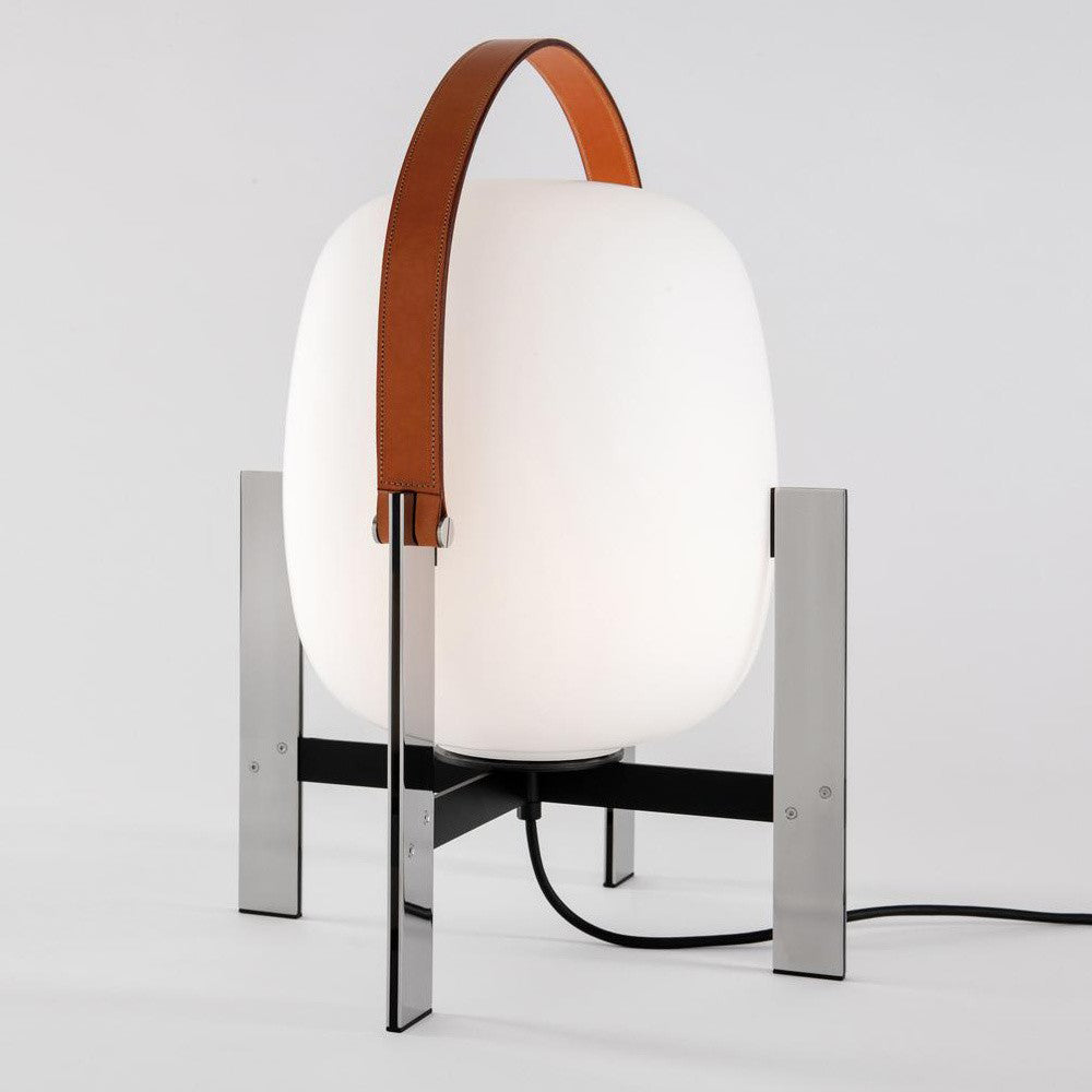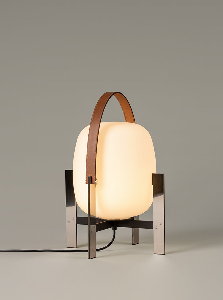 Learned to master the expressiveness of steel by giving it a fragile heart. Strength and emotion, angle and curve. In a duel between strength and fragility, Portable Lantern Table Lamp comes with or without a soft leather handle, contrasting with the well-aimed severity of the brackets that gently hold the delicate opal globe.