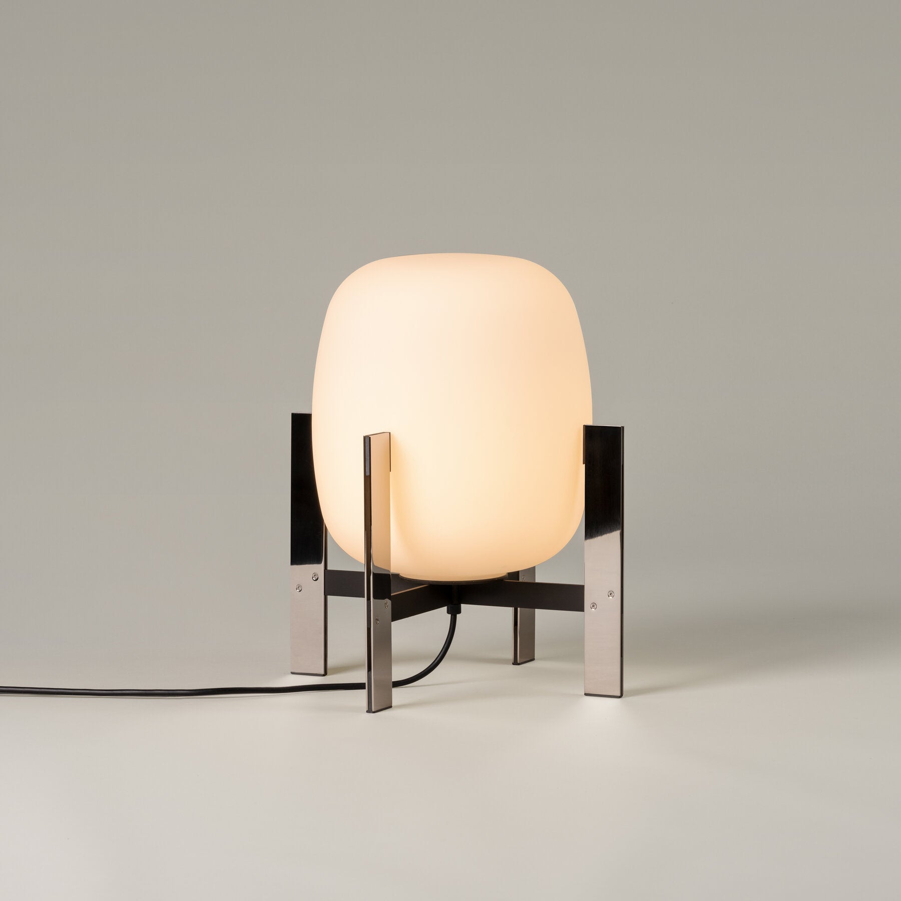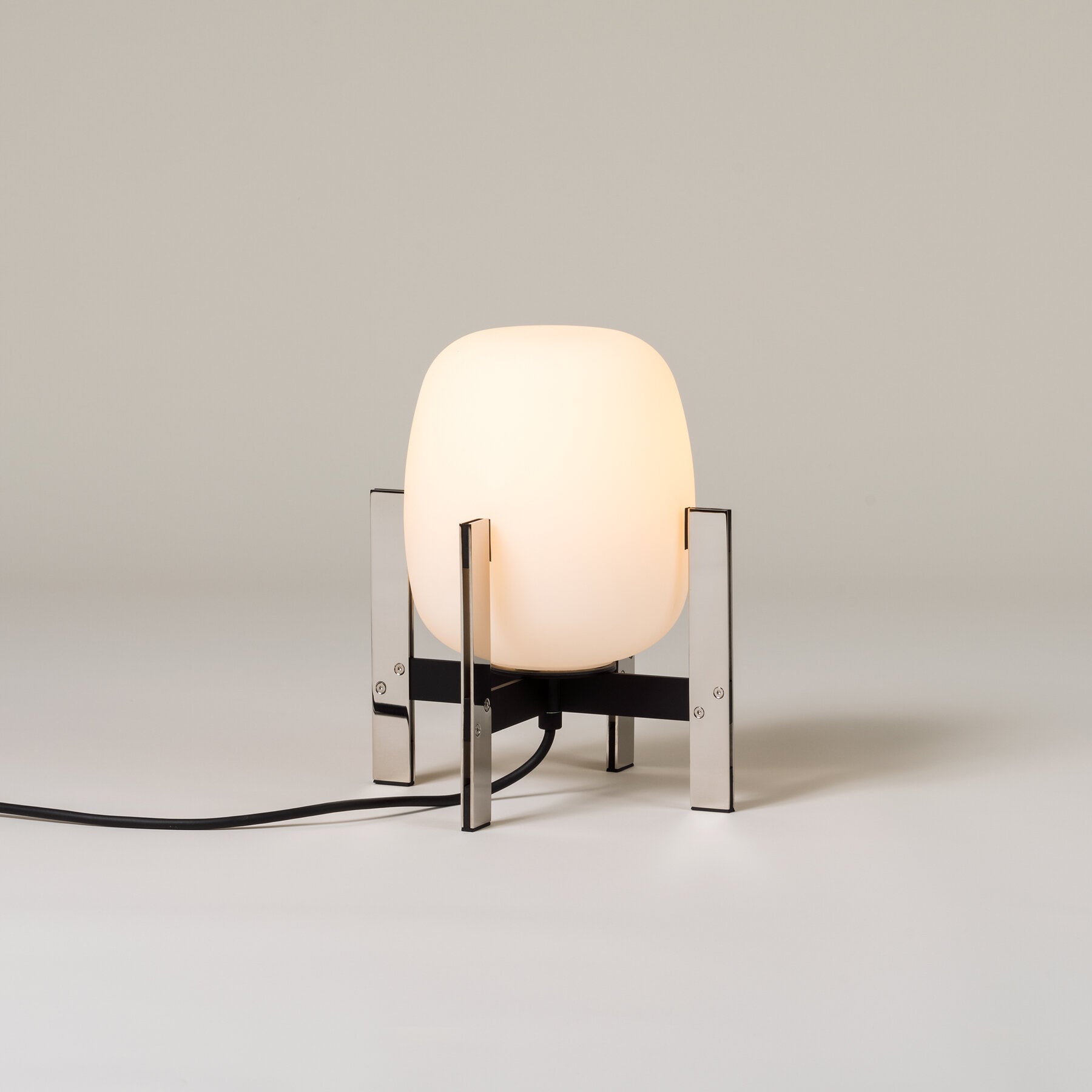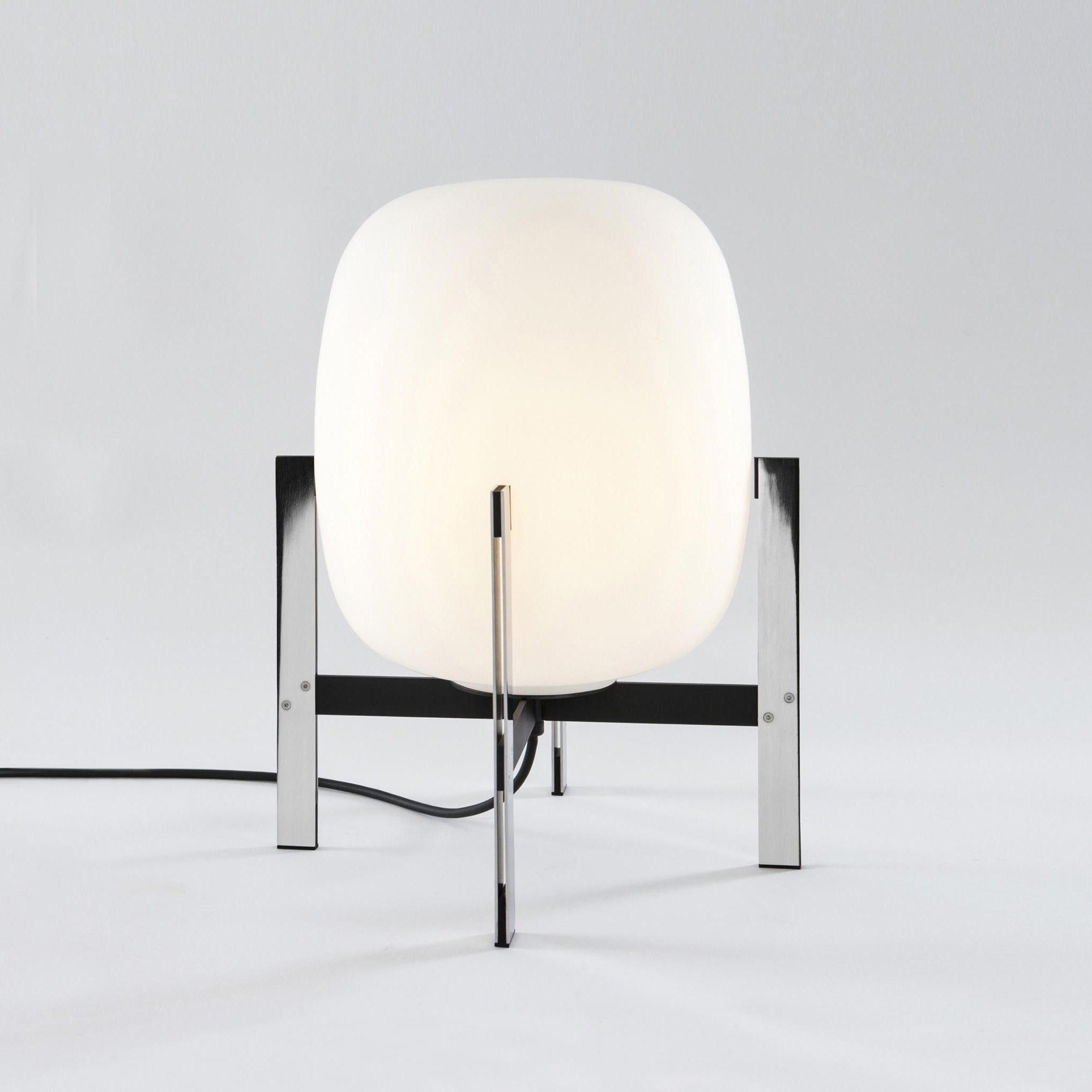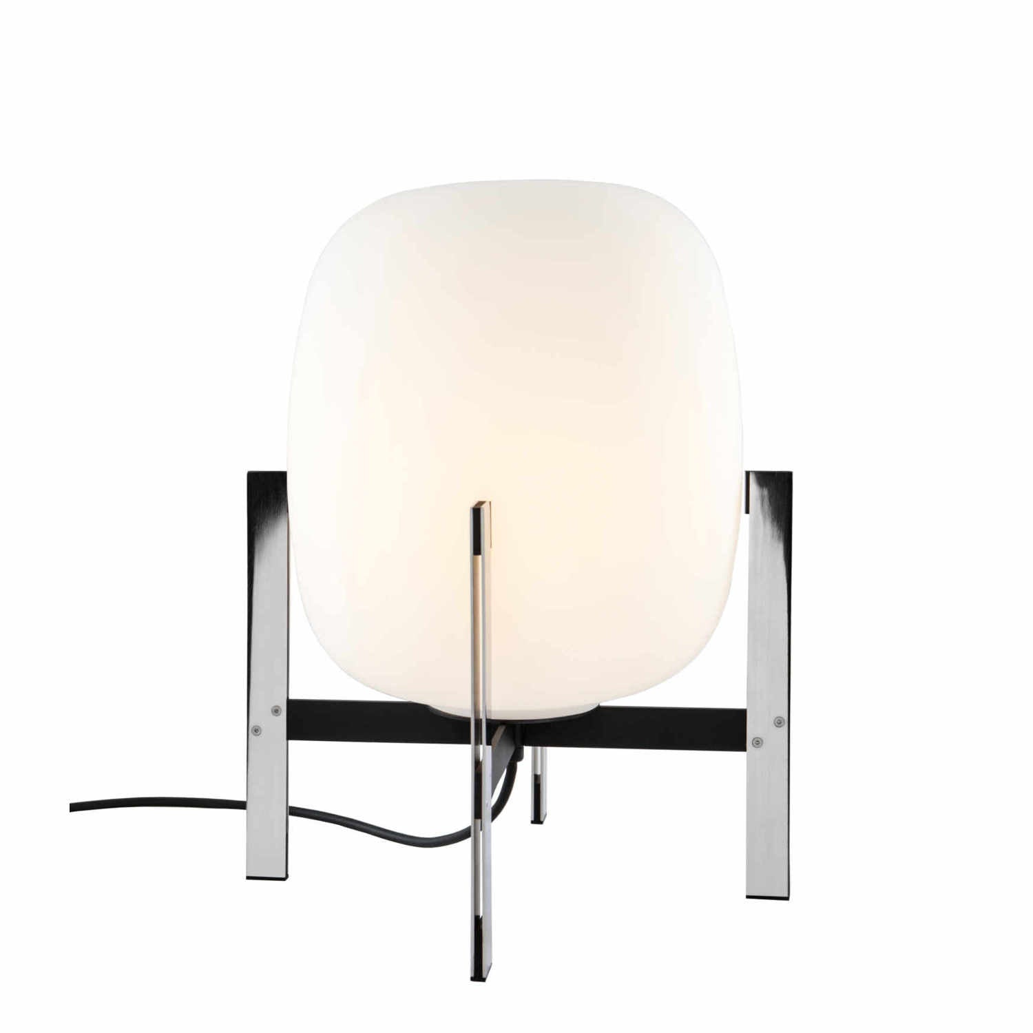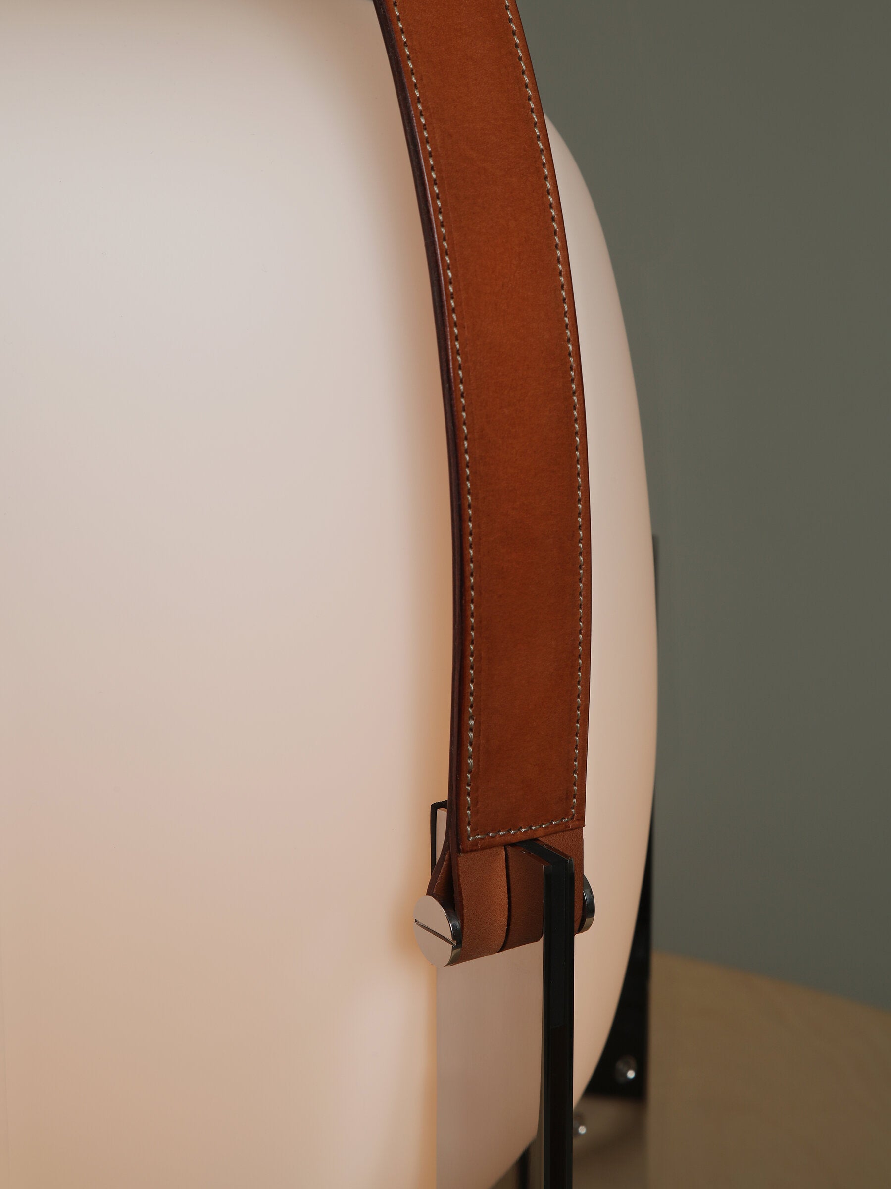 Learned to master the expressiveness of steel by giving it a fragile heart. Strength and emotion, angle and curve. In a duel between strength and fragility, Portable Lantern Table Lamp comes with or without a soft leather handle, contrasting with the well-aimed severity of the brackets that gently hold the delicate opal globe.