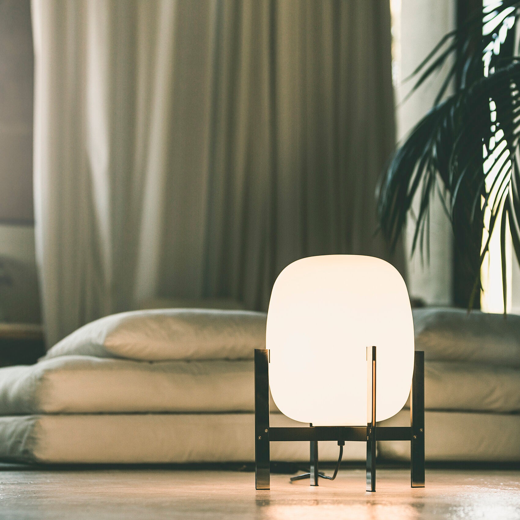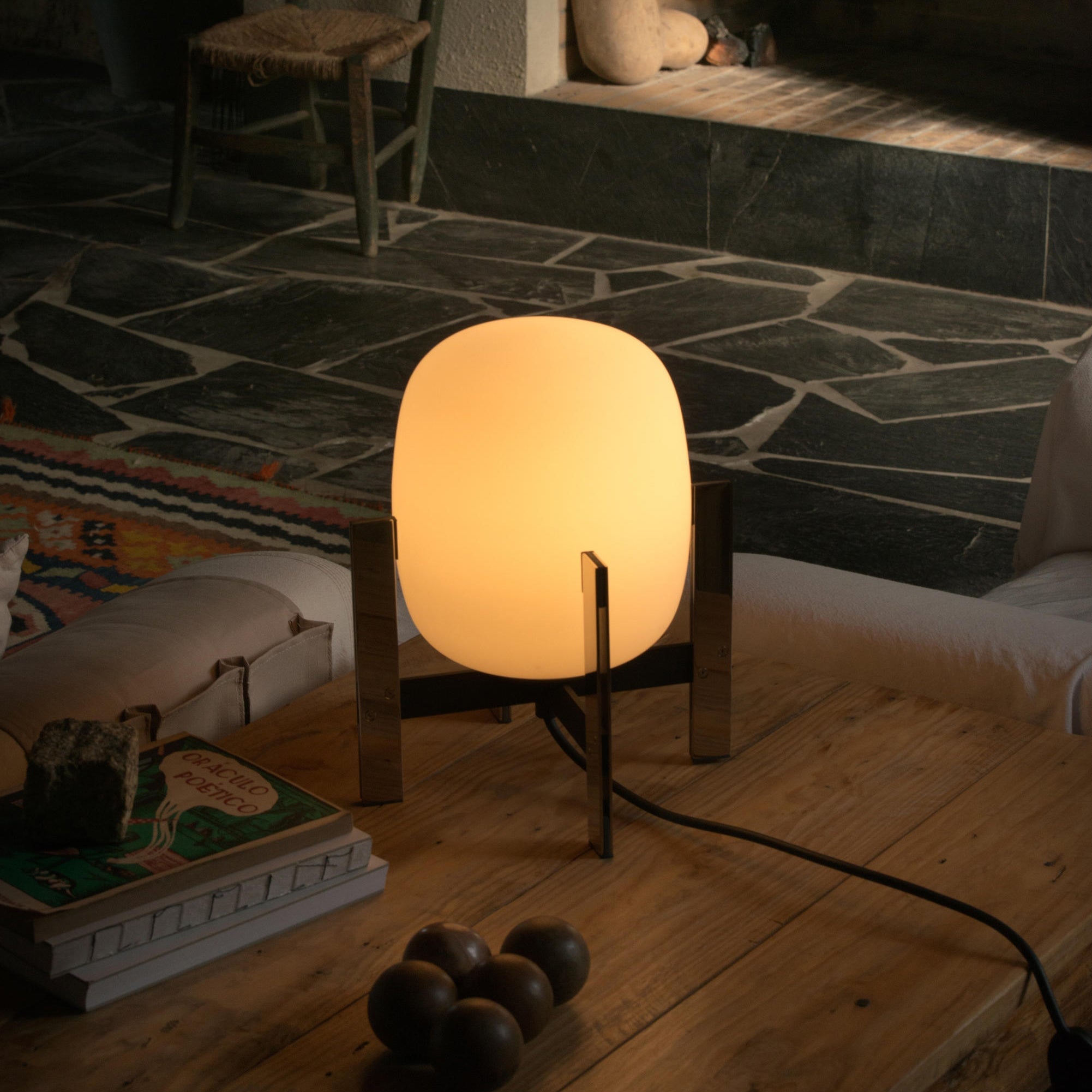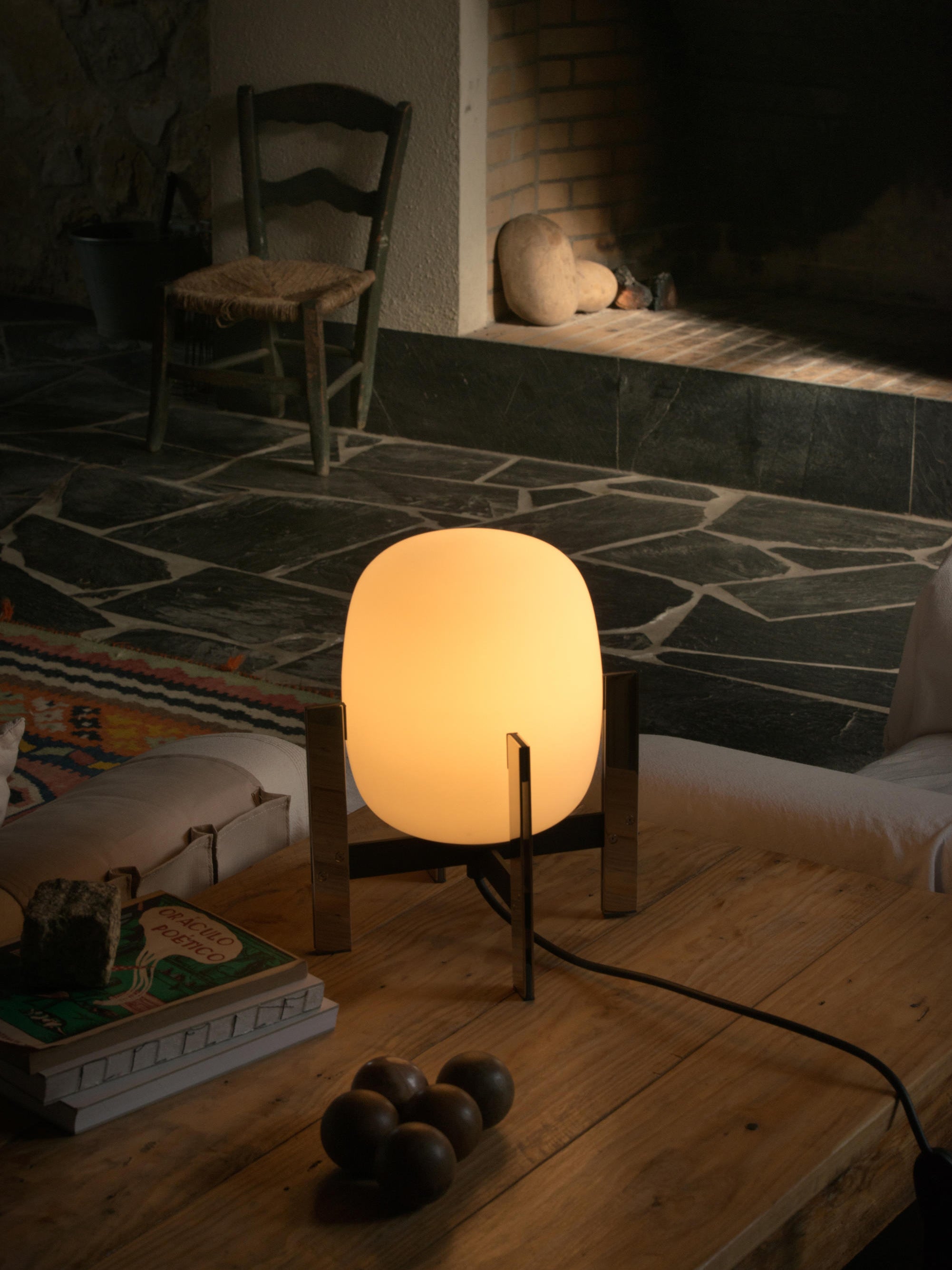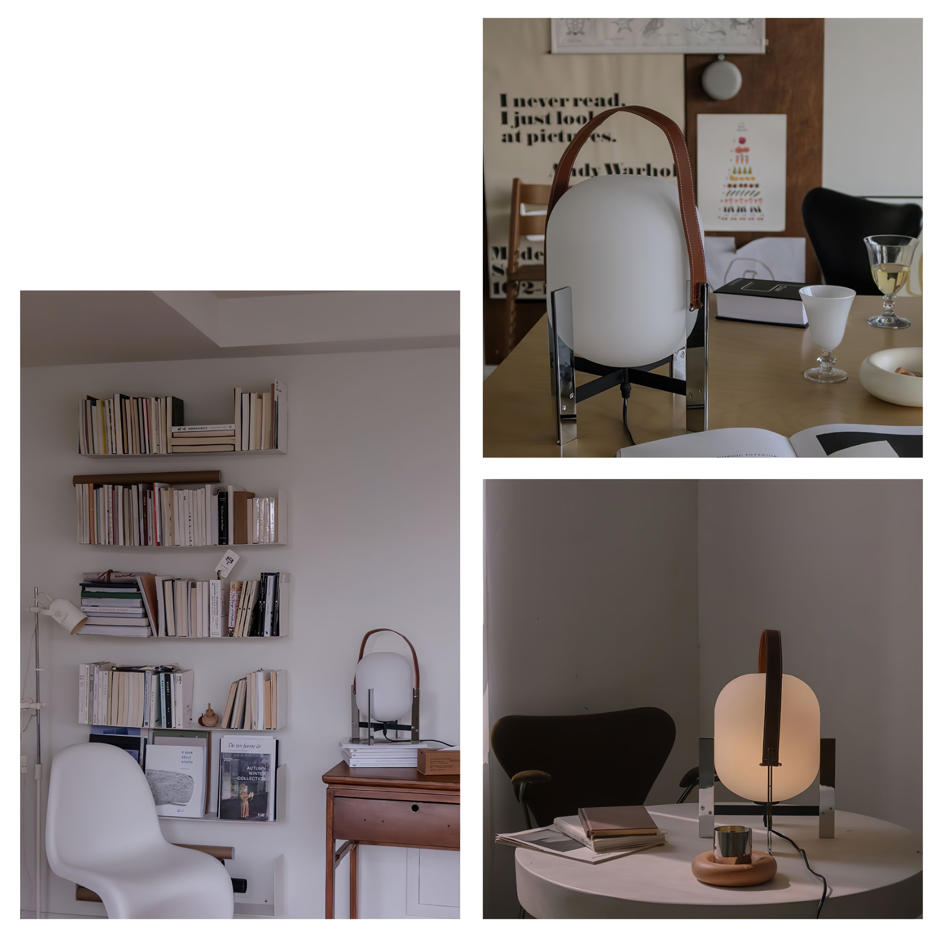 Learned to master the expressiveness of steel by giving it a fragile heart. Strength and emotion, angle and curve. In a duel between strength and fragility, Portable Lantern Table Lamp comes with or without a soft leather handle, contrasting with the well-aimed severity of the brackets that gently hold the delicate opal globe.