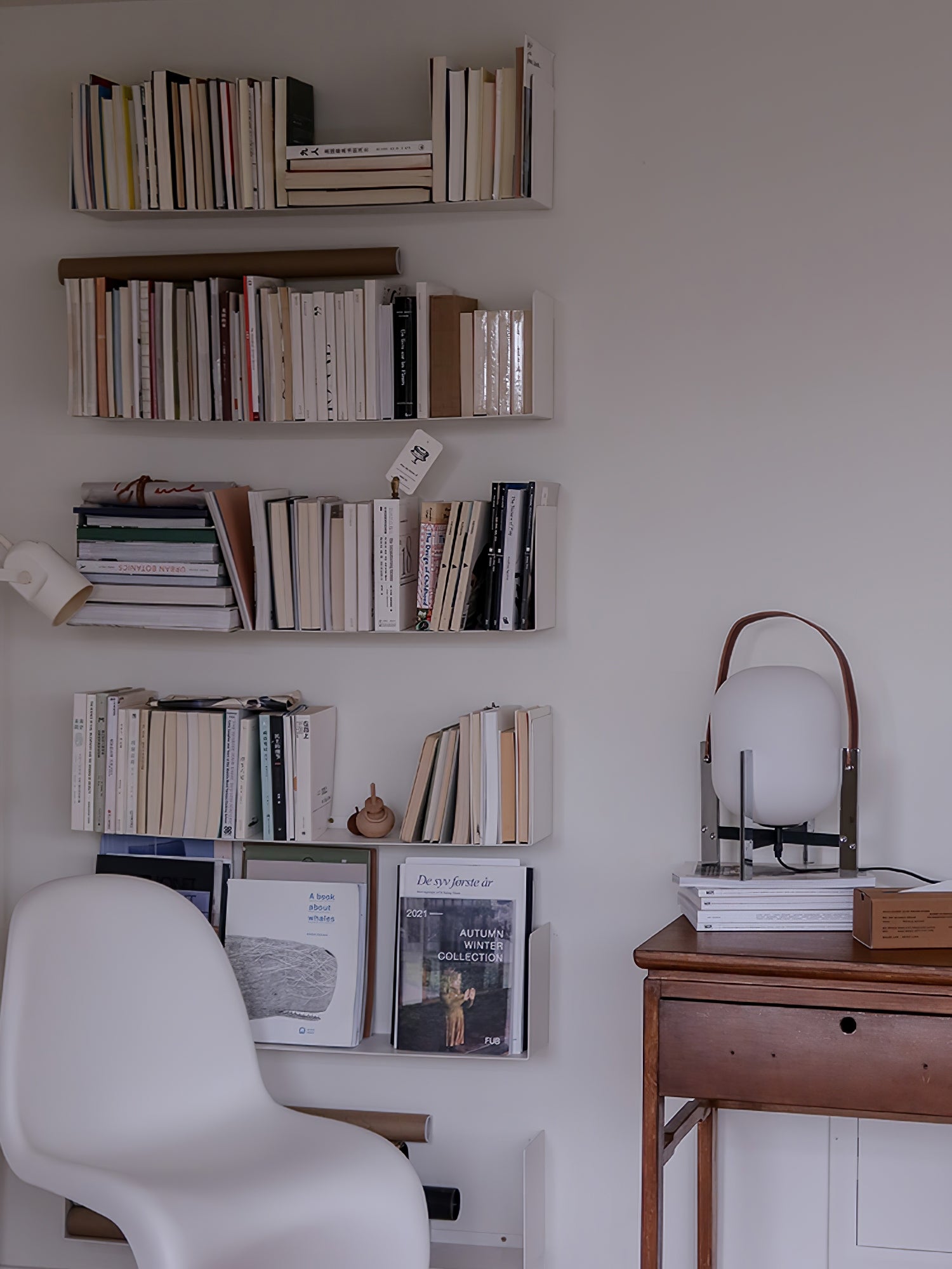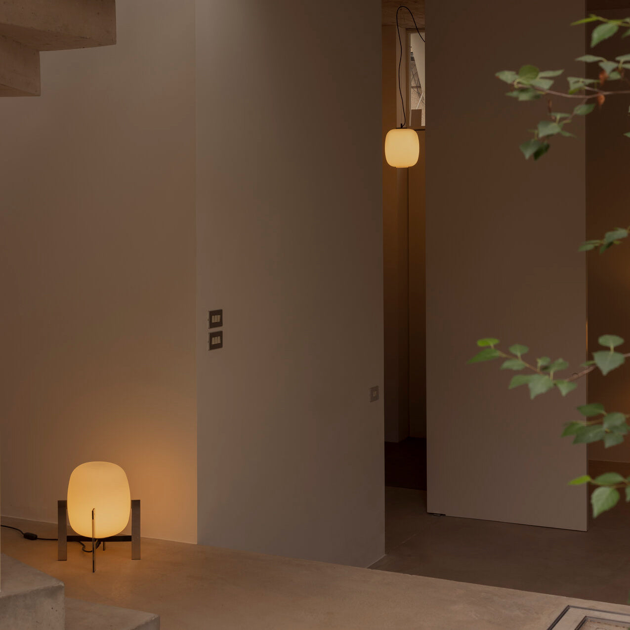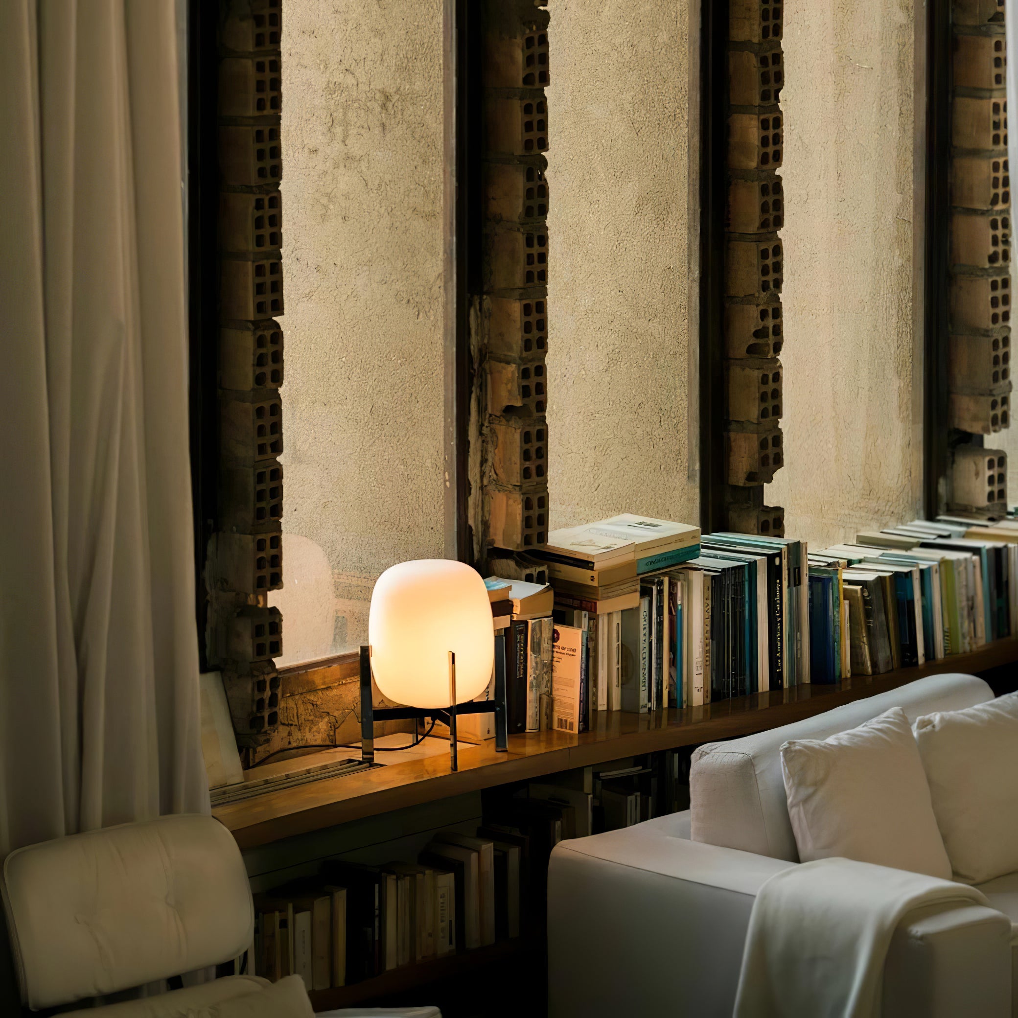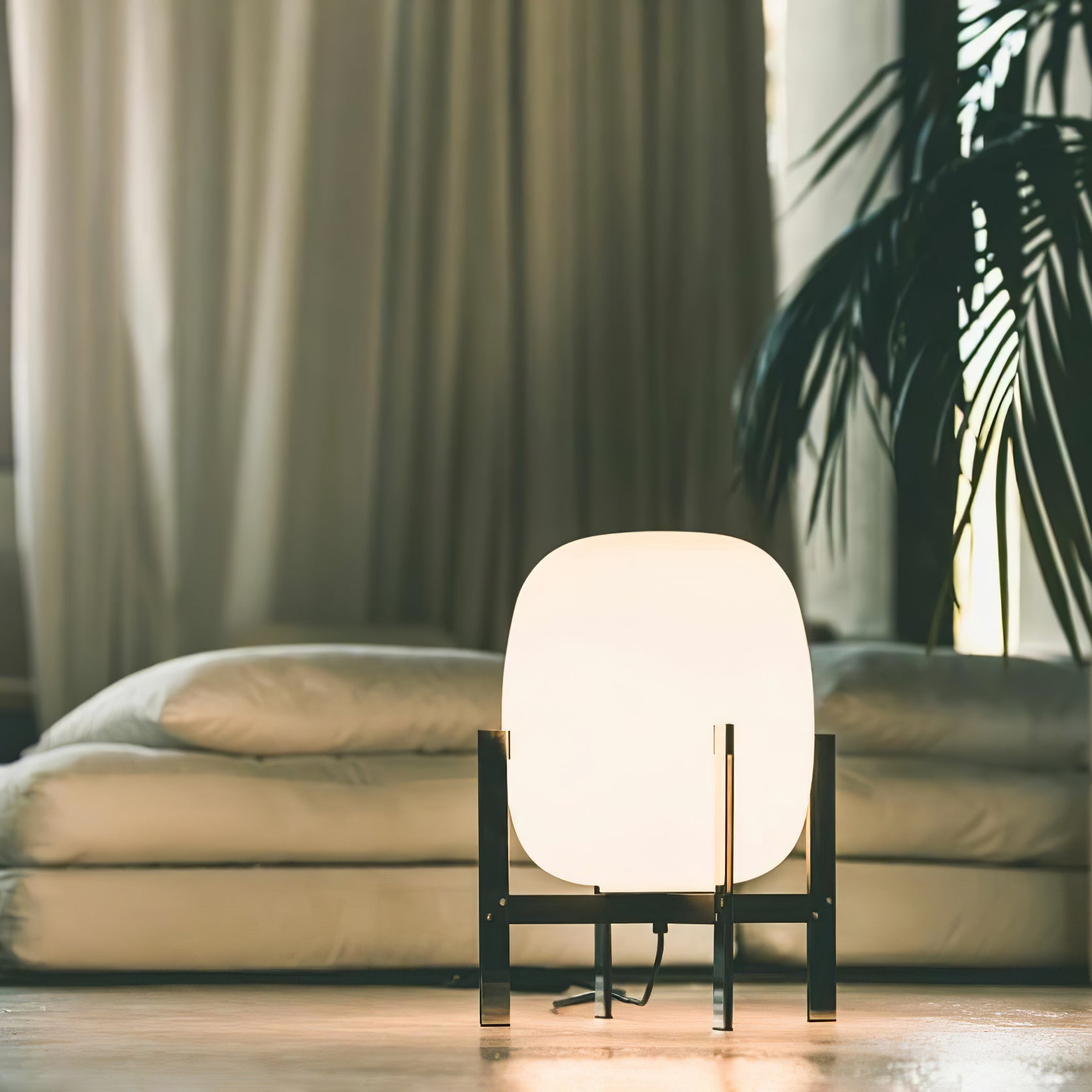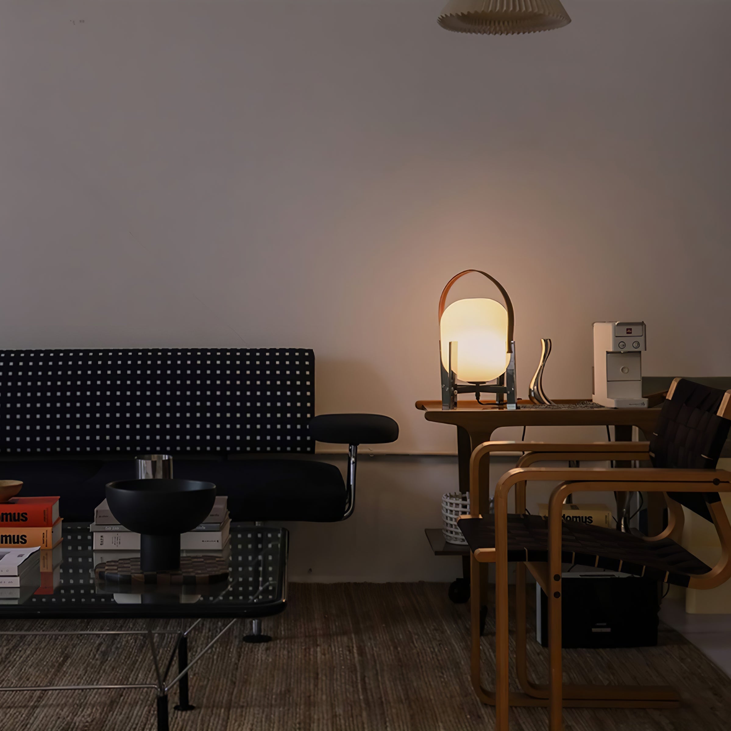Learned to master the expressiveness of steel by giving it a fragile heart. Strength and emotion, angle and curve. In a duel between strength and fragility, Portable Lantern Table Lamp comes with or without a soft leather handle, contrasting with the well-aimed severity of the brackets that gently hold the delicate opal globe.