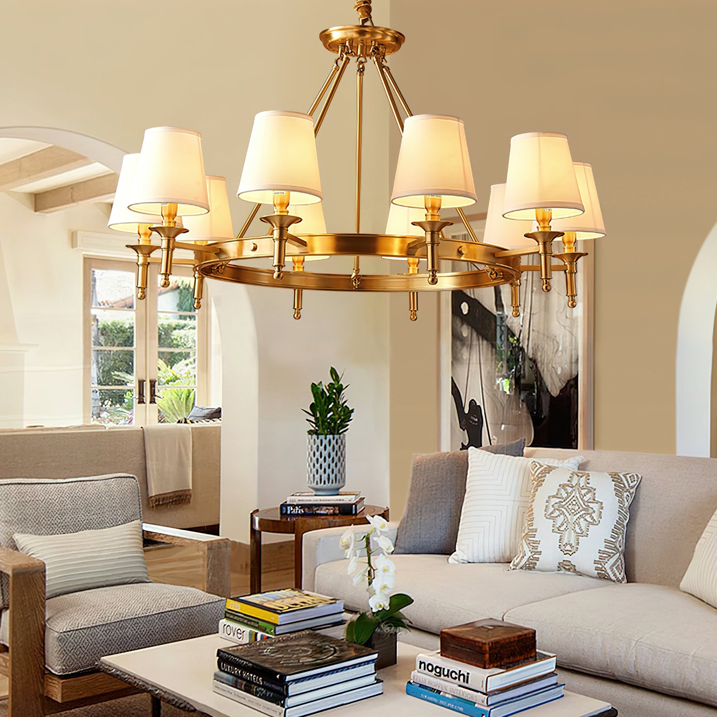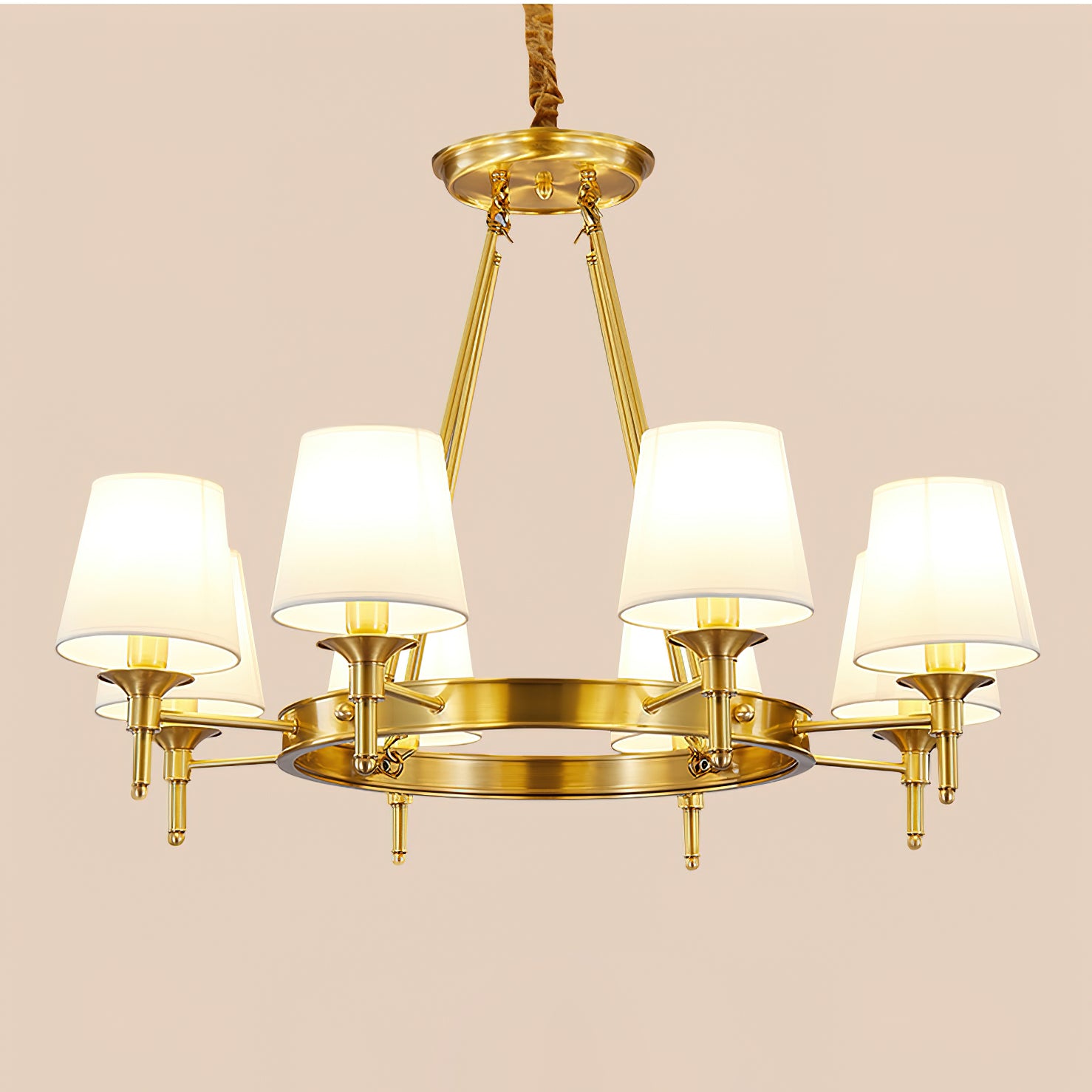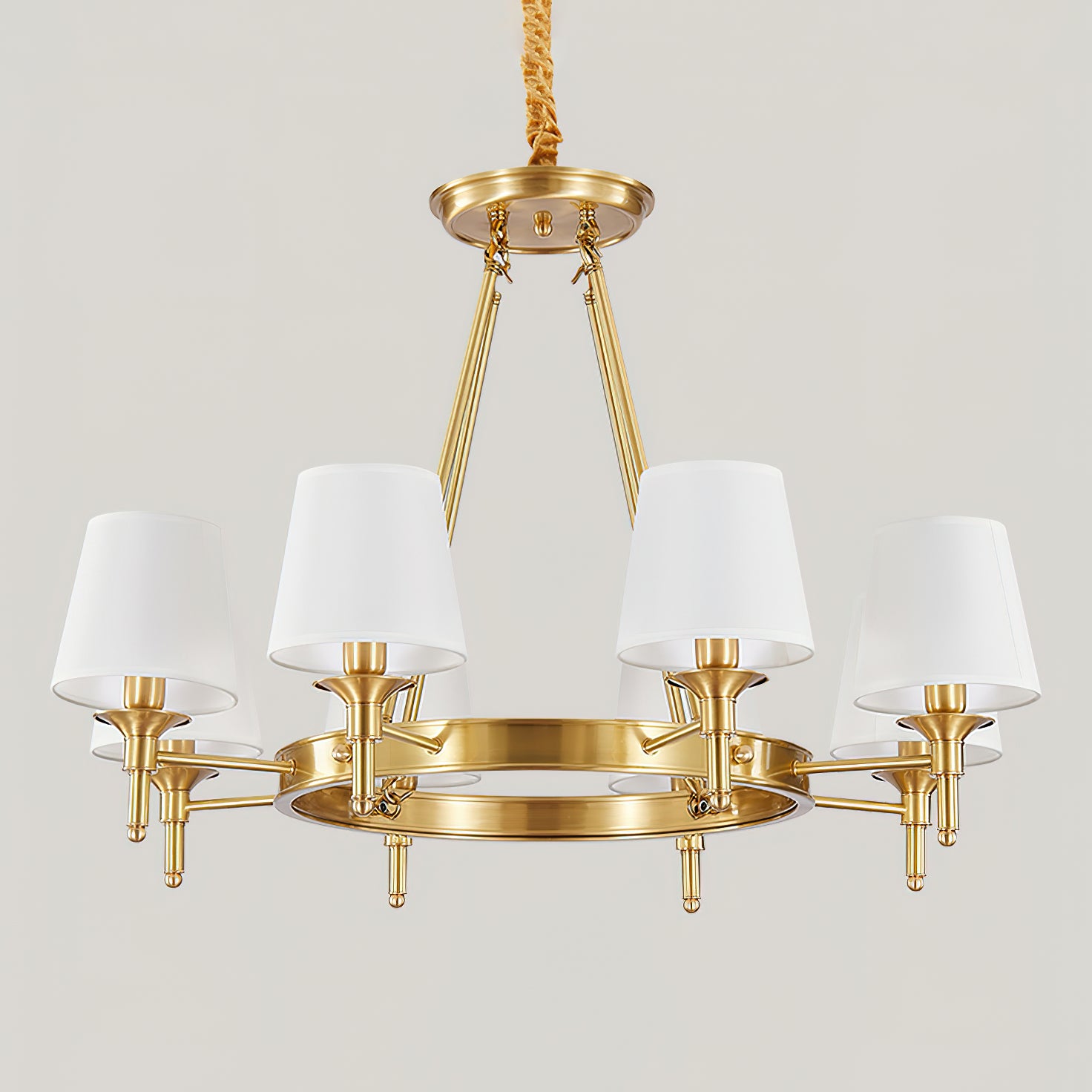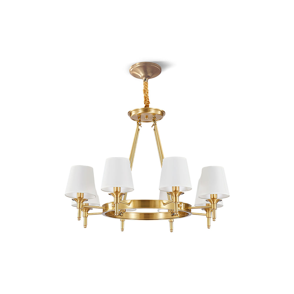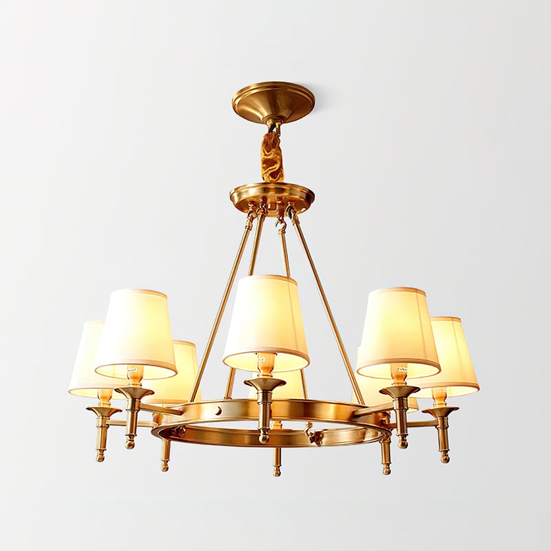Light up your dining table with our Postmodern Round Chandelier. Made from premium linen, it provides soft light without any harsh glare. Its modern wheel design with brass finish adds a touch of elegance to any space. This chandelier is the perfect blend of style and functionality.