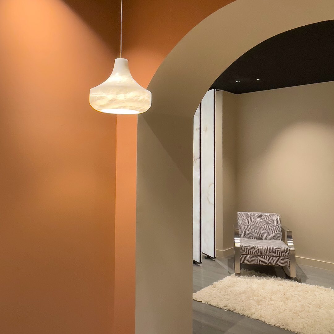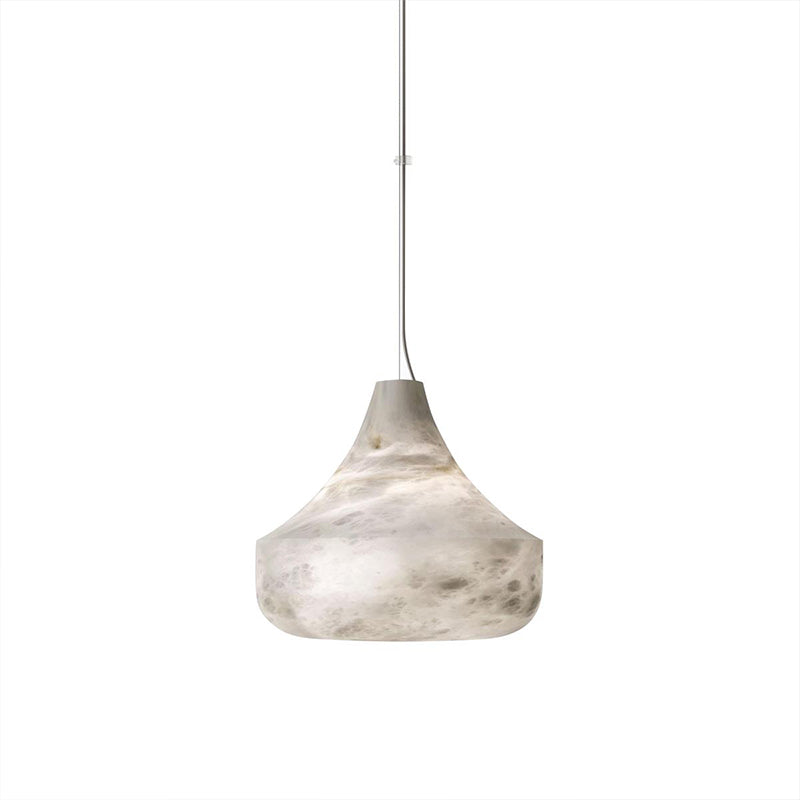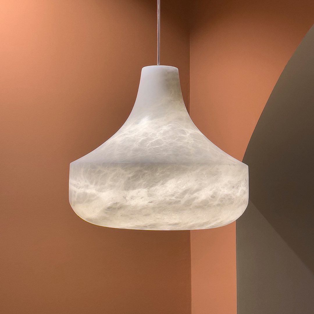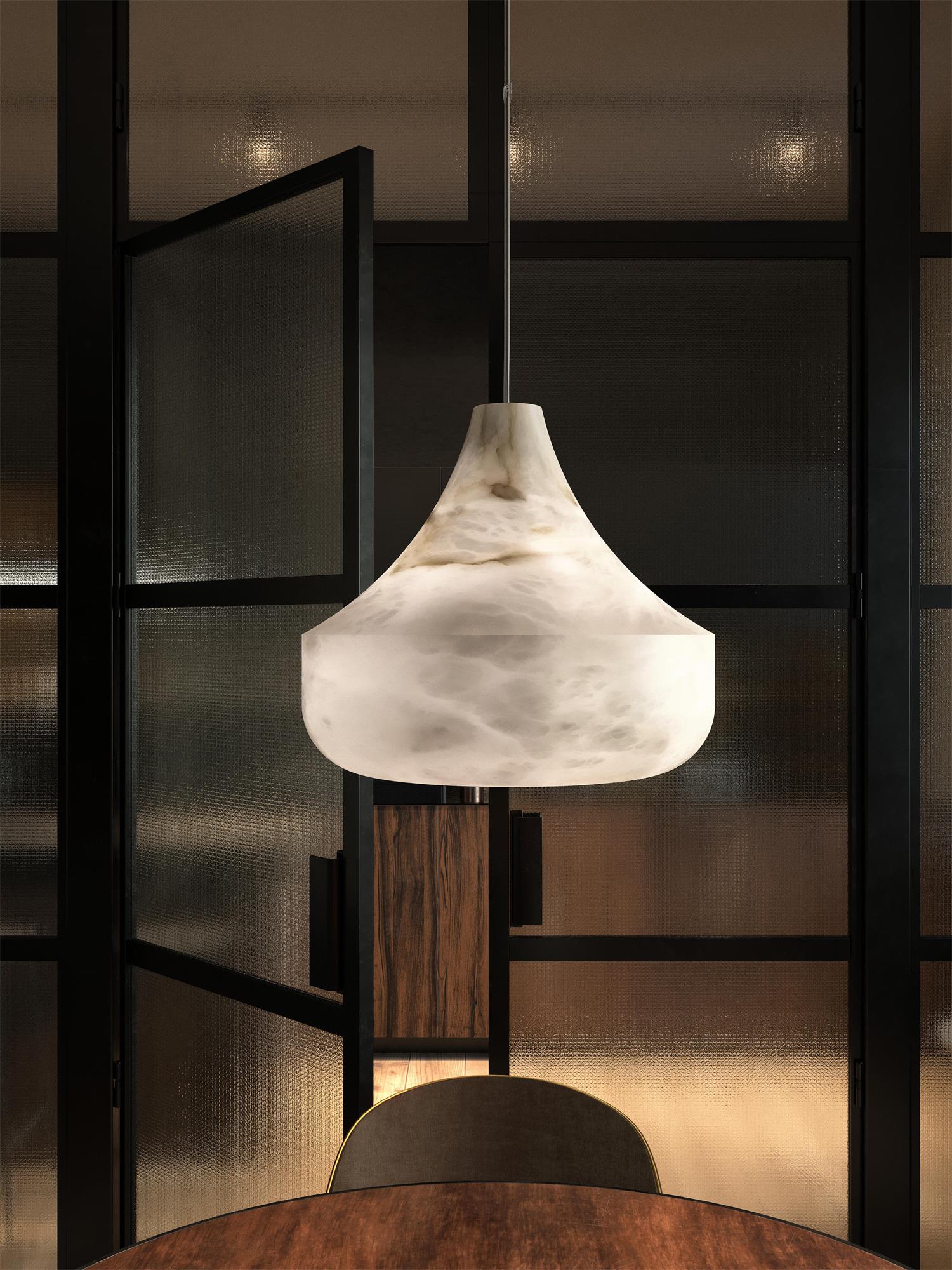 Bring a touch of sophistication with Mooijane's elegant Prague Alabaster Pendant Light. Combining a traditional lampshade shape with a modern cylindrical design, this lamp exudes an elegance that complements any space. With its natural lines and sleek shape, the Prague Alabaster Pendant Light is a timeless choice for dining rooms and living rooms.