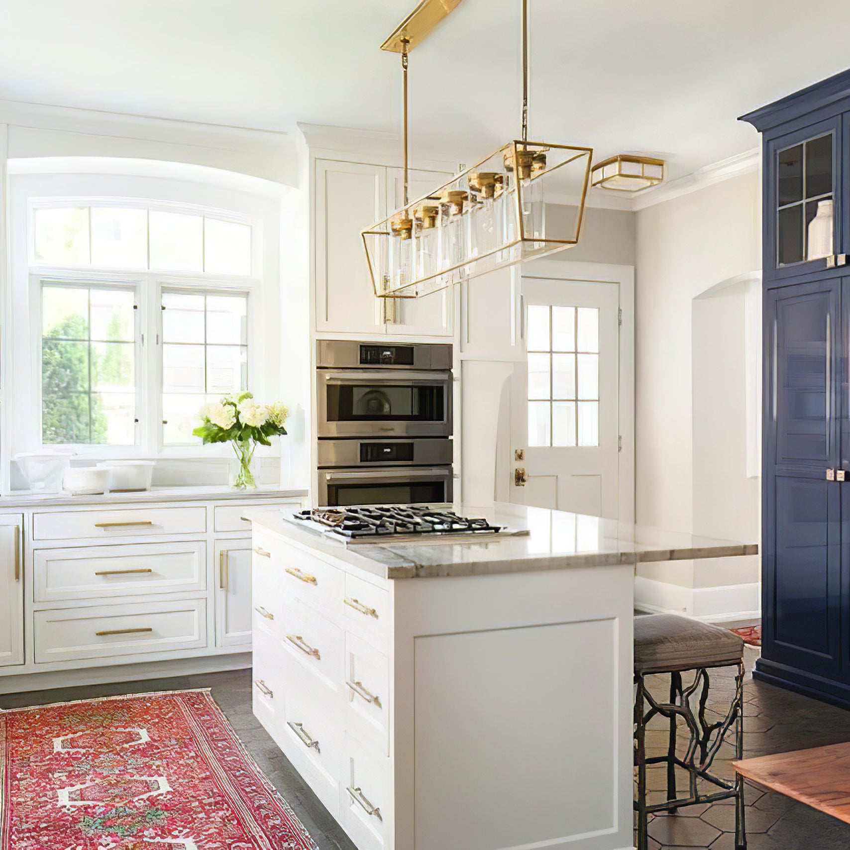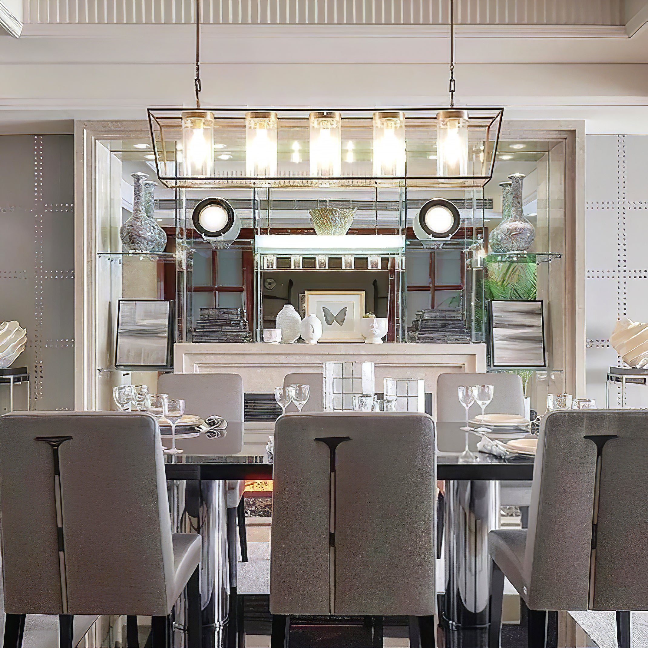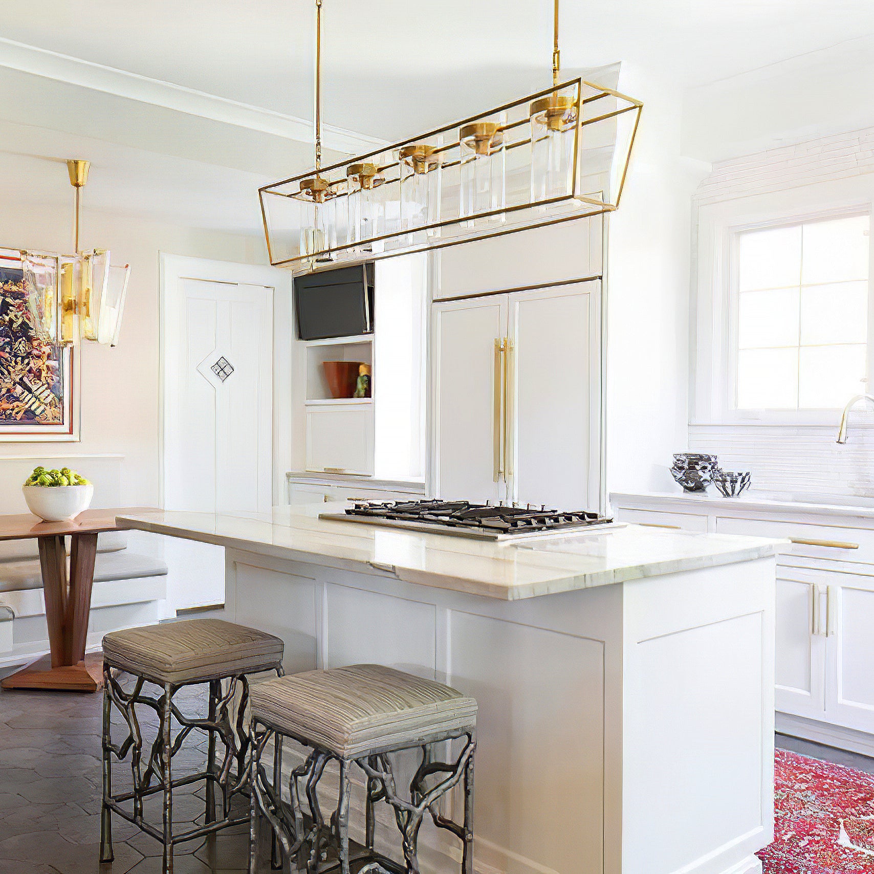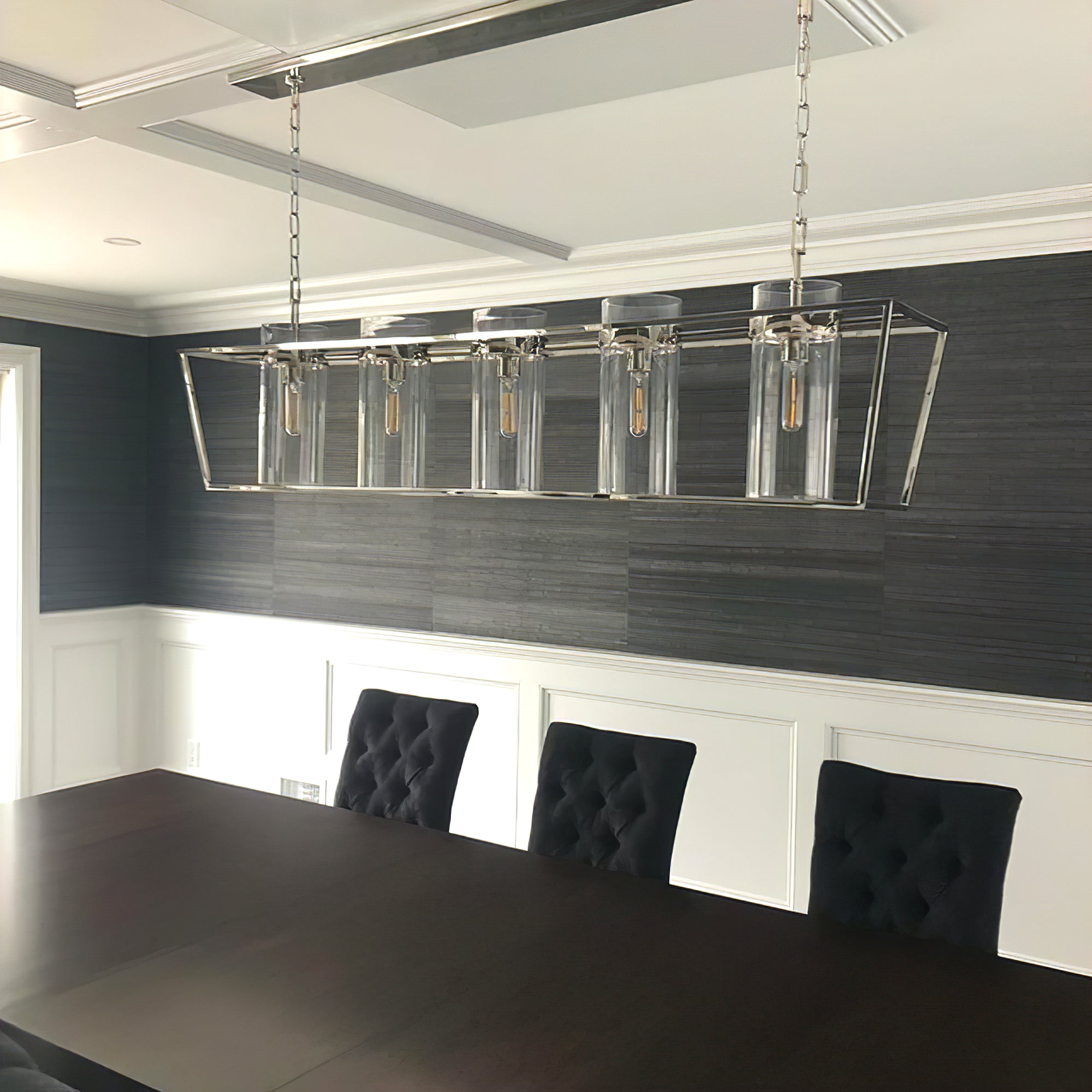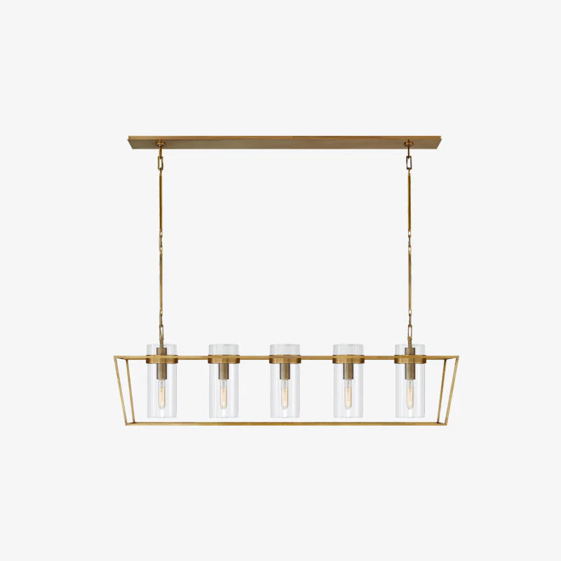 Enhance your space with the Presidio Large Linear Chandelier! Crafted with a sturdy metal band and elegant glass components, this chandelier adds both brightness and sophistication to any interior. Five glass cylinders create a beautiful outdoor cage effect, suspended from a central and connecting rods.