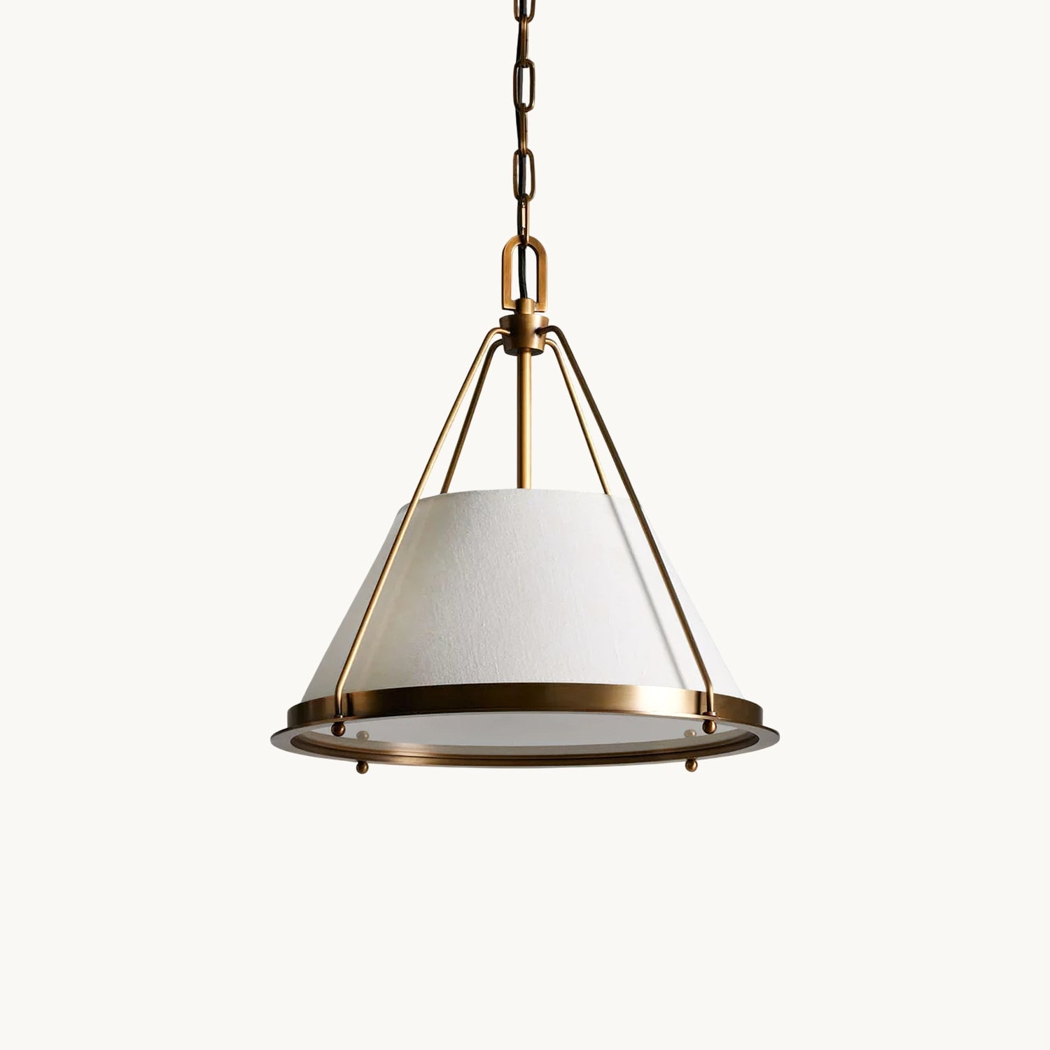 The Pullman Pendant Light from Mooijane blends smooth brass with textured linen, creating an industrial-inspired look. Its metal arms and flared linen shades add a refined touch to any space, making it a standout piece in modern interiors.