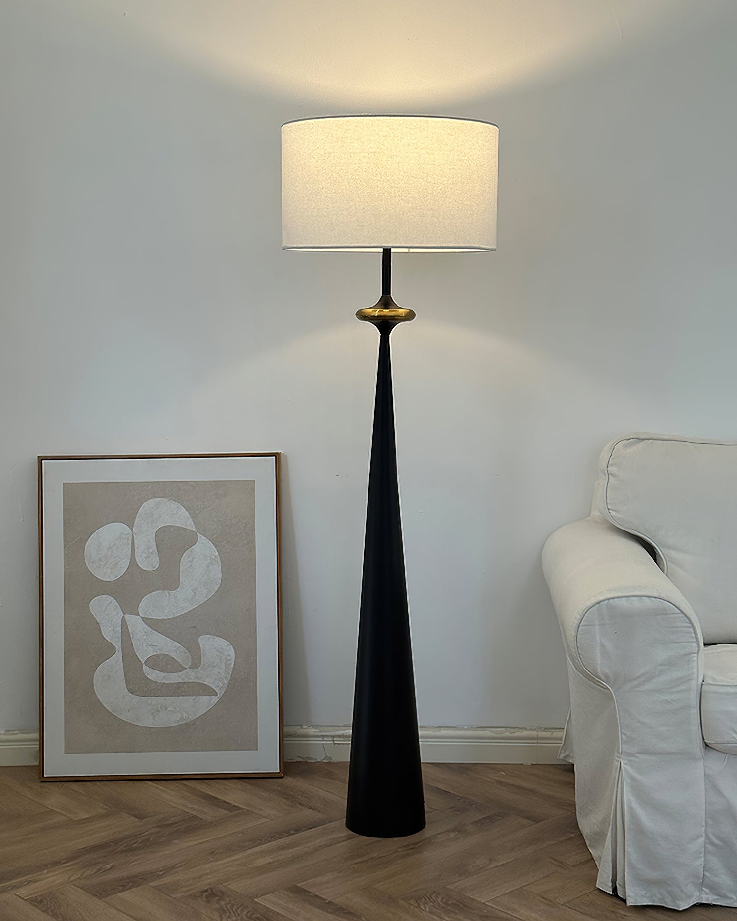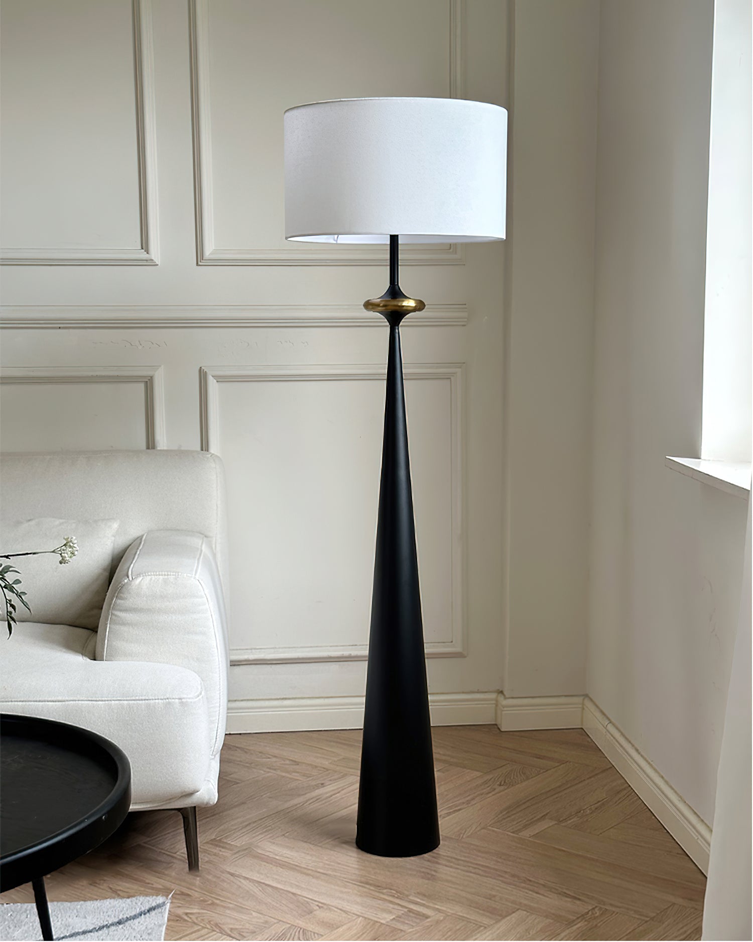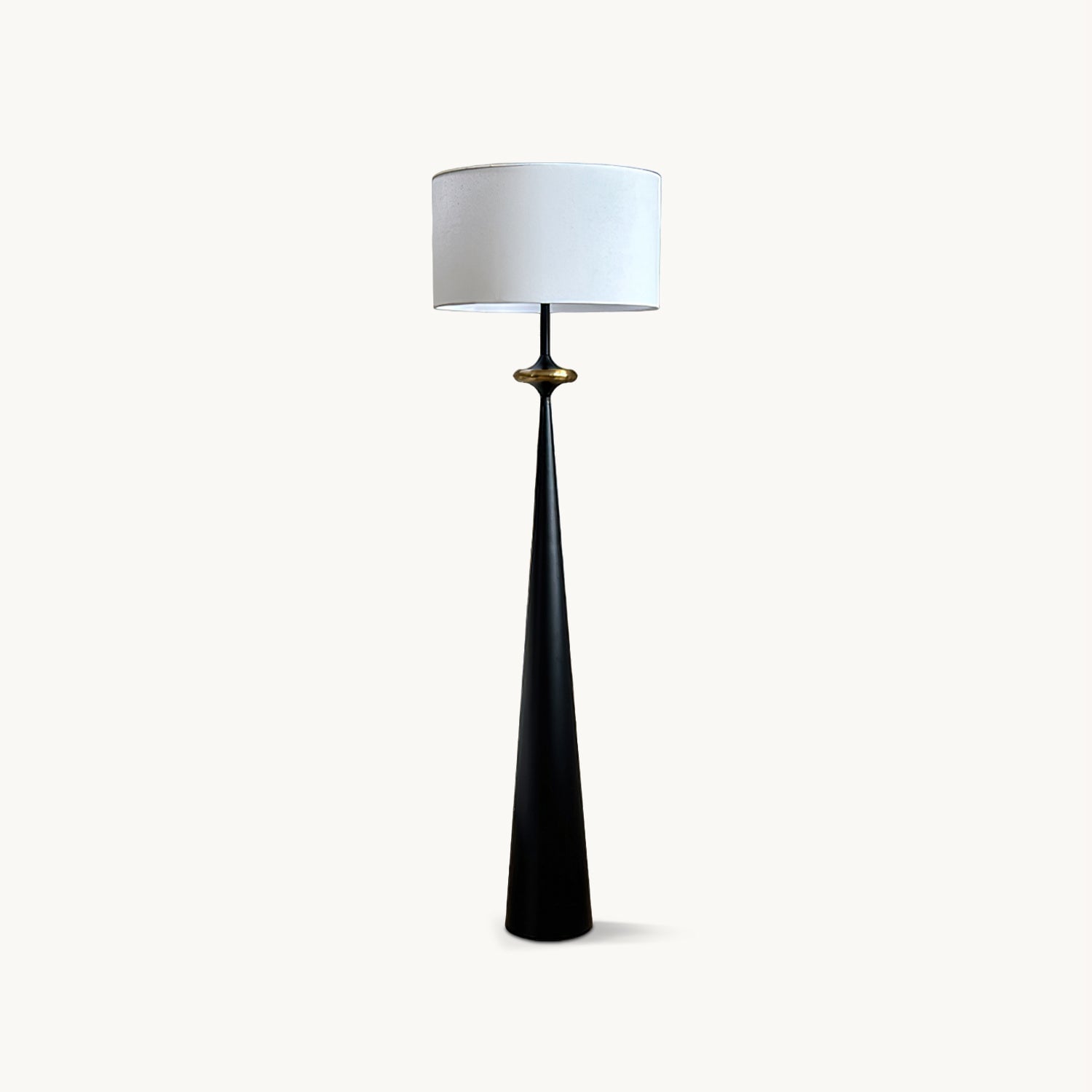 Elevate your living space with the Putney Floor Lamp from Mooijane. Paying homage to the iconic Putney lamp, its striking silhouette and vintage-style aluminum finish add an air of sophistication. Three stacked circles - a cylindrical top, a disc middle, and a slender, tapered base - balance the distinctly mid-century feel.