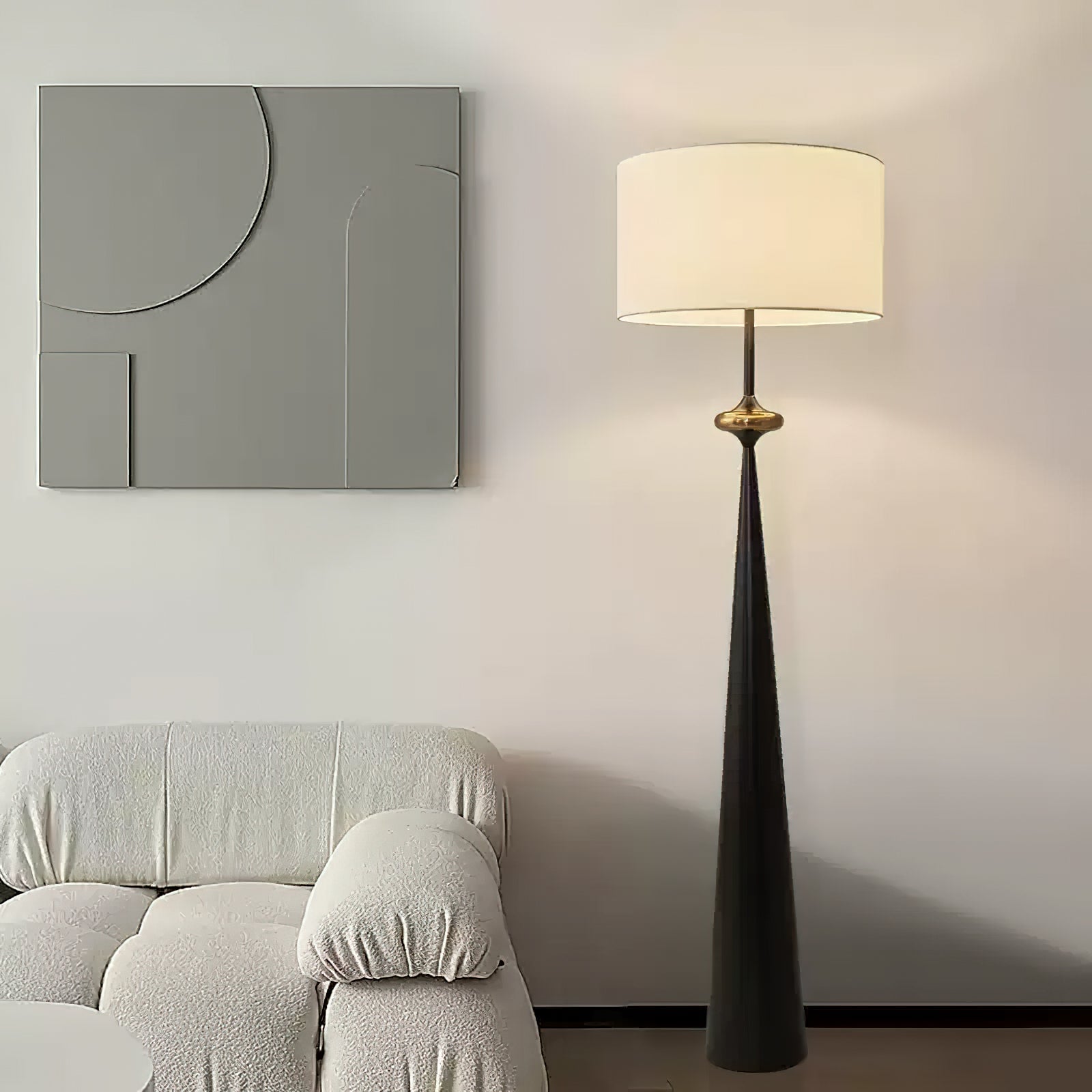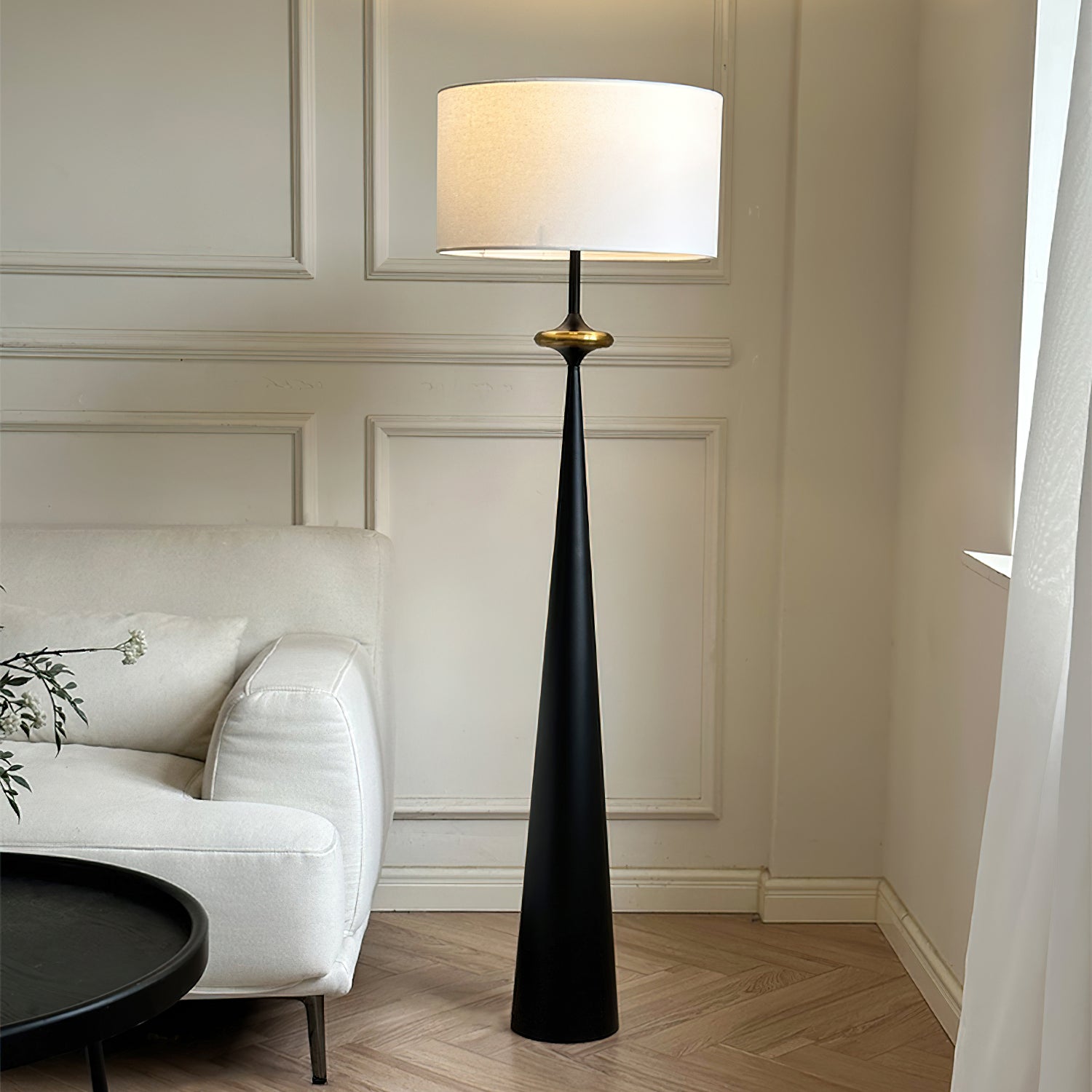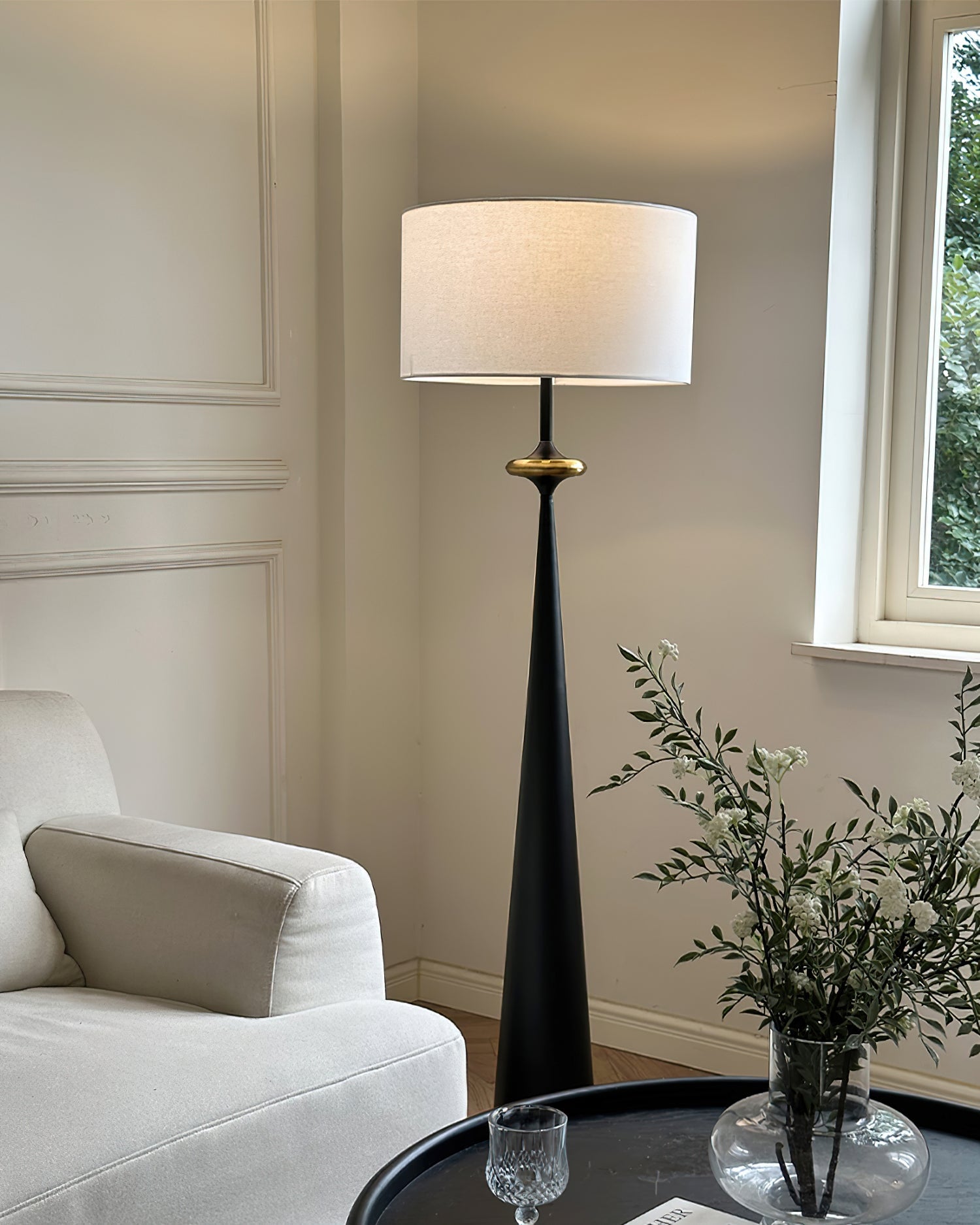 Elevate your living space with the Putney Floor Lamp from Mooijane. Paying homage to the iconic Putney lamp, its striking silhouette and vintage-style aluminum finish add an air of sophistication. Three stacked circles - a cylindrical top, a disc middle, and a slender, tapered base - balance the distinctly mid-century feel.
