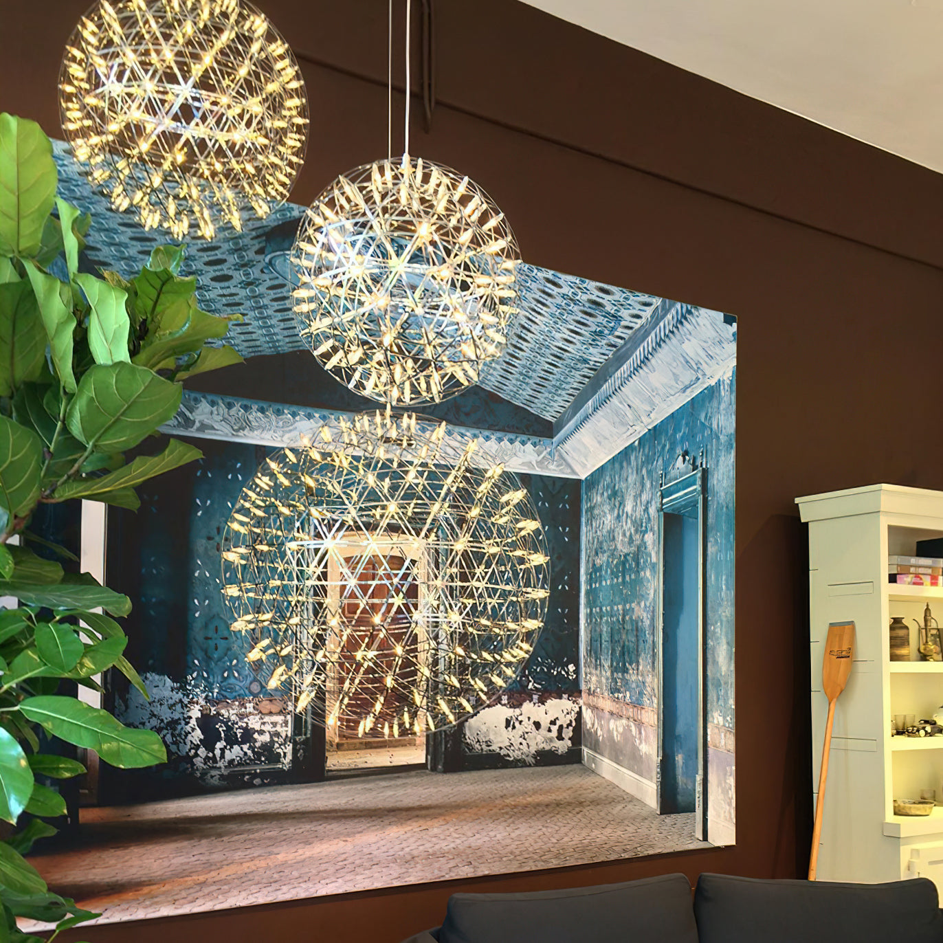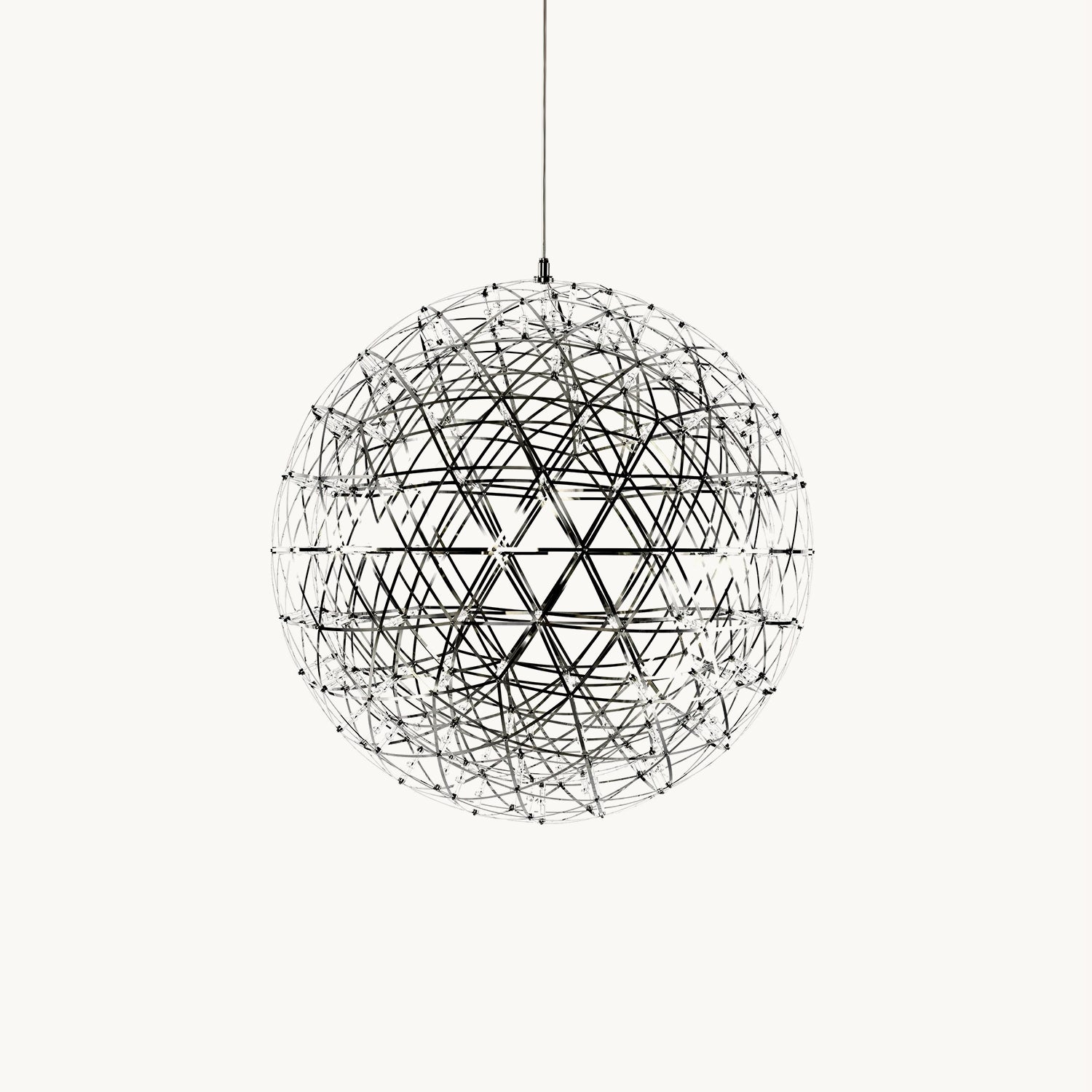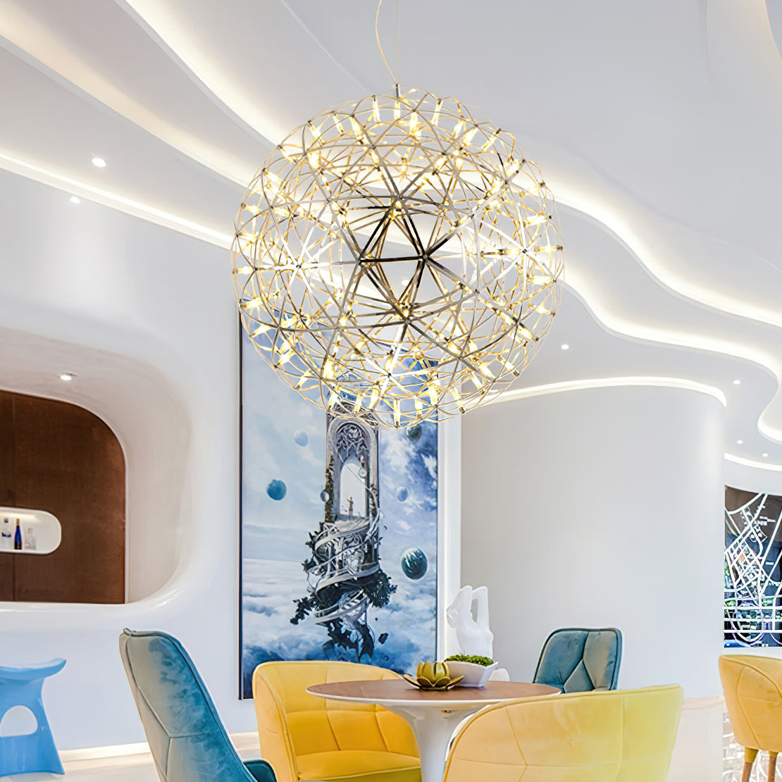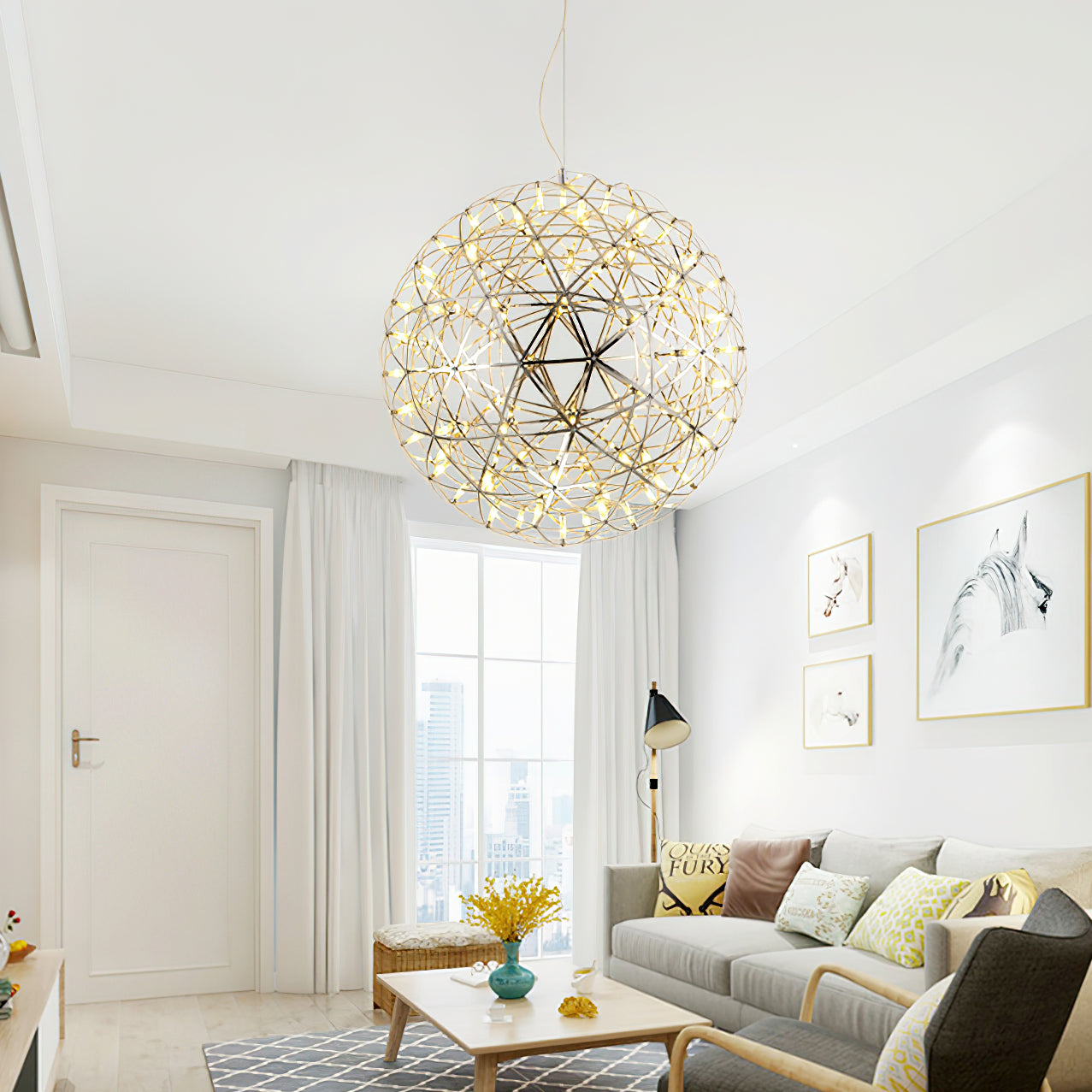 Introduce luxury and glamour to your space with the Raimond Chandelier. The spherical shape and star-shaped light string create depth and visual interest, while the cage frame adds an industrial touch. Perfect for foyers, living rooms, dining rooms, or entryways. Elevate your décor with this unique and stunning lighting fixture.