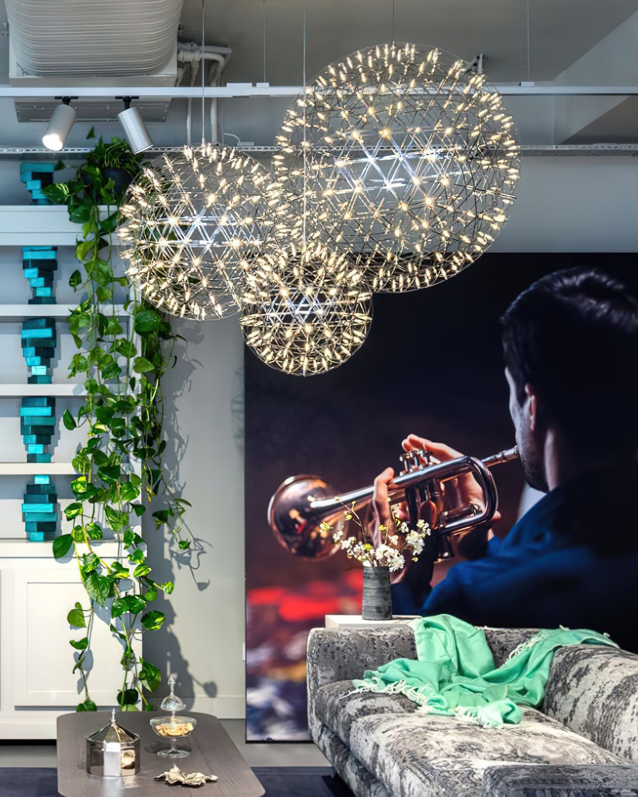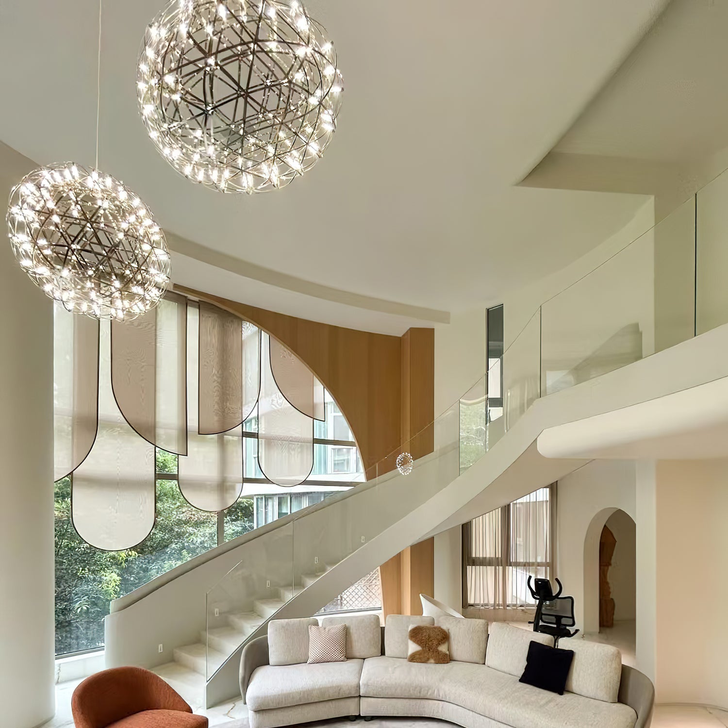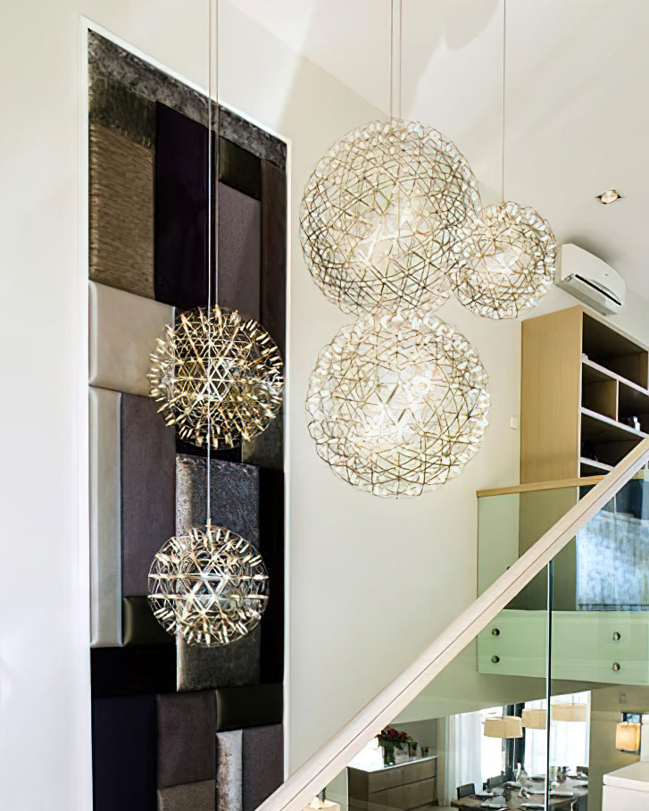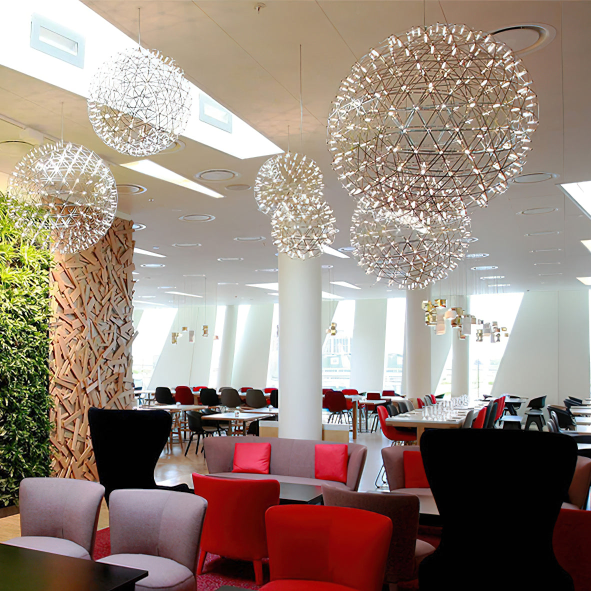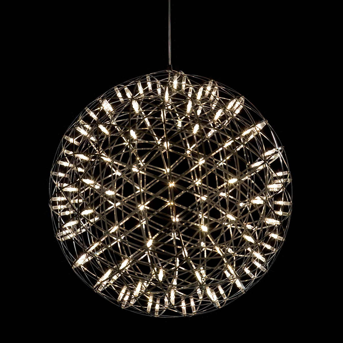 Introduce luxury and glamour to your space with the Raimond Chandelier. The spherical shape and star-shaped light string create depth and visual interest, while the cage frame adds an industrial touch. Perfect for foyers, living rooms, dining rooms, or entryways. Elevate your décor with this unique and stunning lighting fixture.