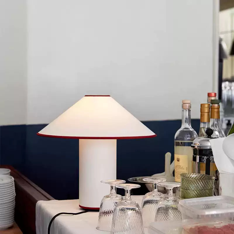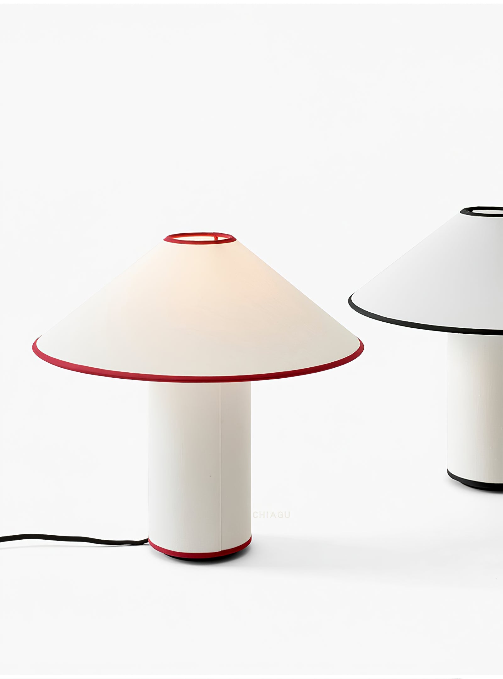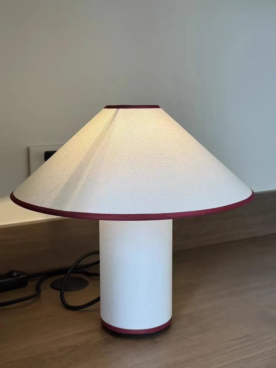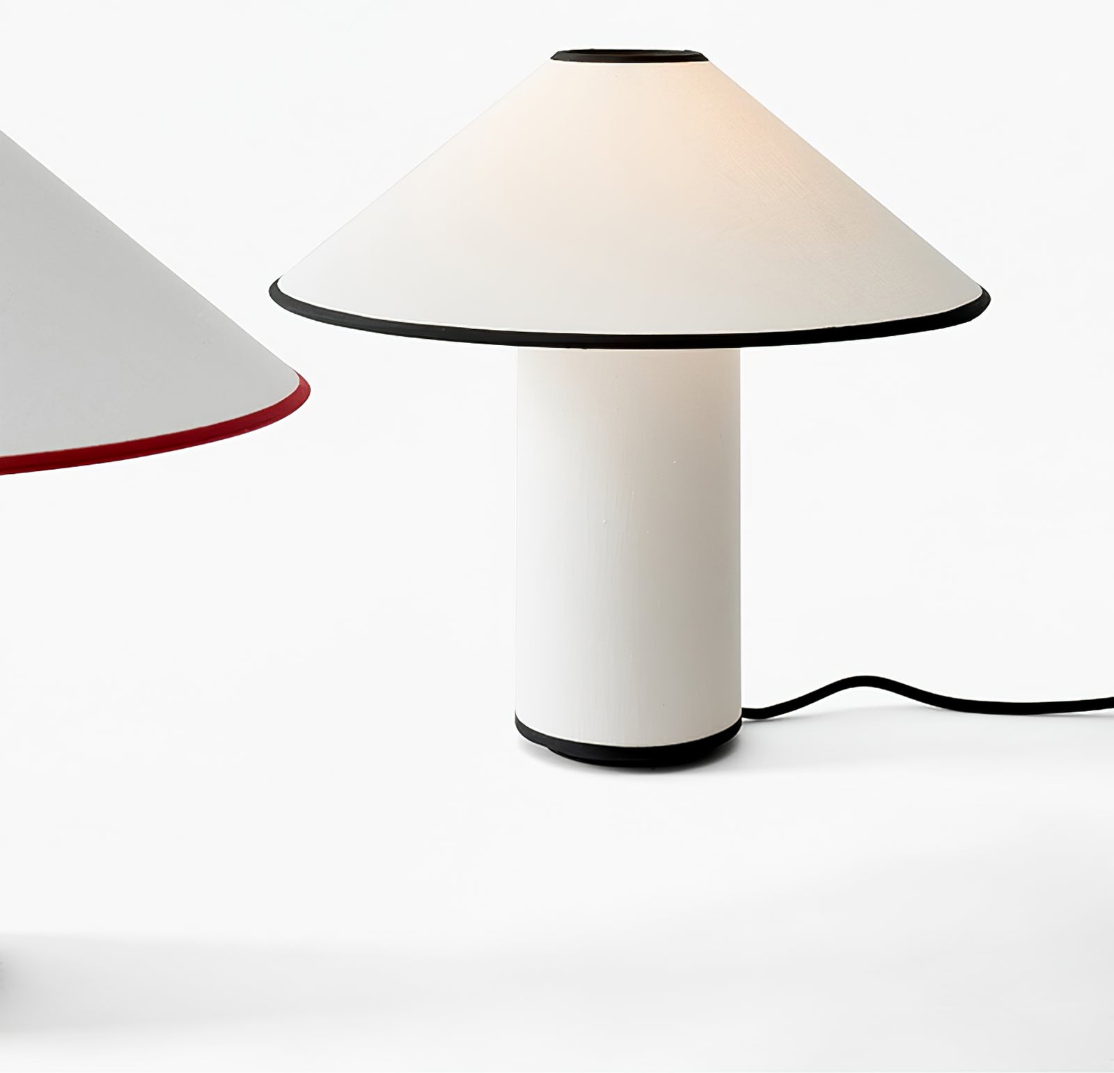 The Red Trim Cone Shade Table Lamp combines elegance with a modern twist, drawing inspiration from Art Deco design. Its clean, white fabric shade is accentuated by a bold red trim along the edges, adding a subtle yet sophisticated contrast. The conical shade rests atop a simple cylindrical base, creating a sleek silhouette that enhances its timeless aesthetic. This table lamp’s blend of functionality and style allows it to harmonize with a variety of interiors, serving as both a practical light source and a statement piece.
