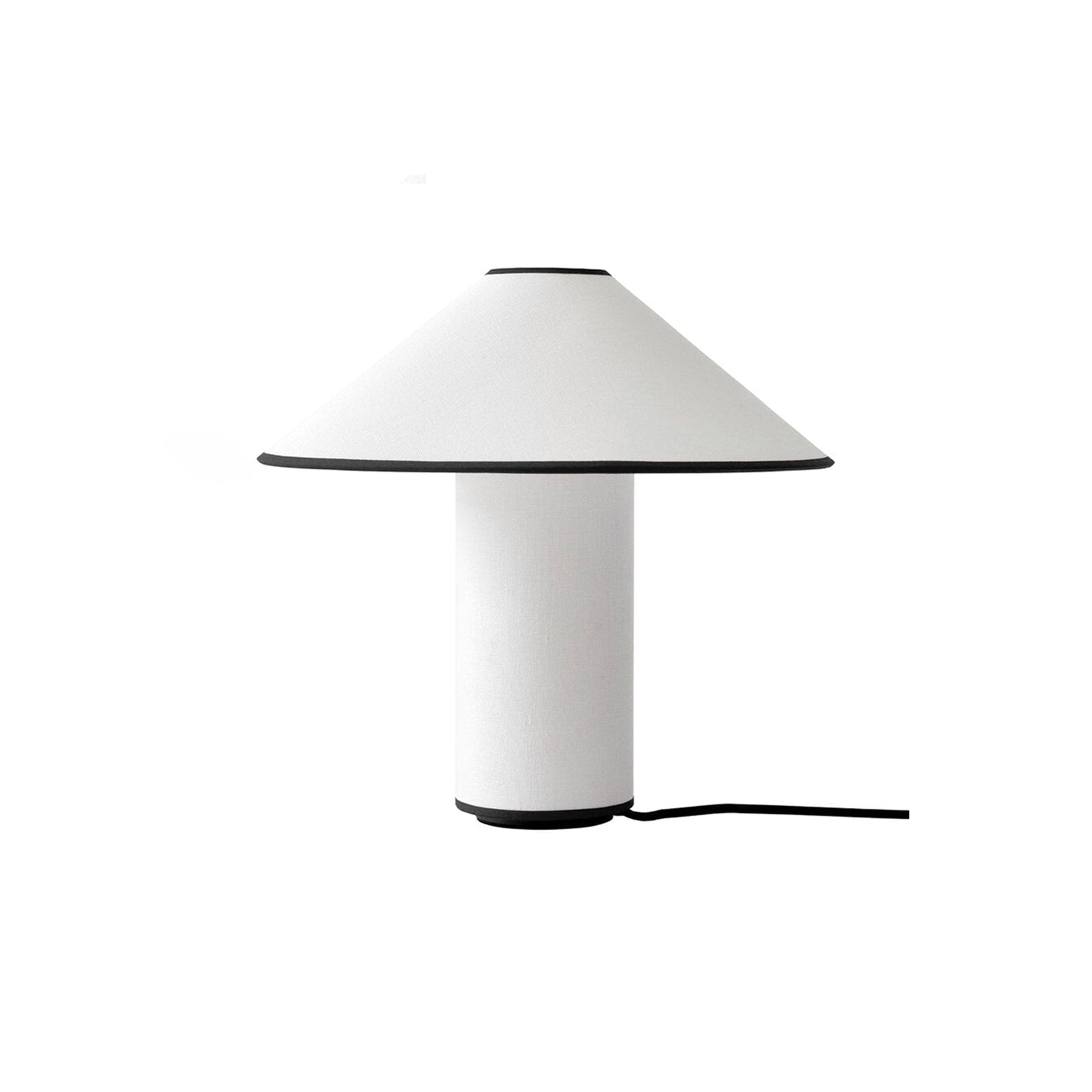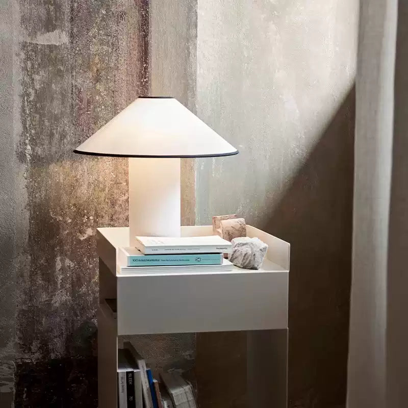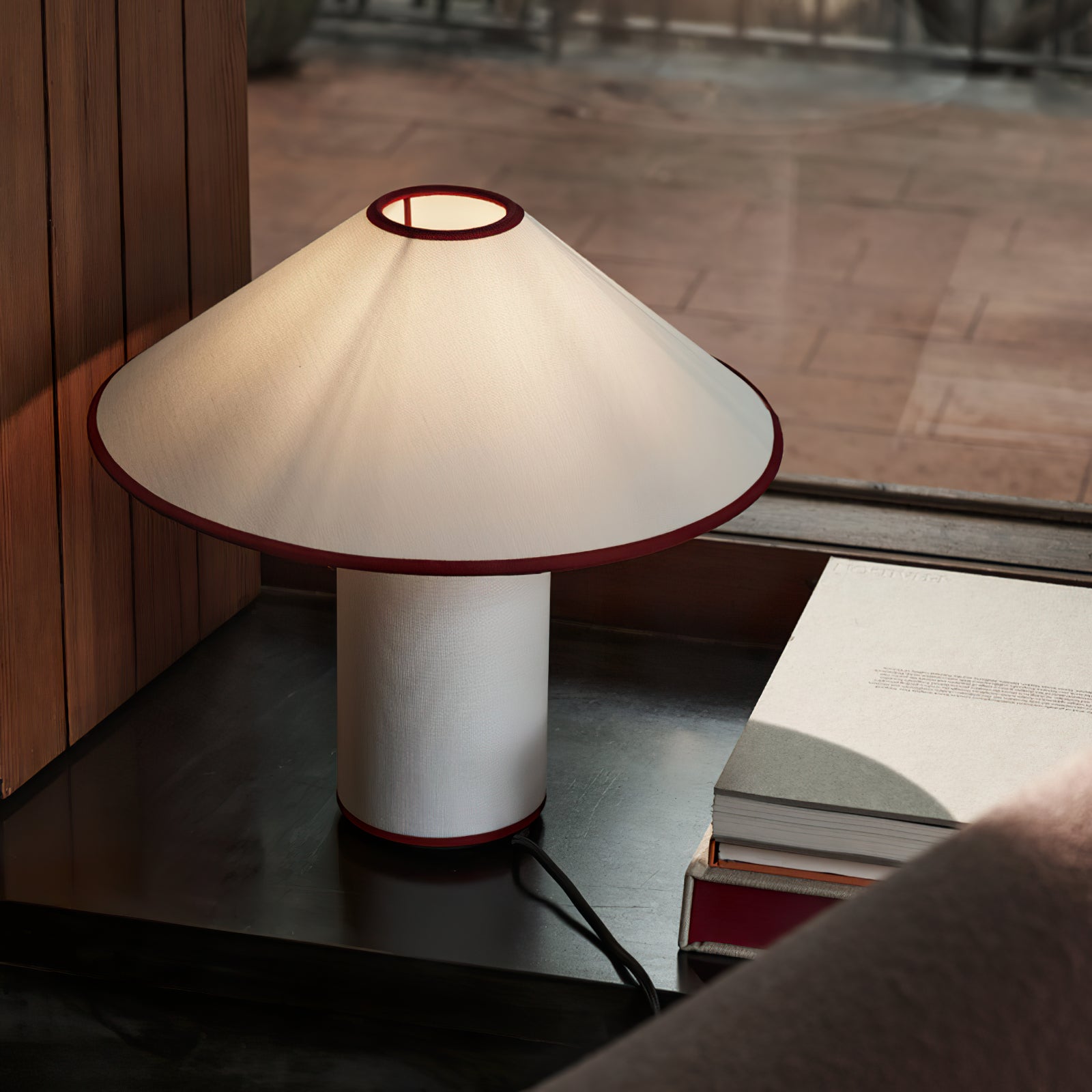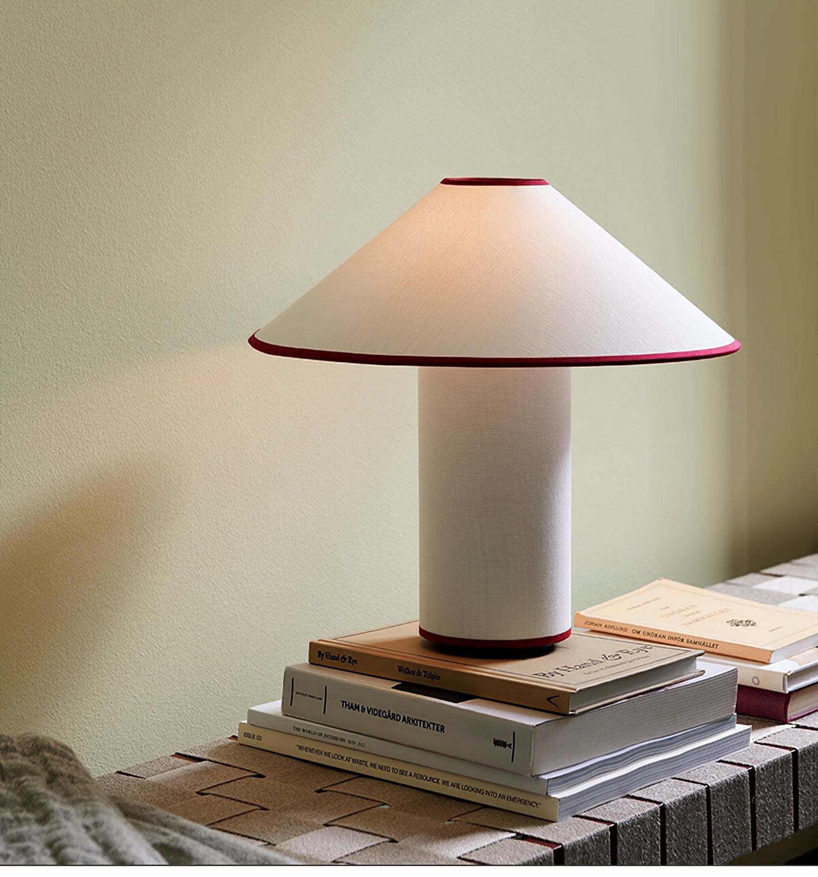 The Red Trim Cone Shade Table Lamp combines elegance with a modern twist, drawing inspiration from Art Deco design. Its clean, white fabric shade is accentuated by a bold red trim along the edges, adding a subtle yet sophisticated contrast. The conical shade rests atop a simple cylindrical base, creating a sleek silhouette that enhances its timeless aesthetic. This table lamp’s blend of functionality and style allows it to harmonize with a variety of interiors, serving as both a practical light source and a statement piece.