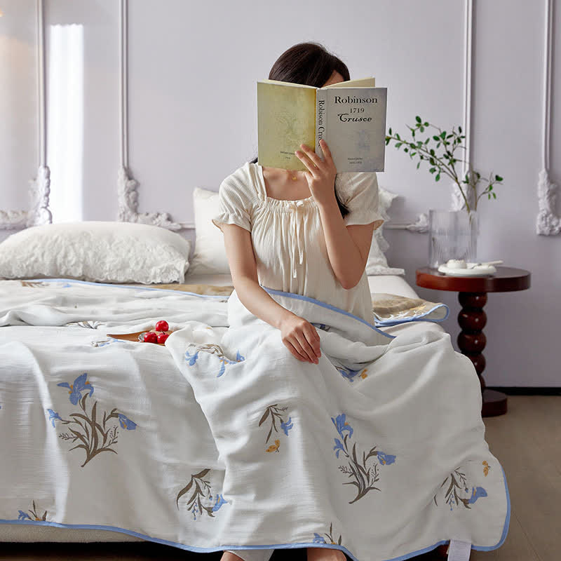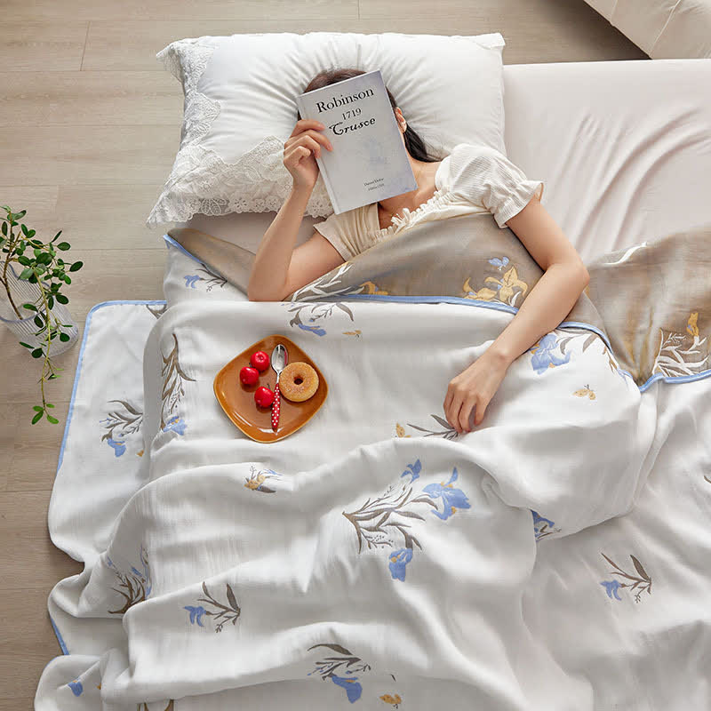 This quilt is made from lyocell fiber with four layers of gauze, offering a natural cooling effect. Its fabric includes small breathable pores that enhance air circulation and moisture absorption, preventing stuffiness. Adorned with a vibrant floral print, it adds a touch of nature's beauty to your sleep experience.