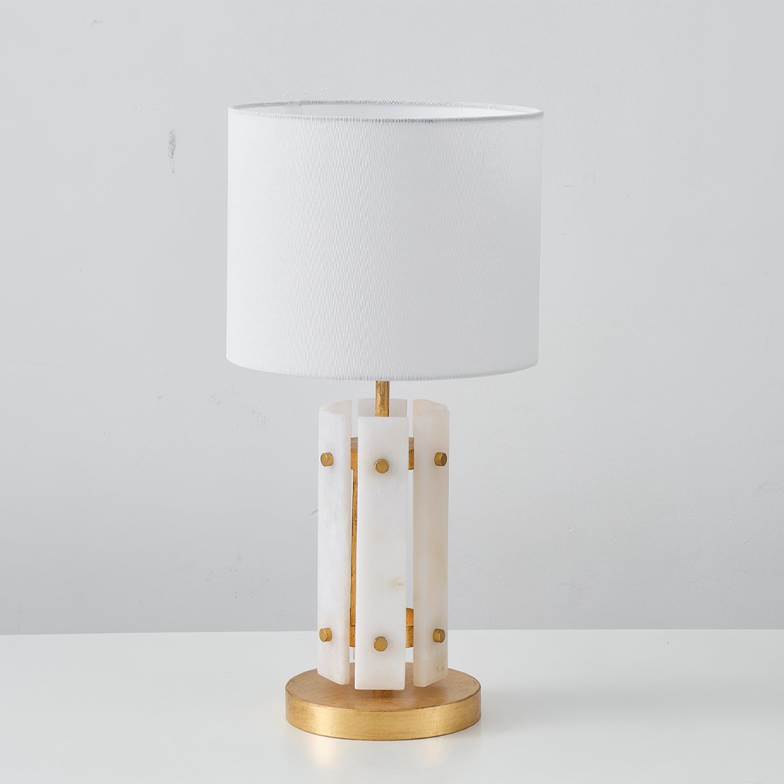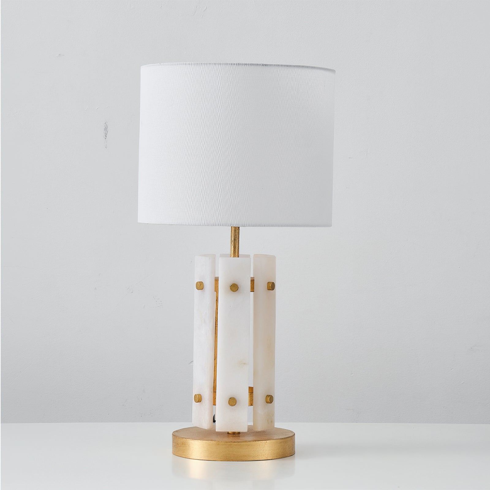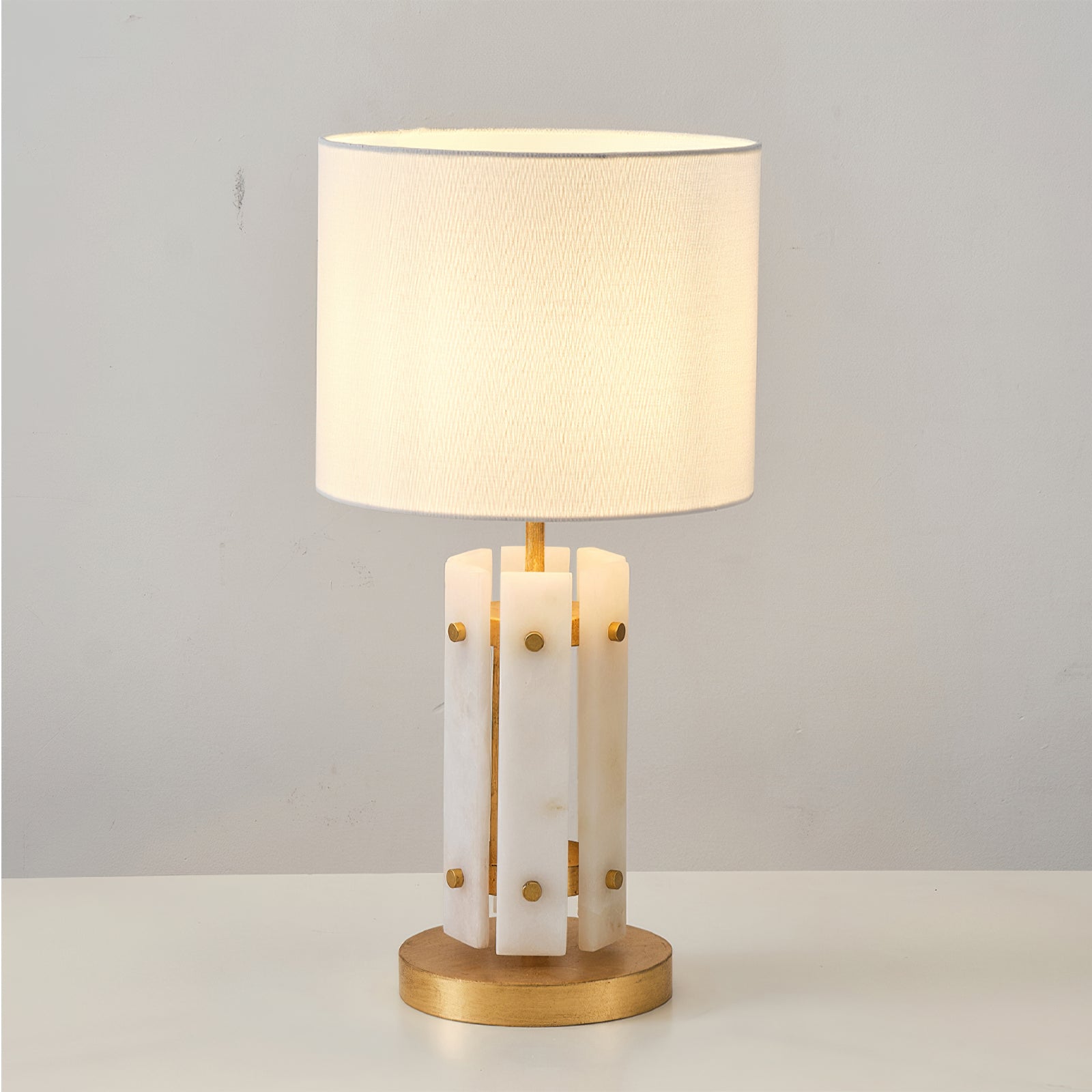 The Regina Table Lamp by Mooijane combines alabaster and metal for a serene and elegant design. Vertically arranged alabaster pieces softly diffuse light, creating a glow reminiscent of frozen ice crystals. Gold accents on the metal base add a touch of refinement and luxury. Paired with a simple fabric shade, it casts warm, subtle light, making it perfect for a bedroom bedside, living room corner, or any space in need of understated sophistication.