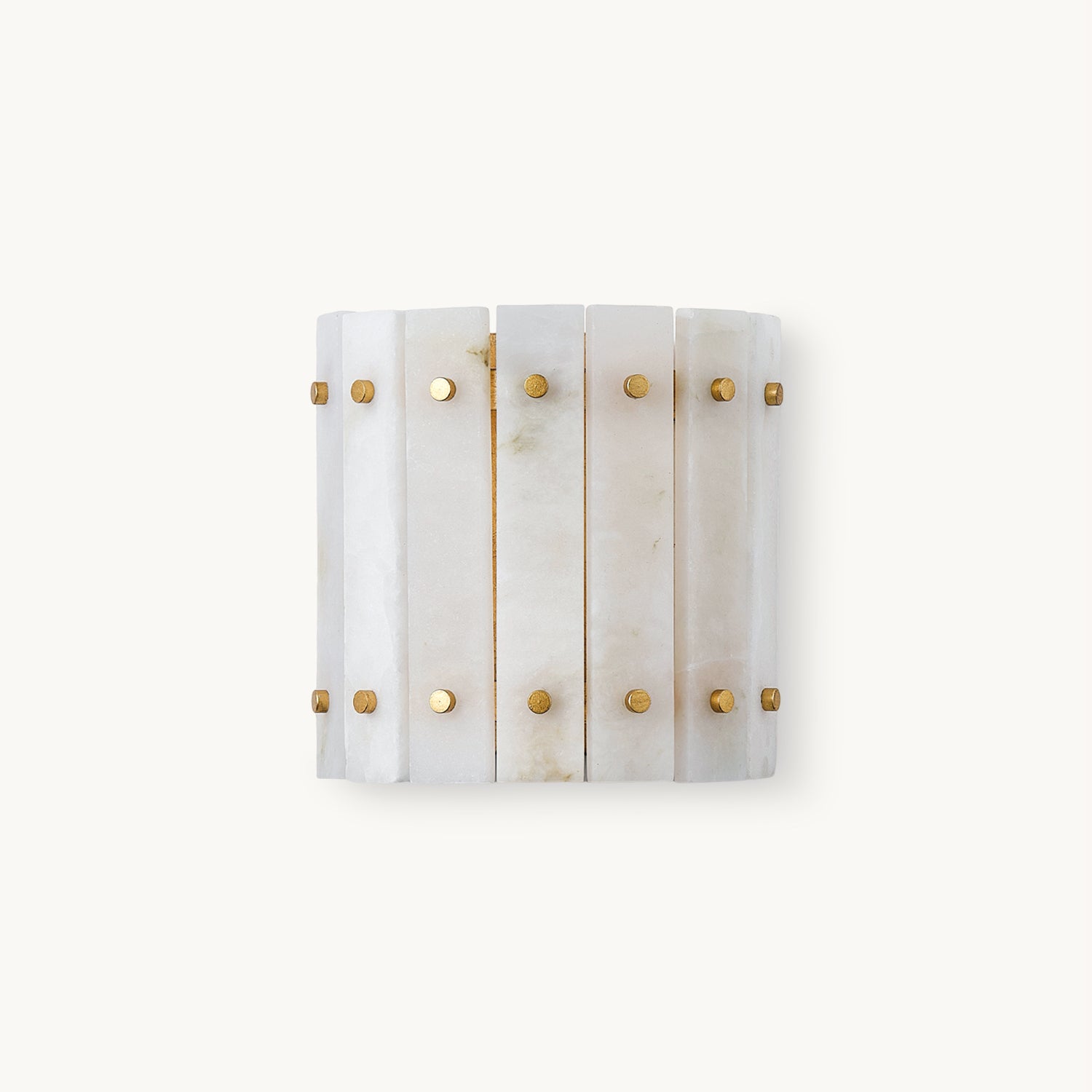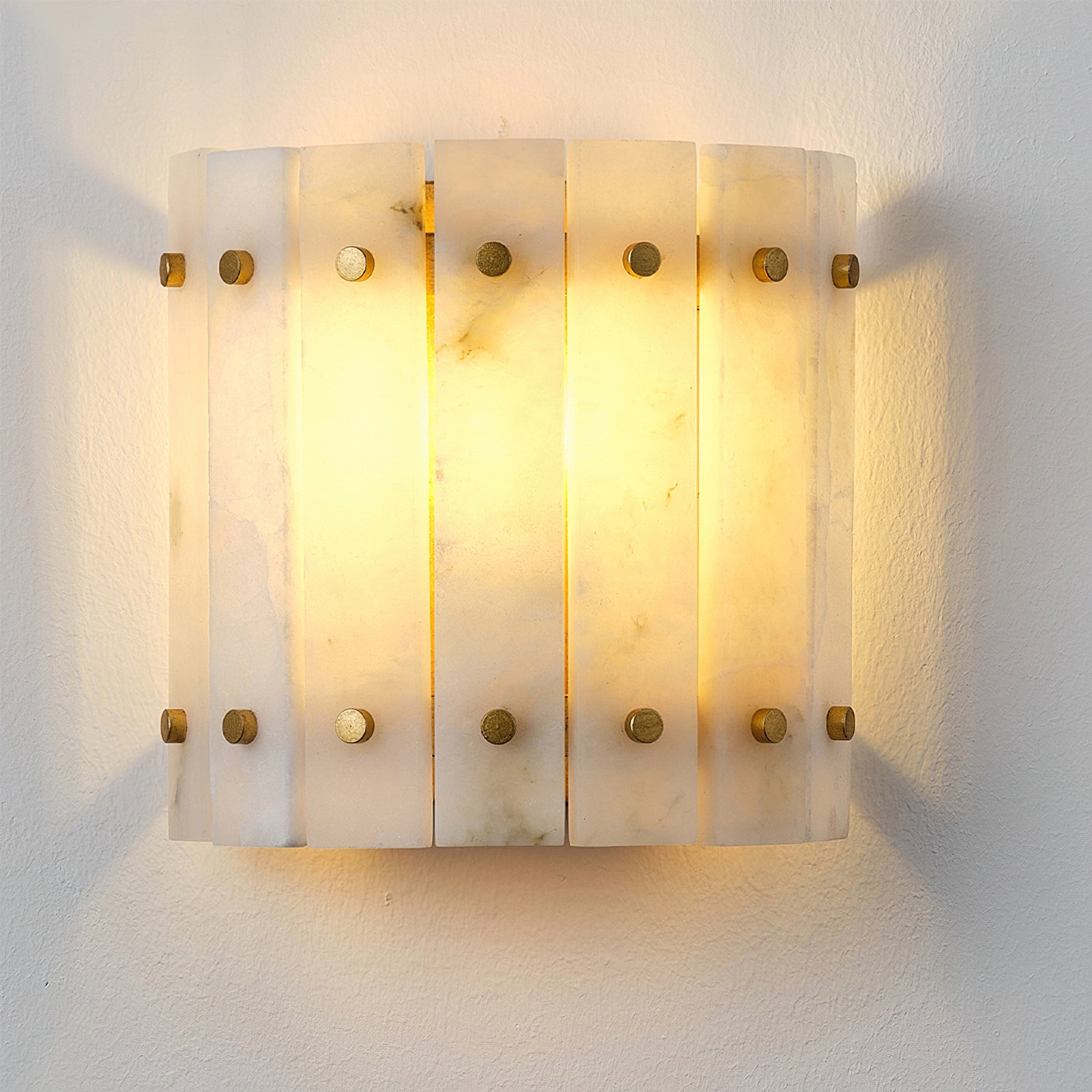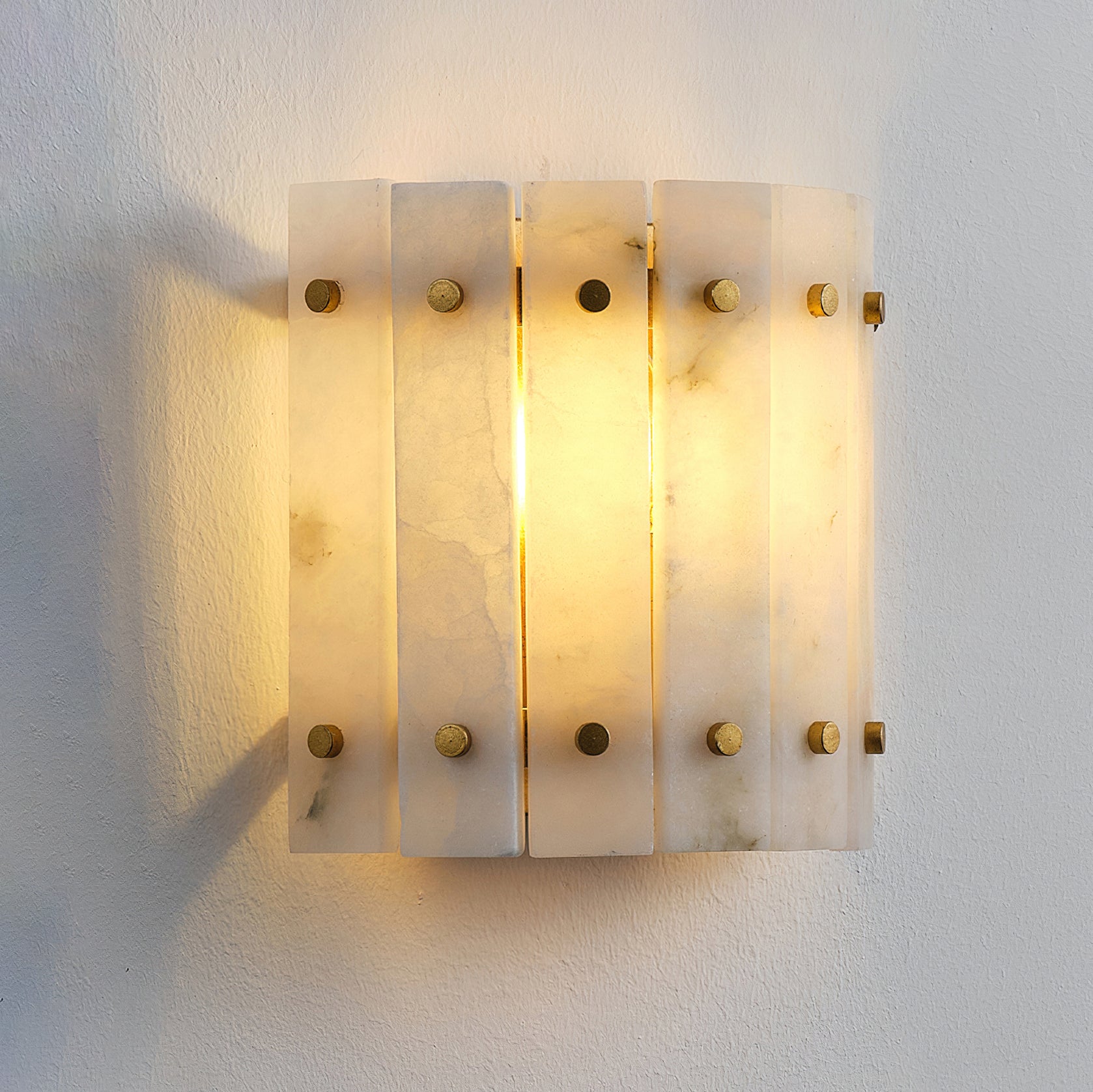 The Regina Wall Lamp by Mooijane combines alabaster and metal for a refined, sculptural design. Multiple alabaster slabs diffuse a warm, soft glow, creating a natural texture reminiscent of ice and snow. Metal rivets and brackets add structure and subtle retro charm. Its elegant square silhouette enhances hallways, bedrooms, or living rooms, bringing sophisticated ambiance and artistic flair to any space.