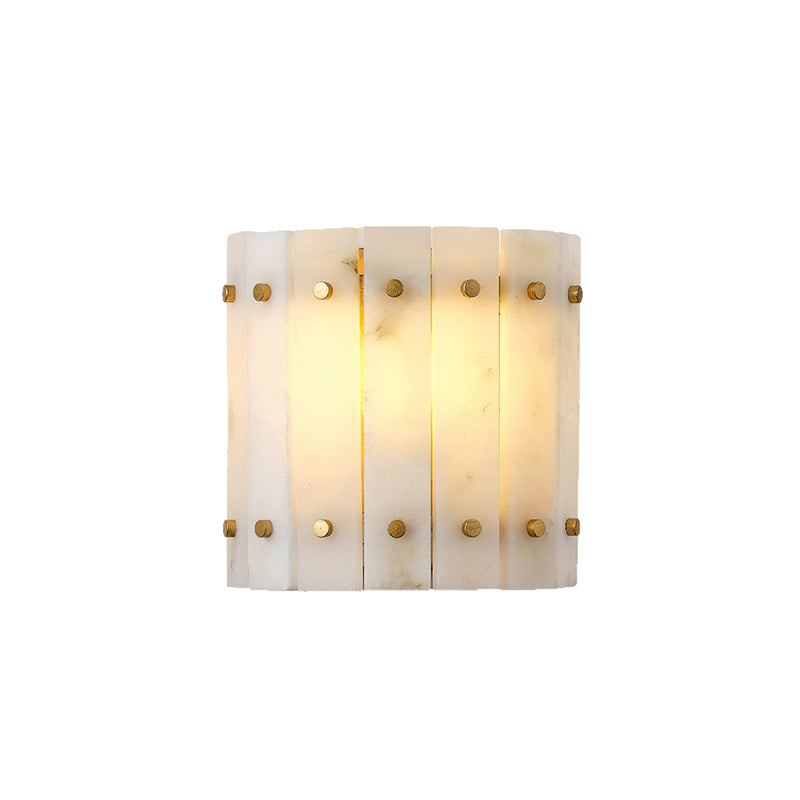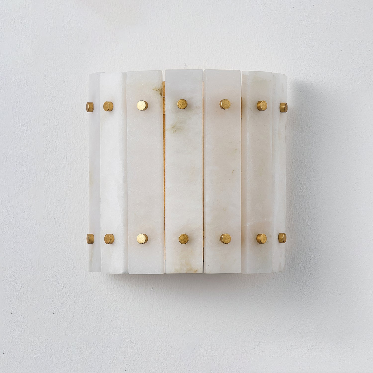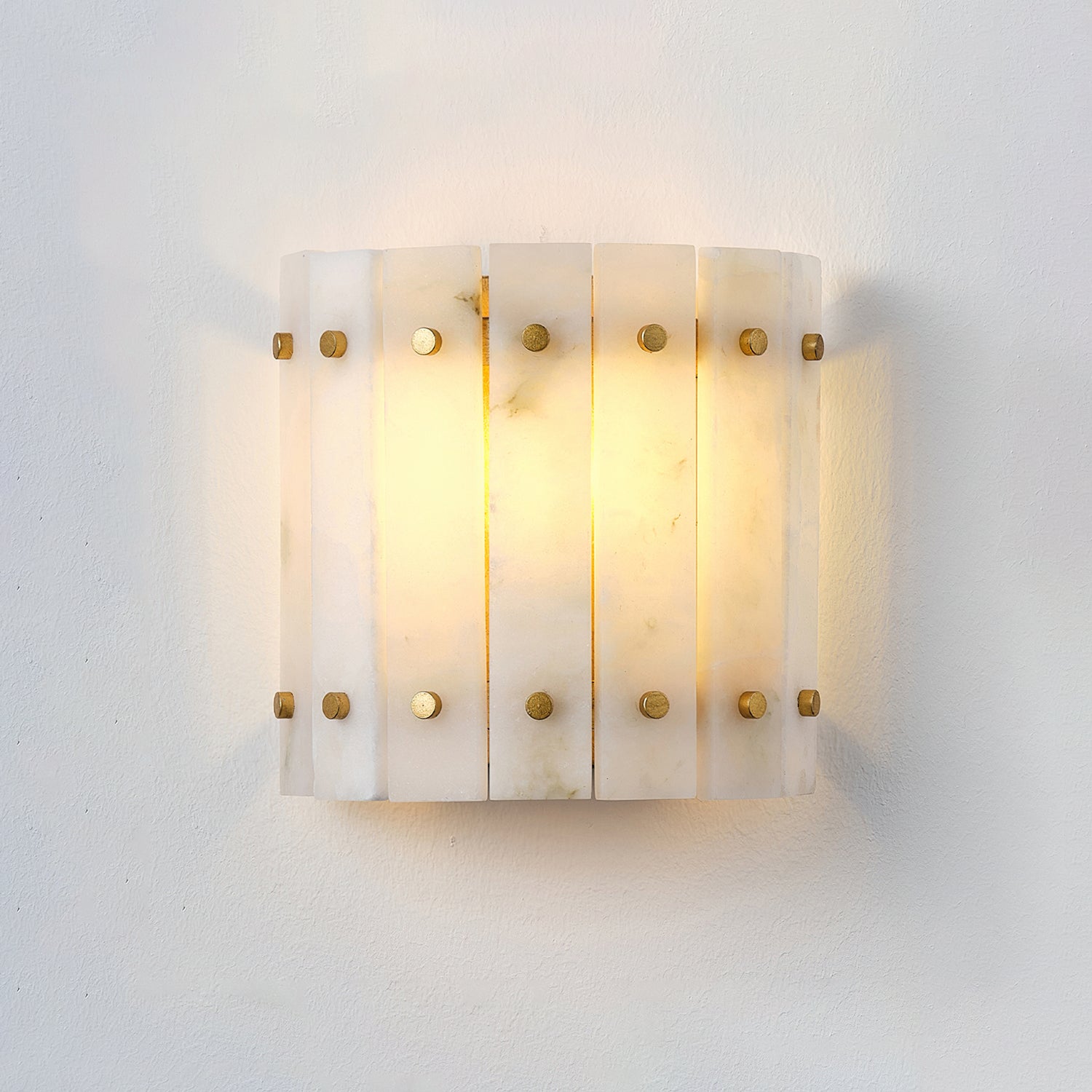 The Regina Wall Lamp by Mooijane combines alabaster and metal for a refined, sculptural design. Multiple alabaster slabs diffuse a warm, soft glow, creating a natural texture reminiscent of ice and snow. Metal rivets and brackets add structure and subtle retro charm. Its elegant square silhouette enhances hallways, bedrooms, or living rooms, bringing sophisticated ambiance and artistic flair to any space.