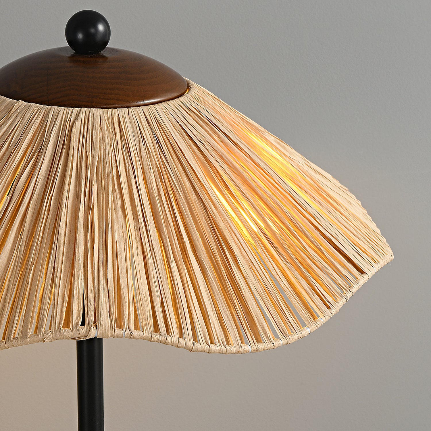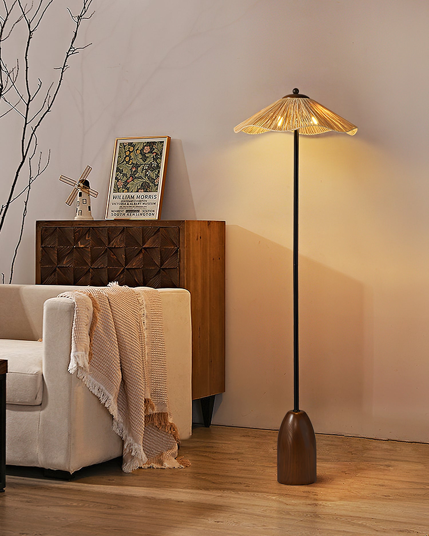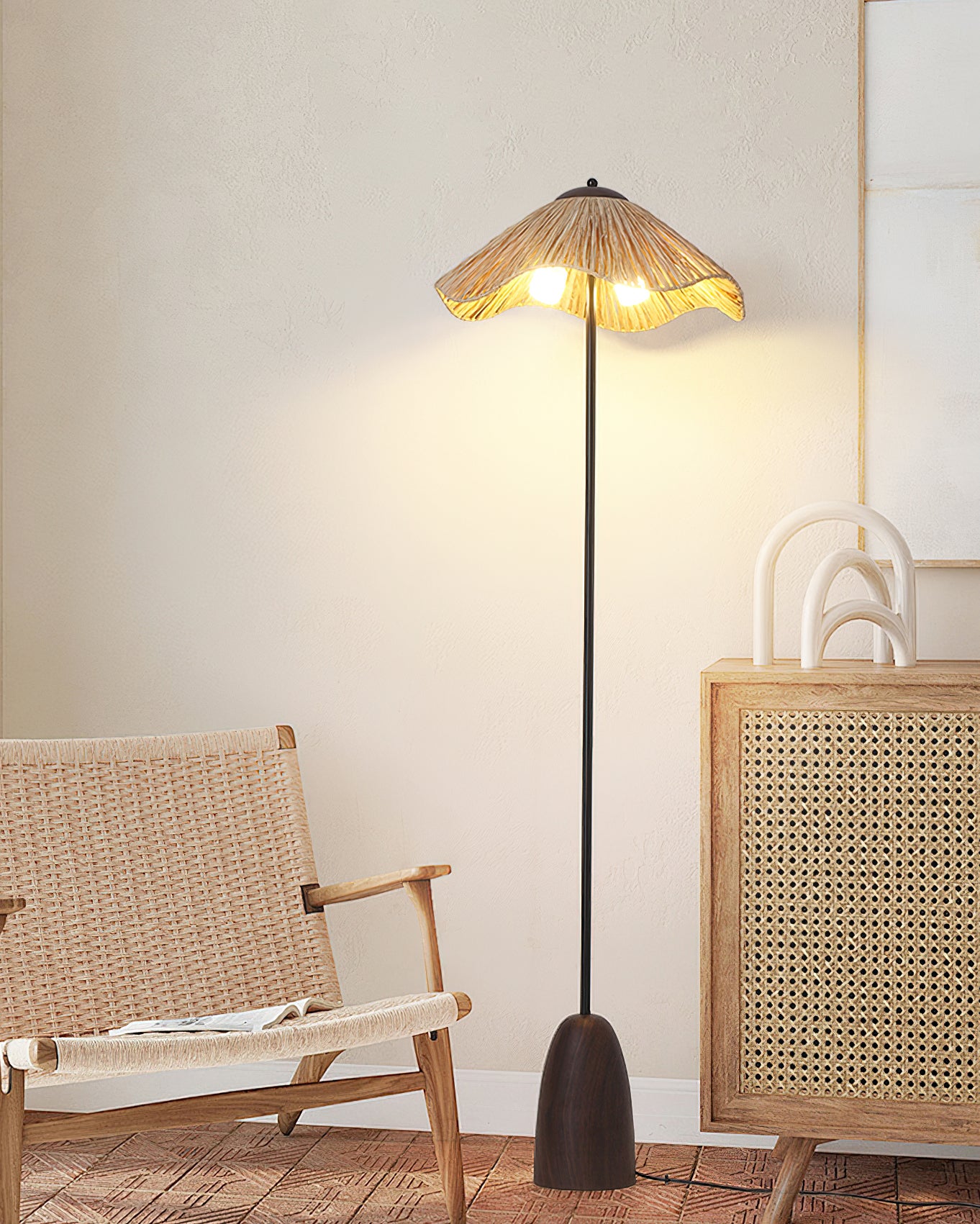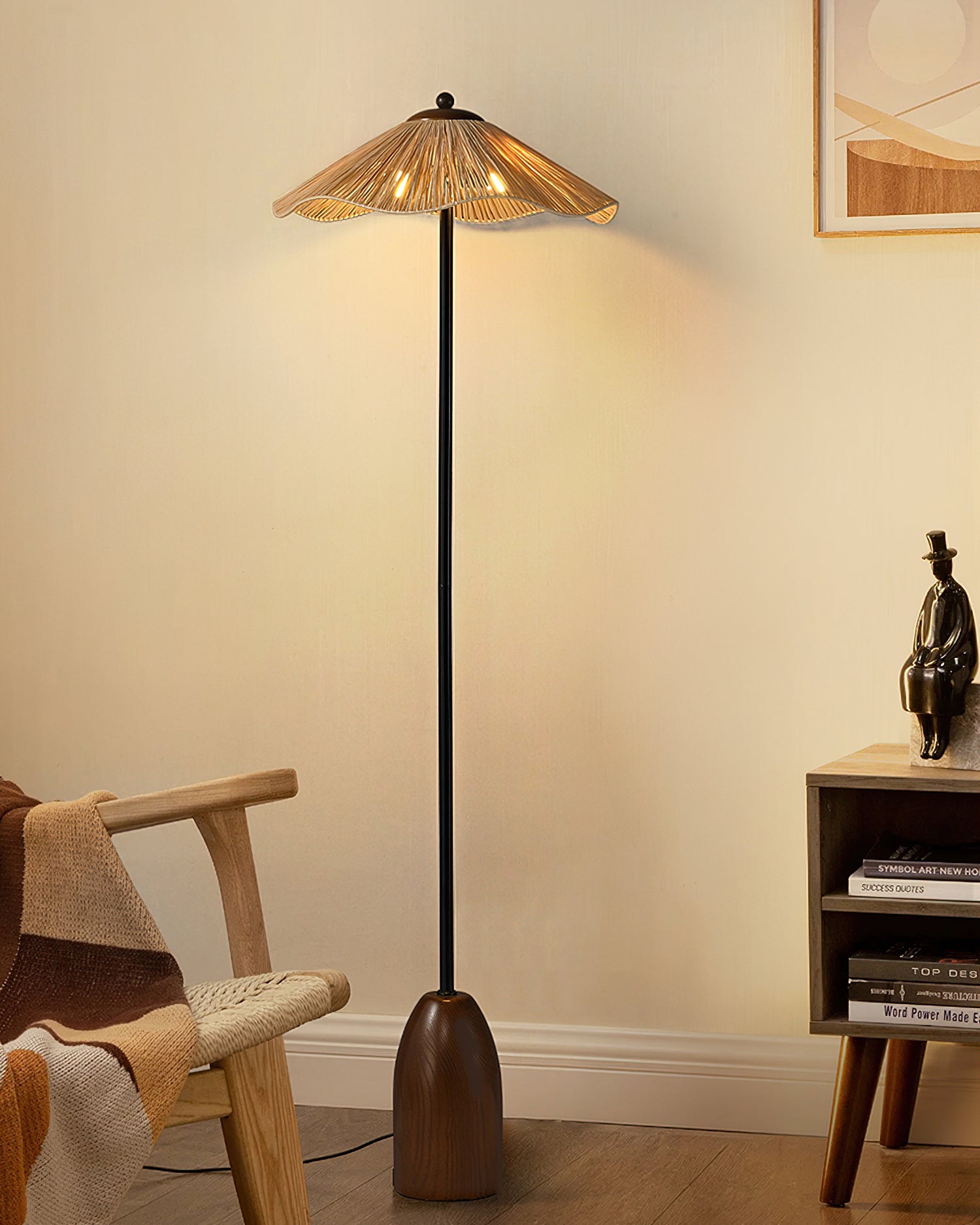 Experience the perfect combination of natural beauty and modern design with the Retro Straw Hat Floor Lamp. The raffia shade, resembling a delicate flower, creates a tranquil ambiance with its soft, warm light. The sleek black metal stand and wooden base add a touch of sophistication, making it a versatile addition to any interior.