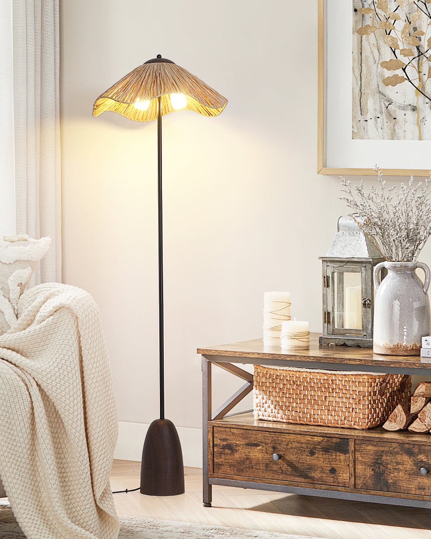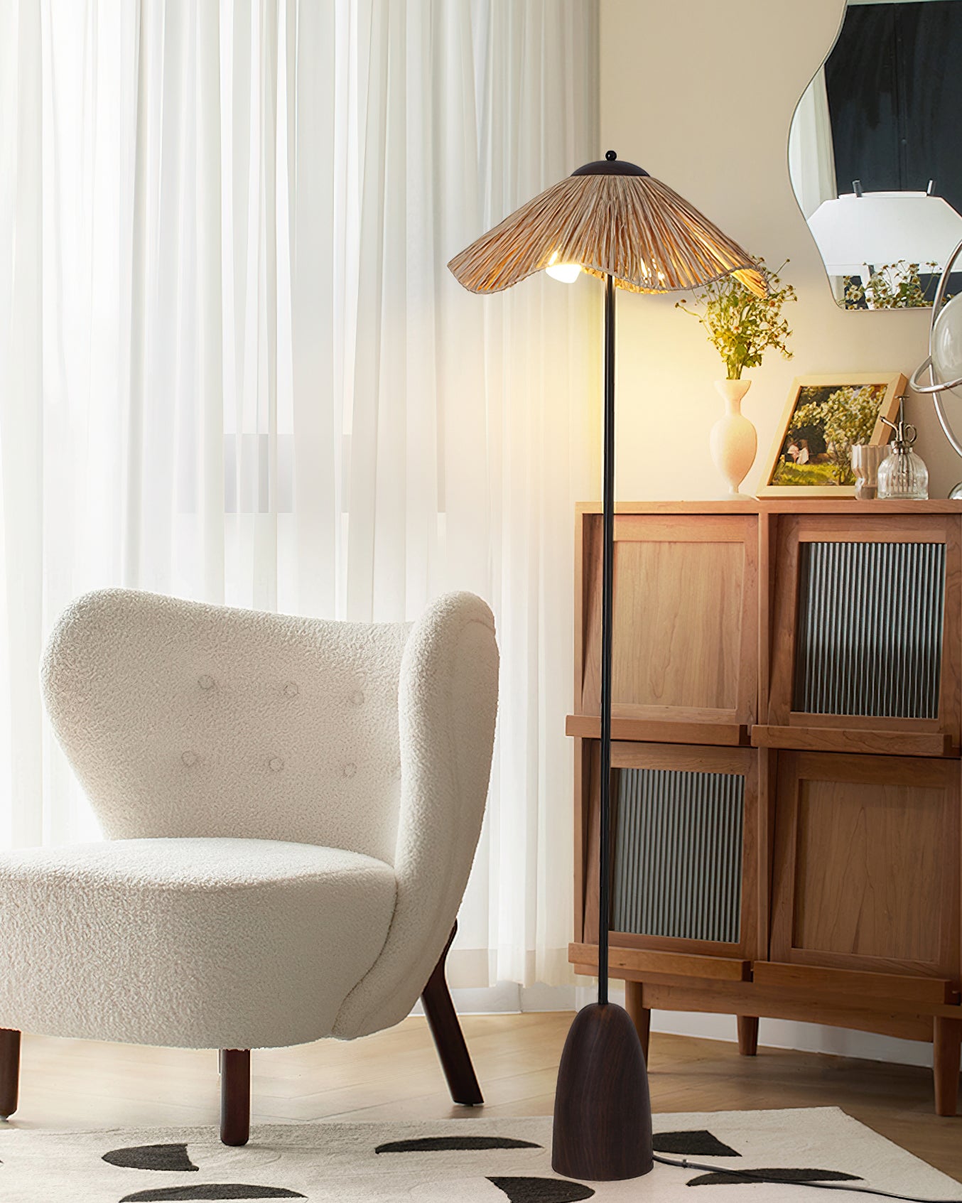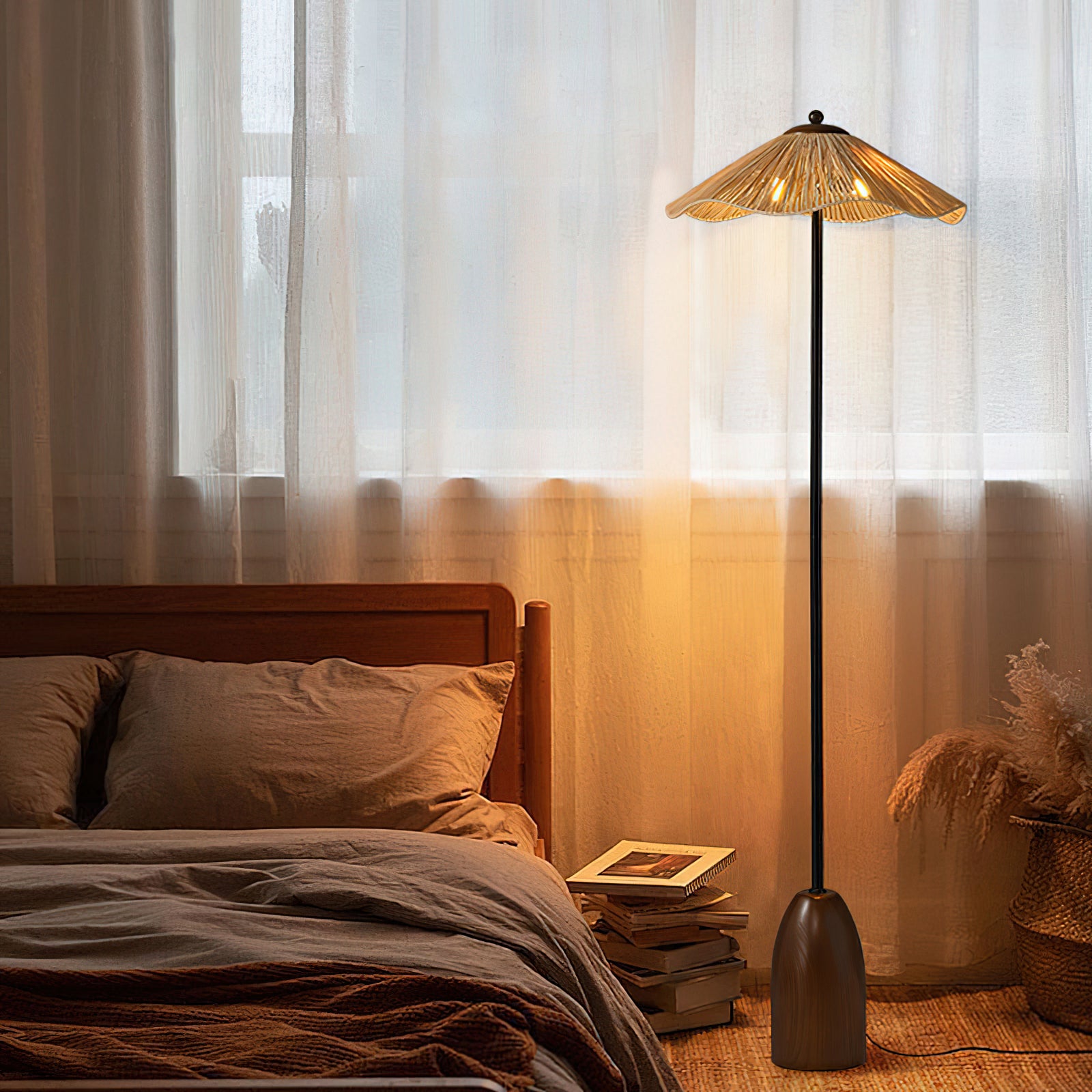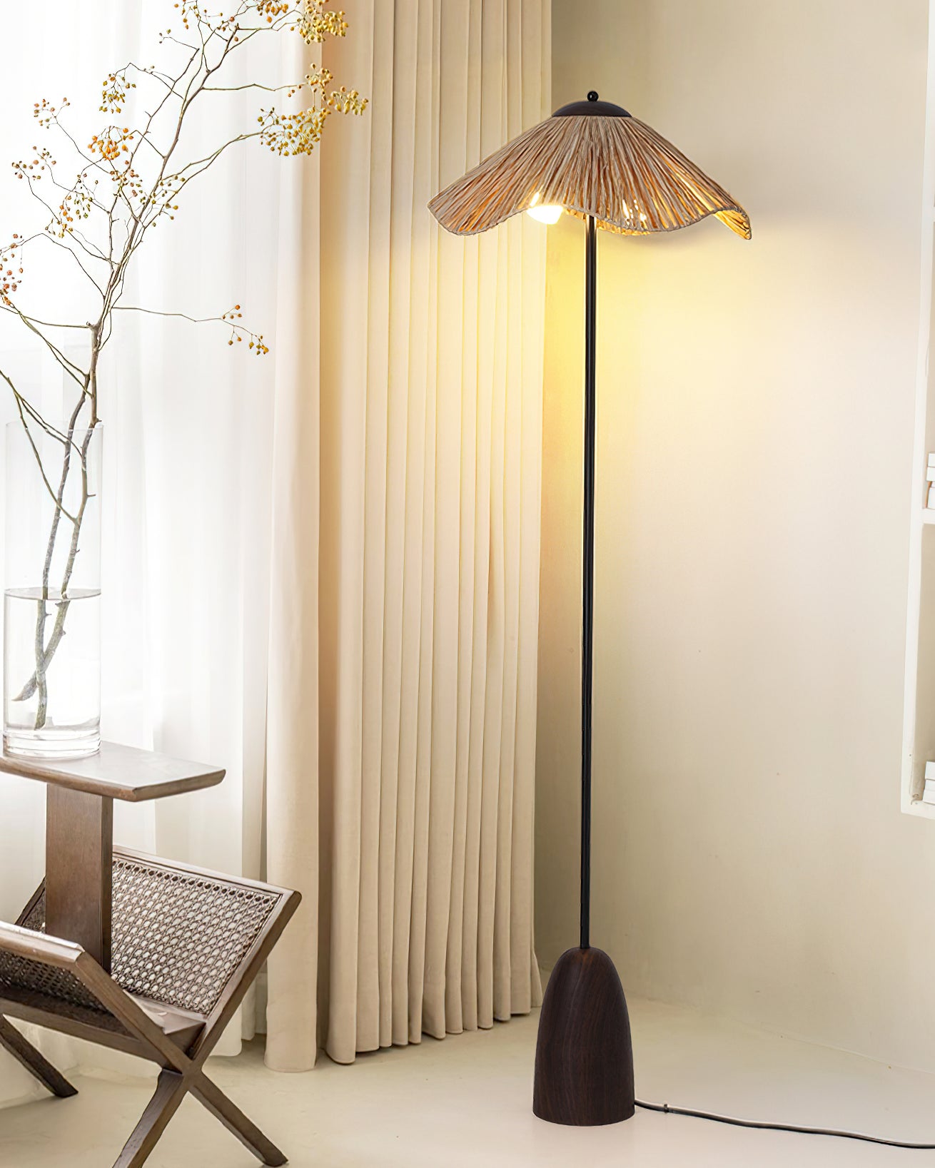 Experience the perfect combination of natural beauty and modern design with the Retro Straw Hat Floor Lamp. The raffia shade, resembling a delicate flower, creates a tranquil ambiance with its soft, warm light. The sleek black metal stand and wooden base add a touch of sophistication, making it a versatile addition to any interior.