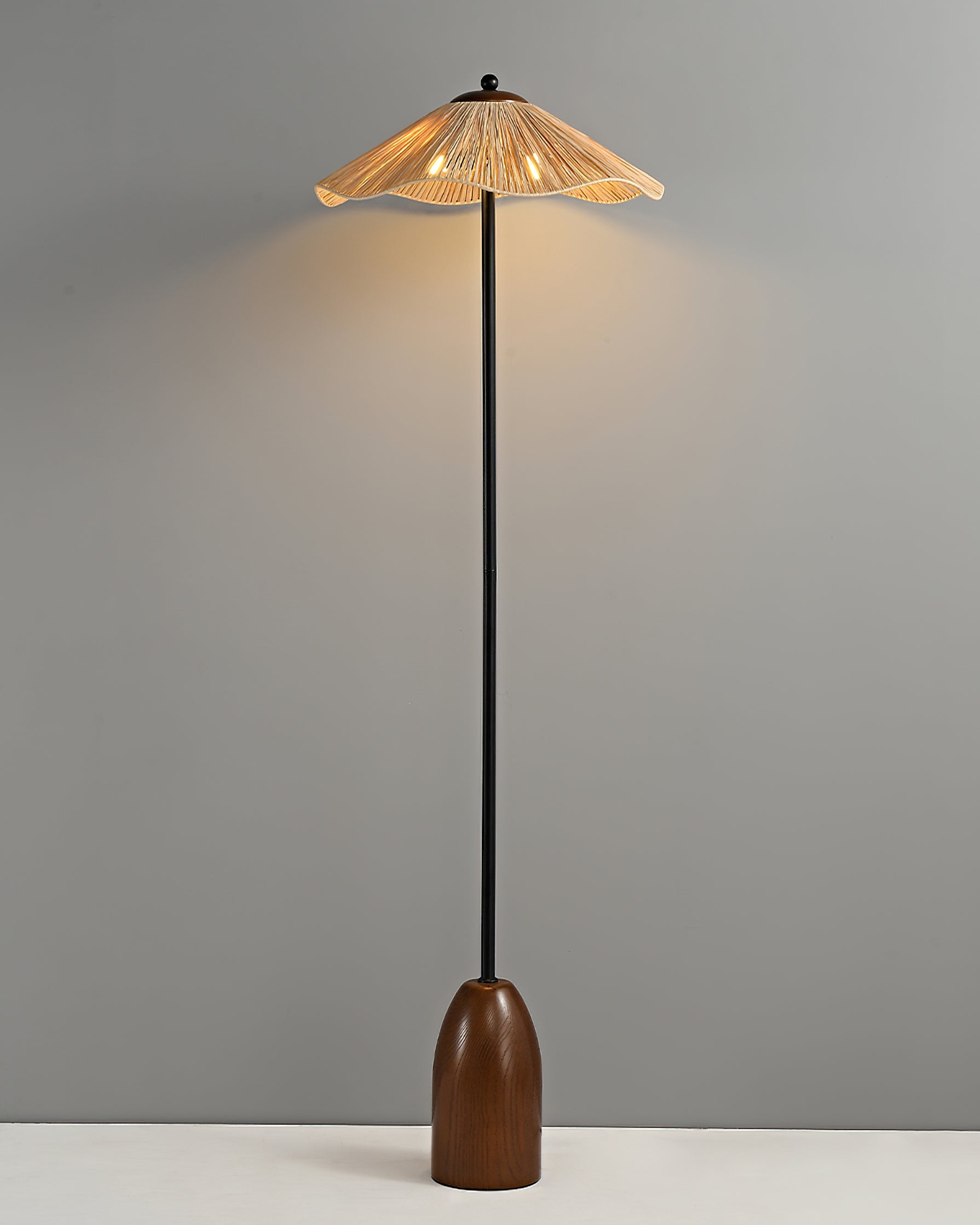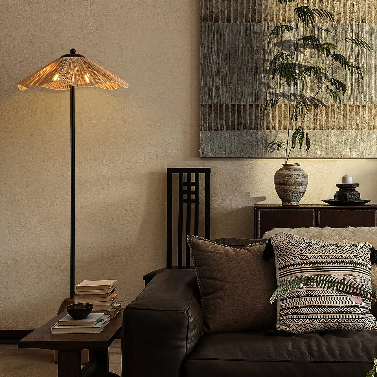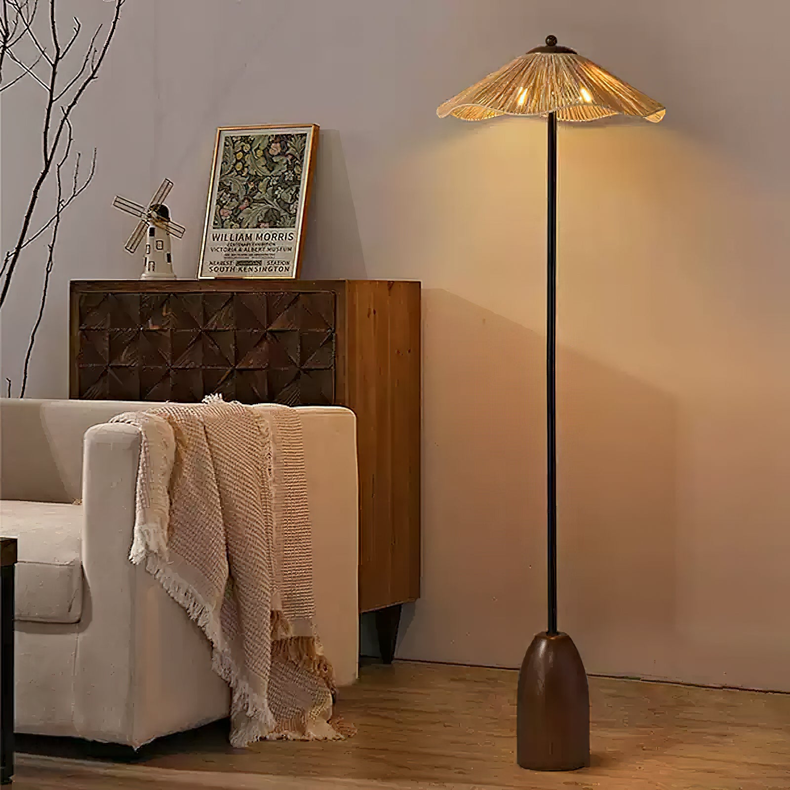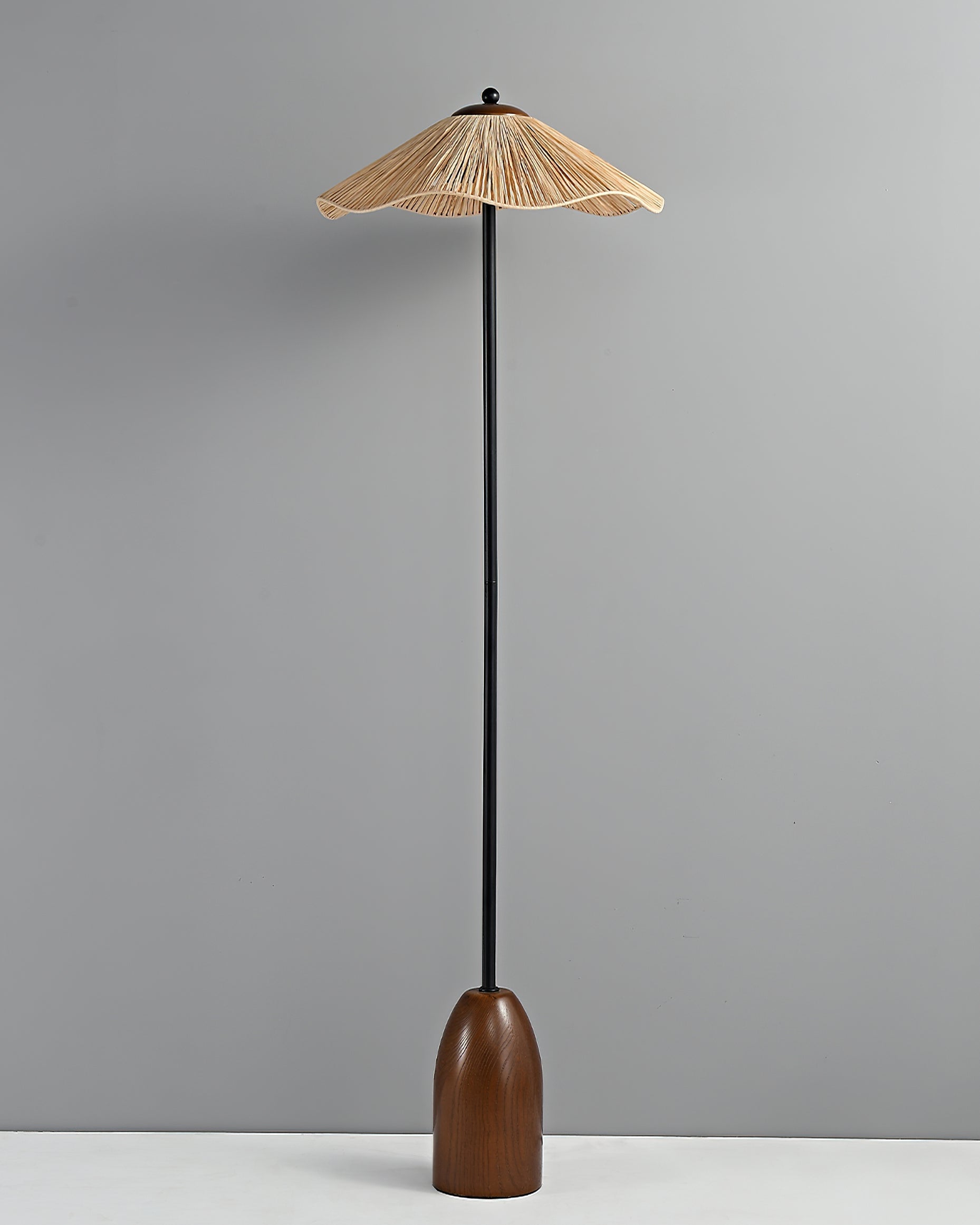 Experience the perfect combination of natural beauty and modern design with the Retro Straw Hat Floor Lamp. The raffia shade, resembling a delicate flower, creates a tranquil ambiance with its soft, warm light. The sleek black metal stand and wooden base add a touch of sophistication, making it a versatile addition to any interior.