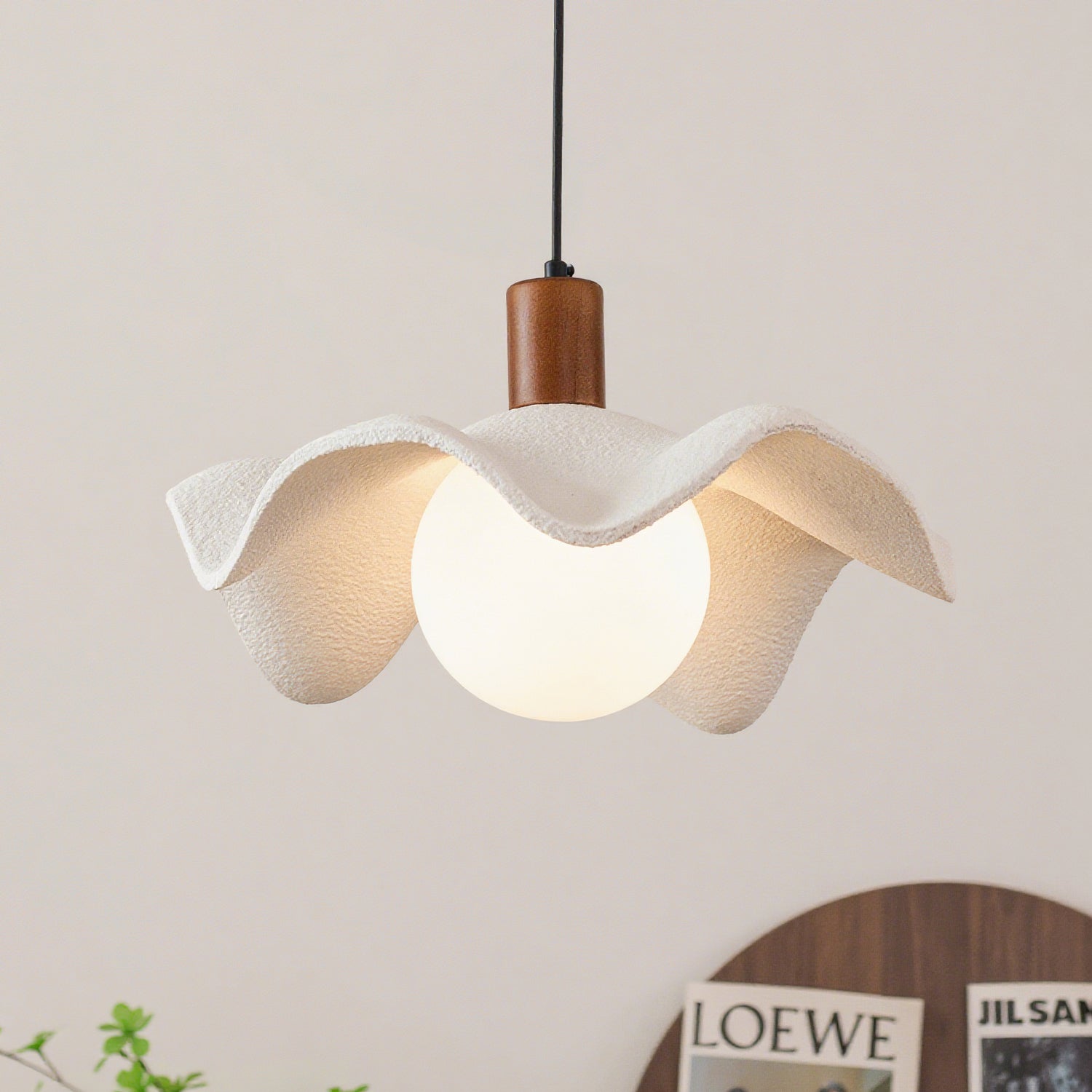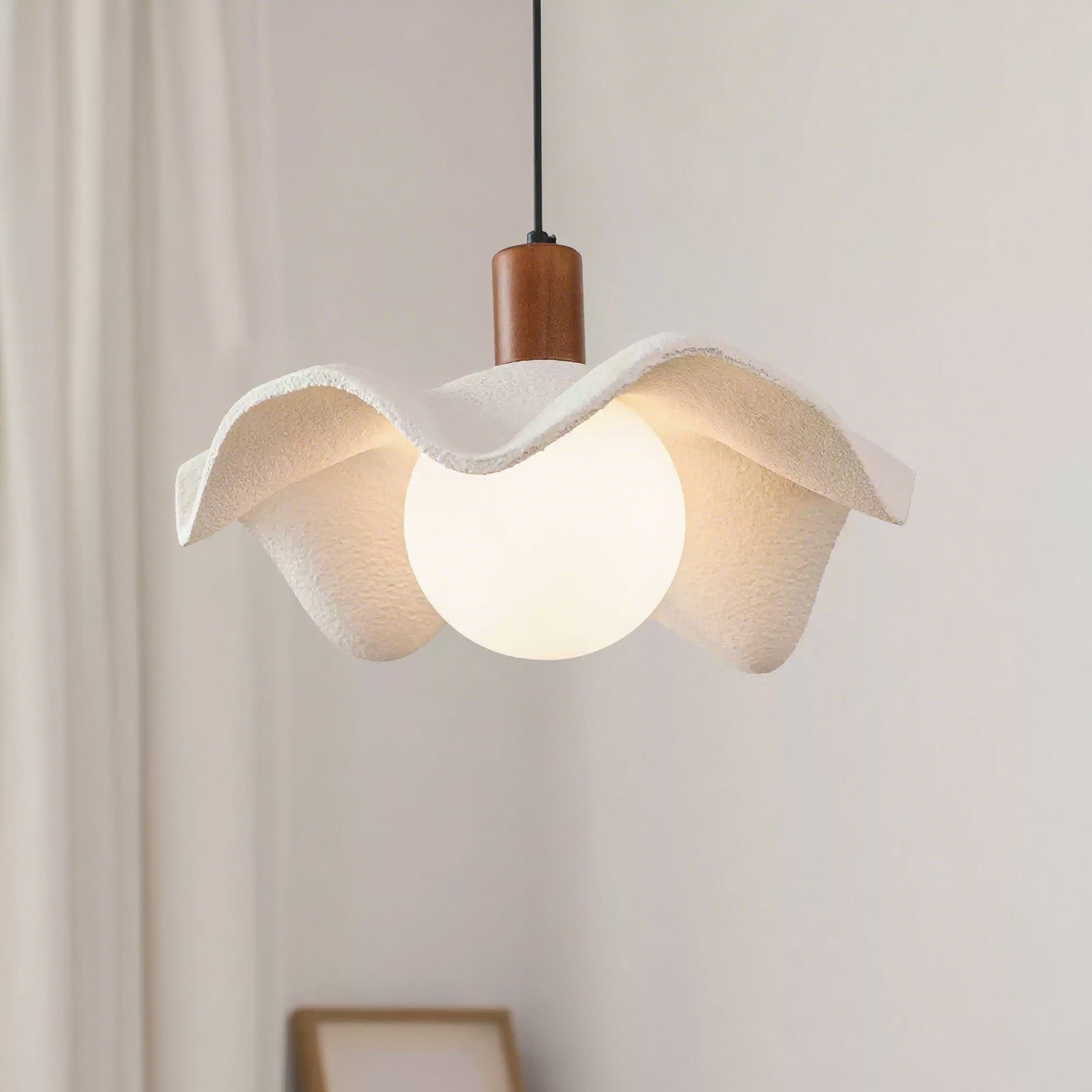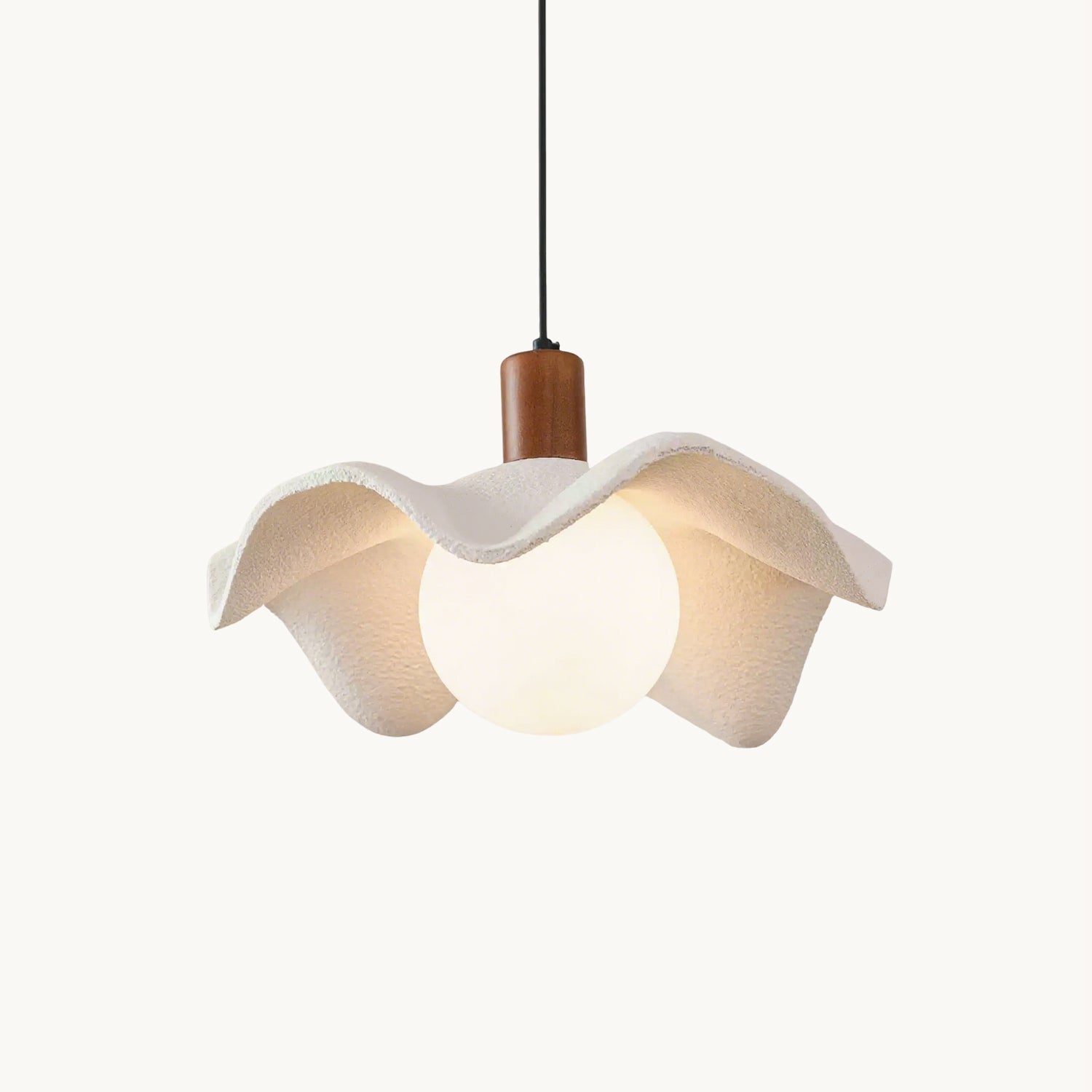 The Riankh Pendant Lamp by Mooijane evokes the fluid elegance of nature with its softly undulating shade and refined matte finish, offering a handcrafted appeal. A warm wooden base introduces organic texture, while the opaline glass bulb diffuses a gentle, even light for a serene, artistic atmosphere. Ideal for dining rooms, bedrooms, or reading nooks, it combines sophistication with everyday comfort to enhance any interior.