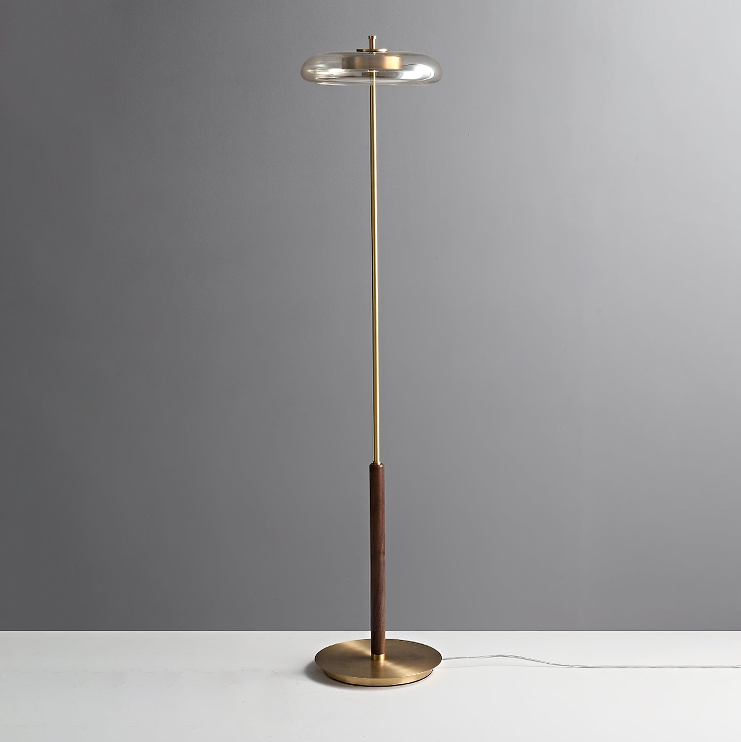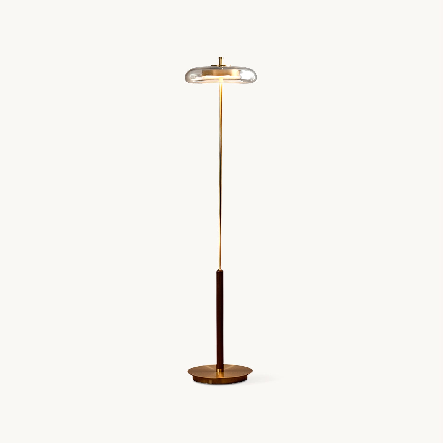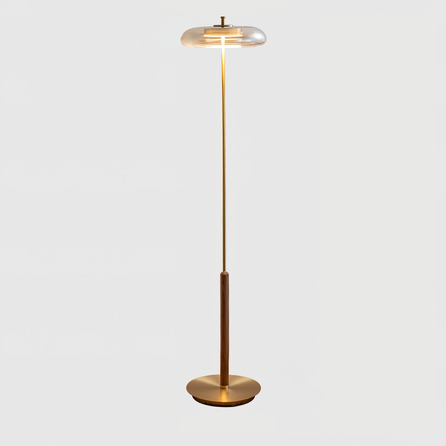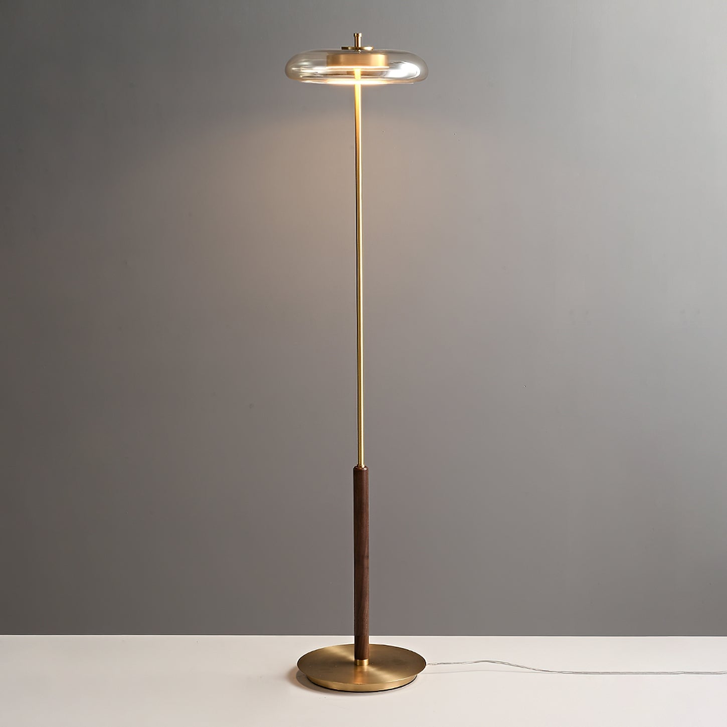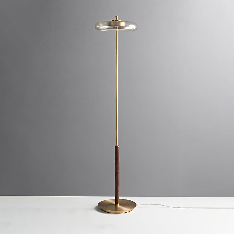 Elevate your home decor with the Ronaldo Floor Lamp from Mooijane. Crafted with premium walnut wood, polished brass, and a sleek glass lampshade, this lamp exudes elegance and sophistication. Create a cozy and warm ambiance in any room with its warm light. Add a touch of luxury to your modern, transitional, or minimalist interior.