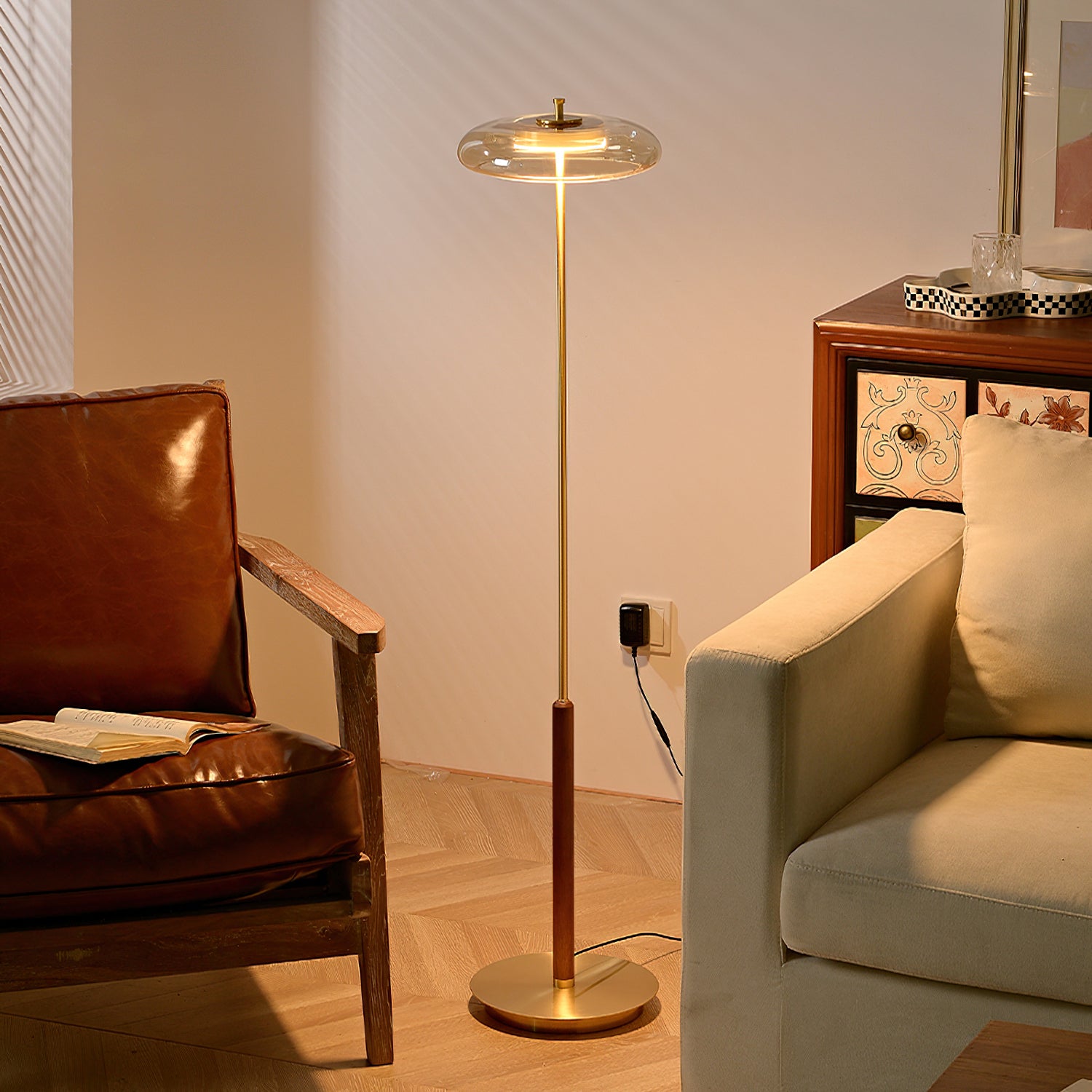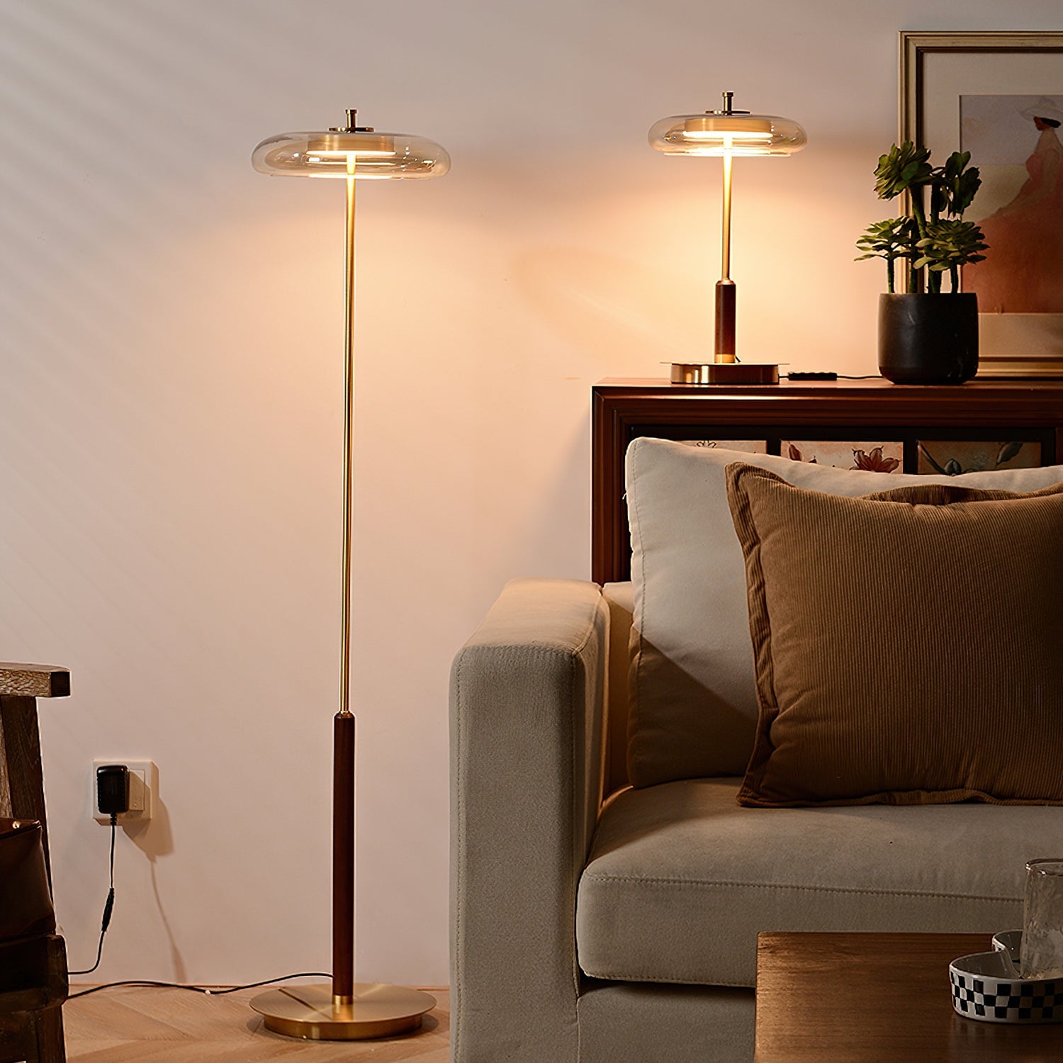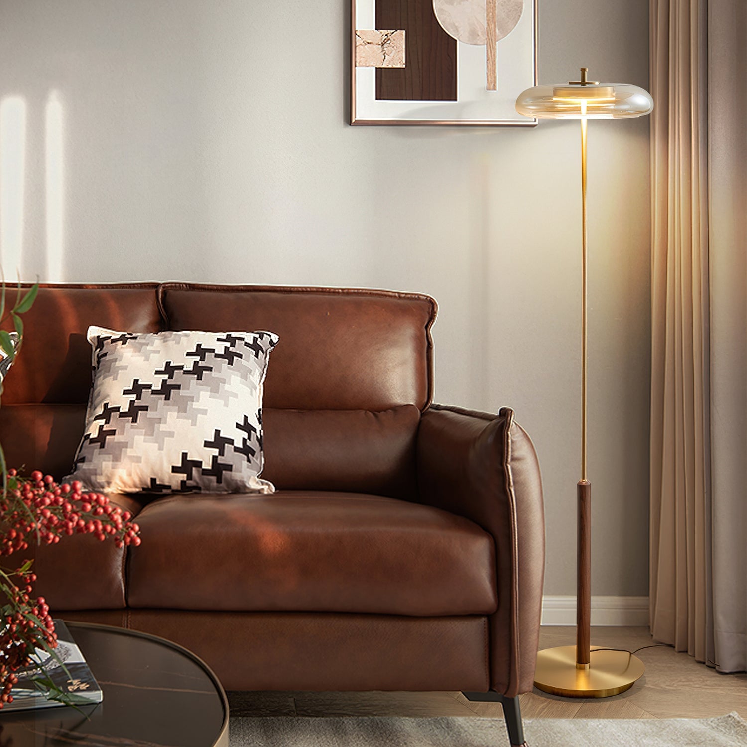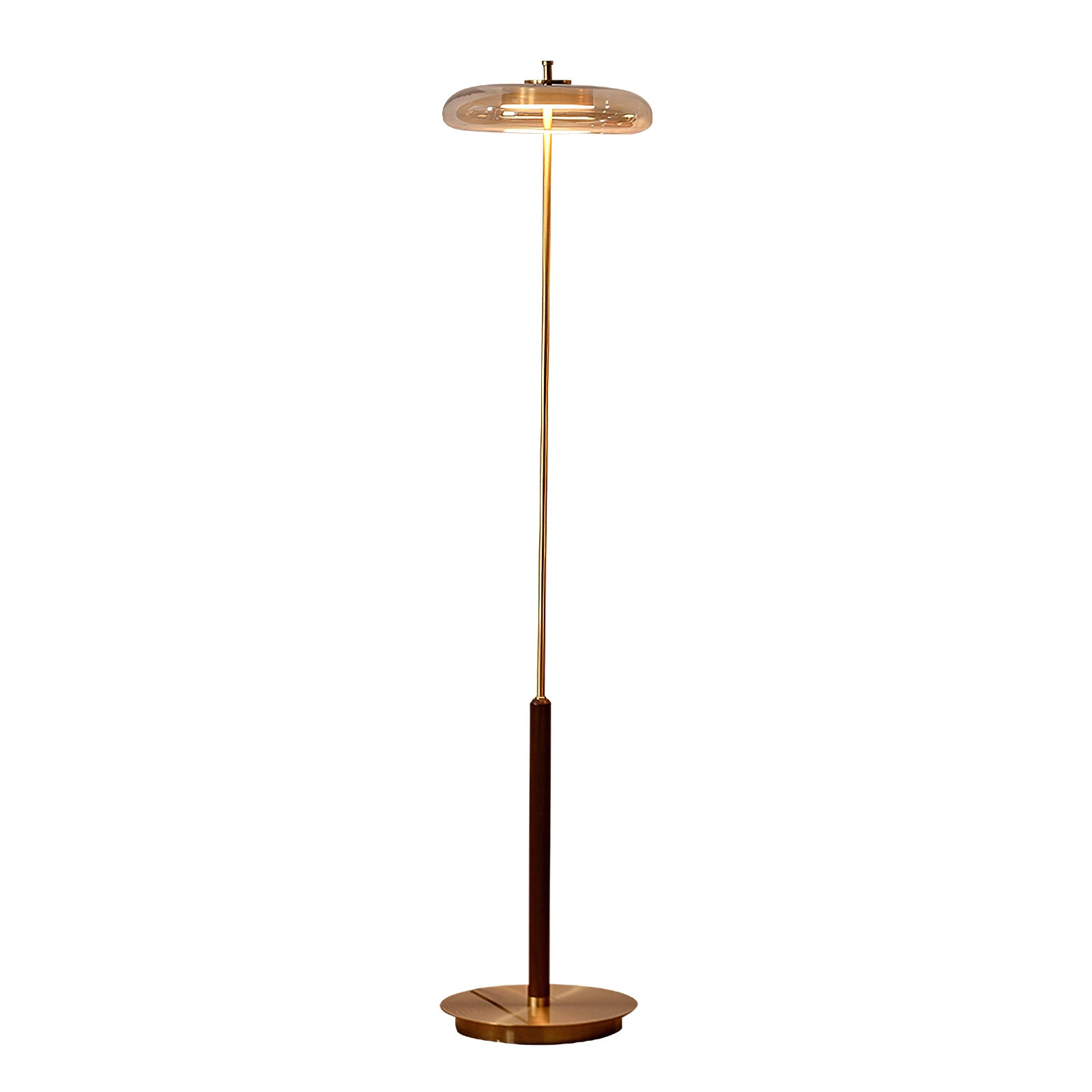 Elevate your home decor with the Ronaldo Floor Lamp from Mooijane. Crafted with premium walnut wood, polished brass, and a sleek glass lampshade, this lamp exudes elegance and sophistication. Create a cozy and warm ambiance in any room with its warm light. Add a touch of luxury to your modern, transitional, or minimalist interior.