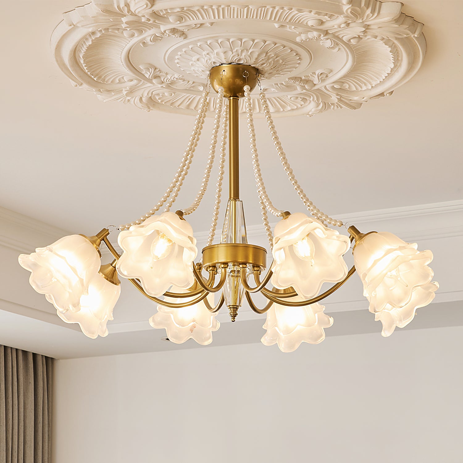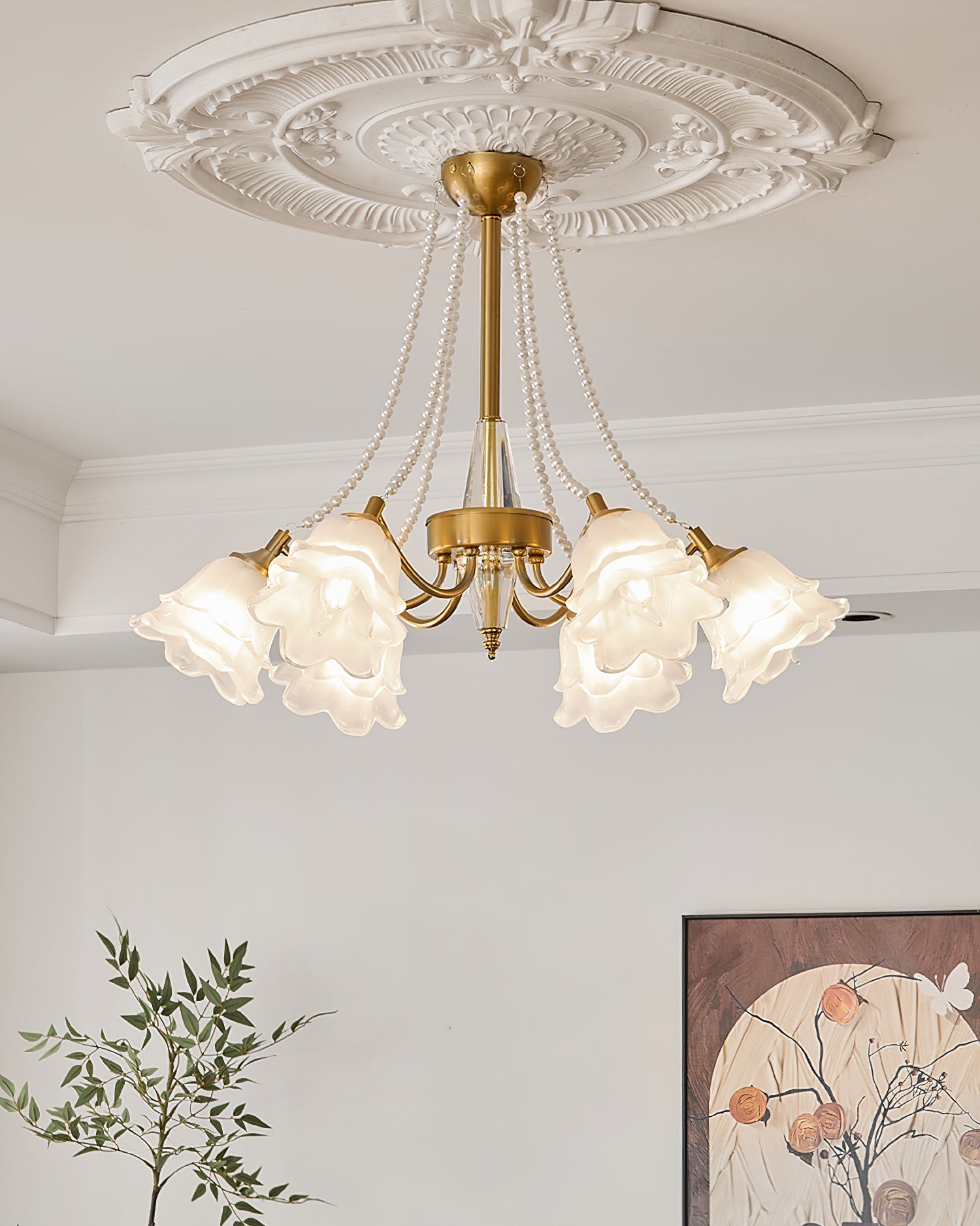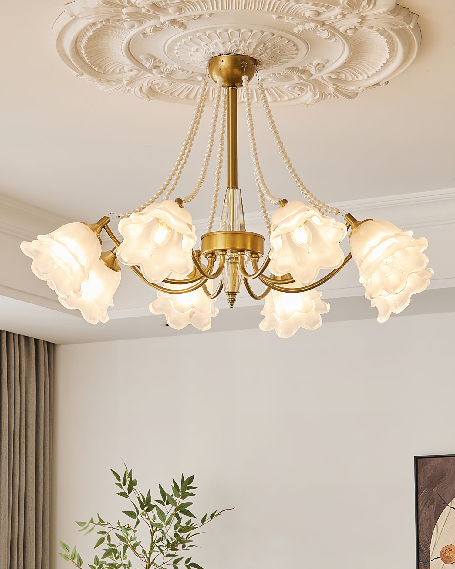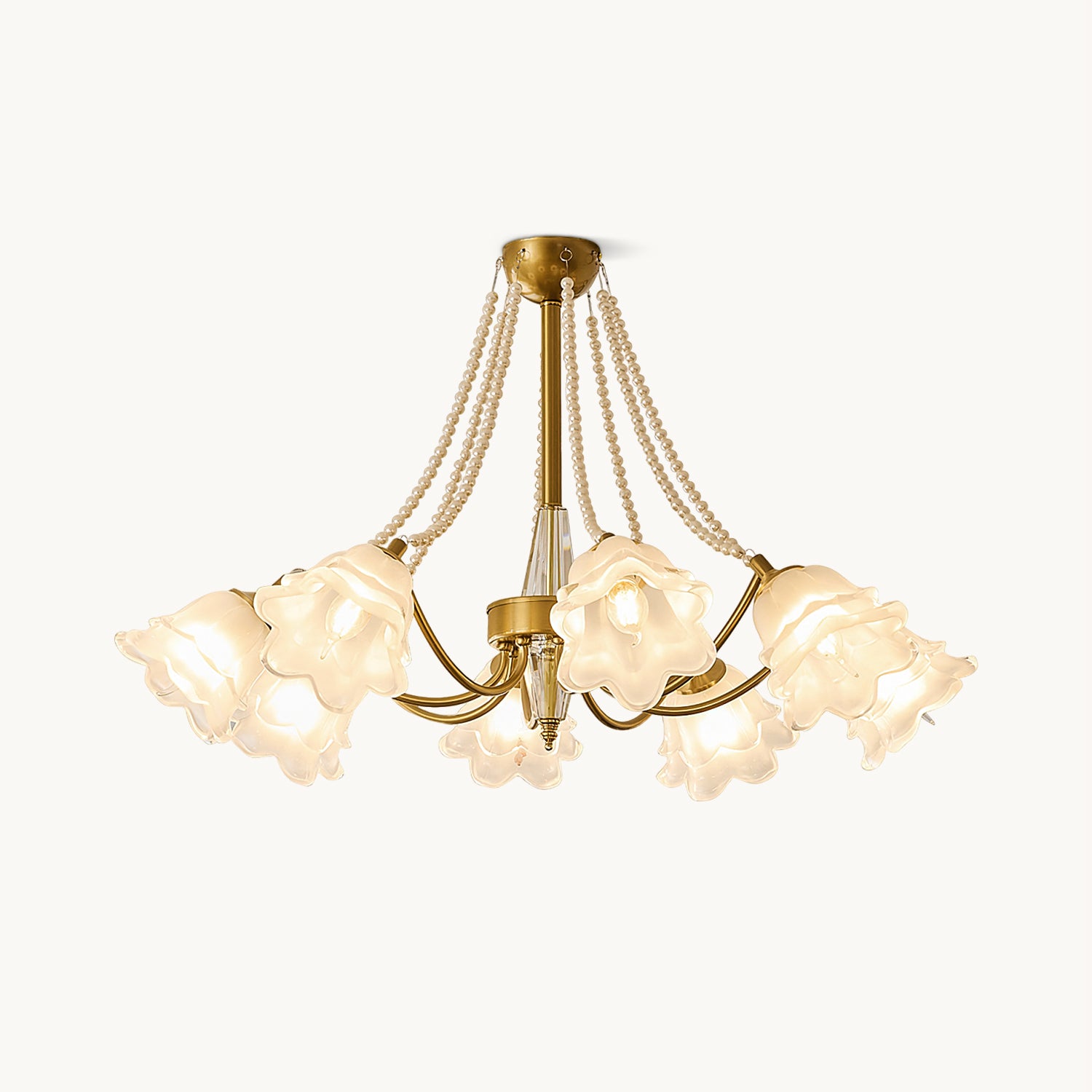 Elevate your living space with the Roses Landi Chandelier from Mooijane. Featuring a bouquet of blooming roses sculpted from luminous glass, this chandelier captures and reflects light for a dazzling effect. The delicate chains and warm golden tones add a touch of regal opulence to your home.