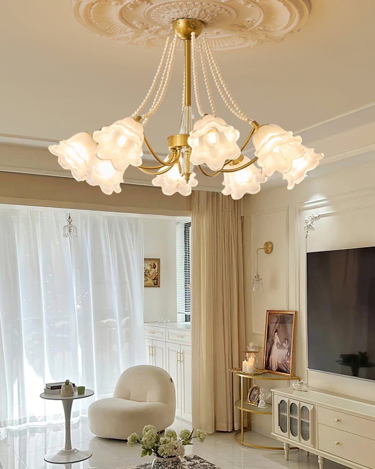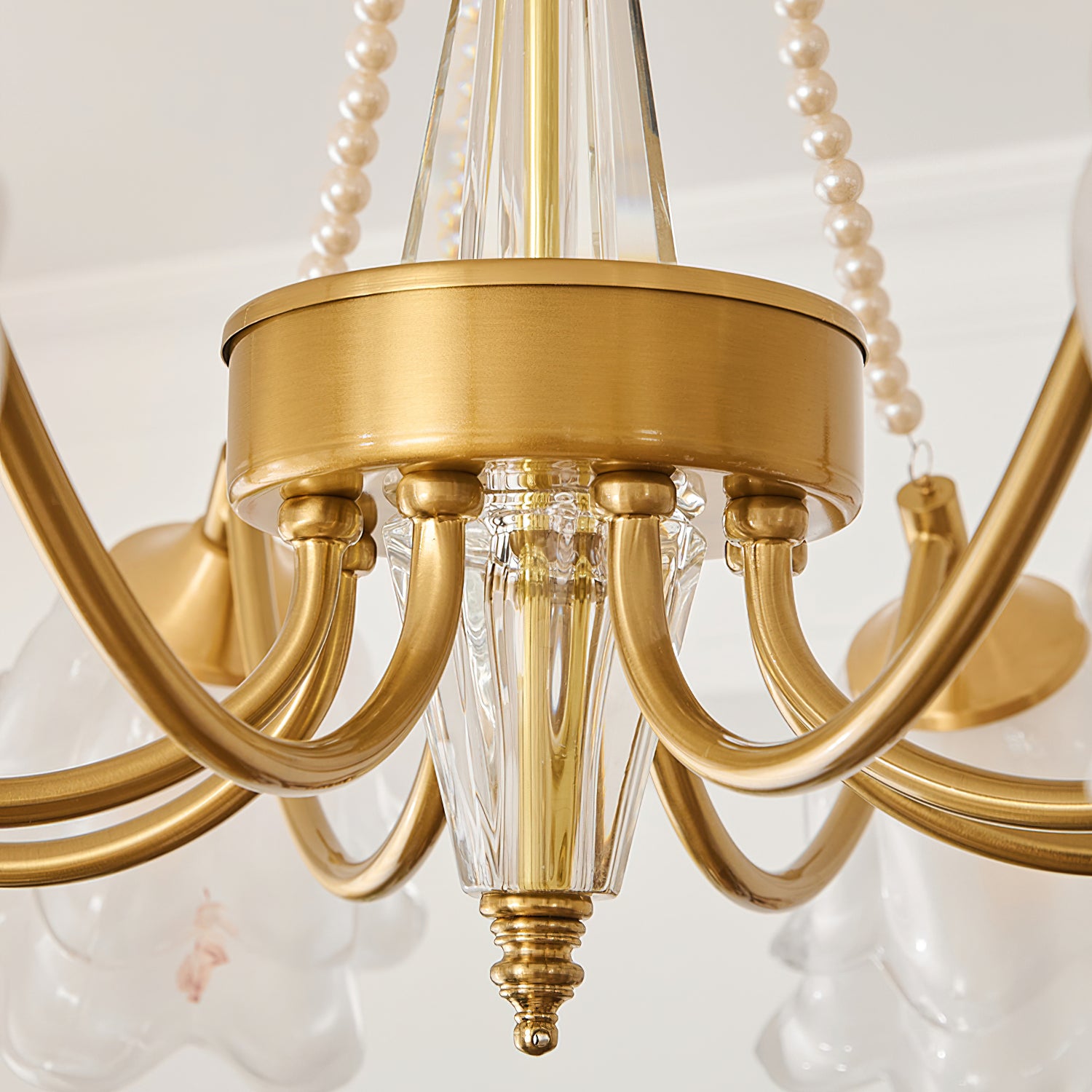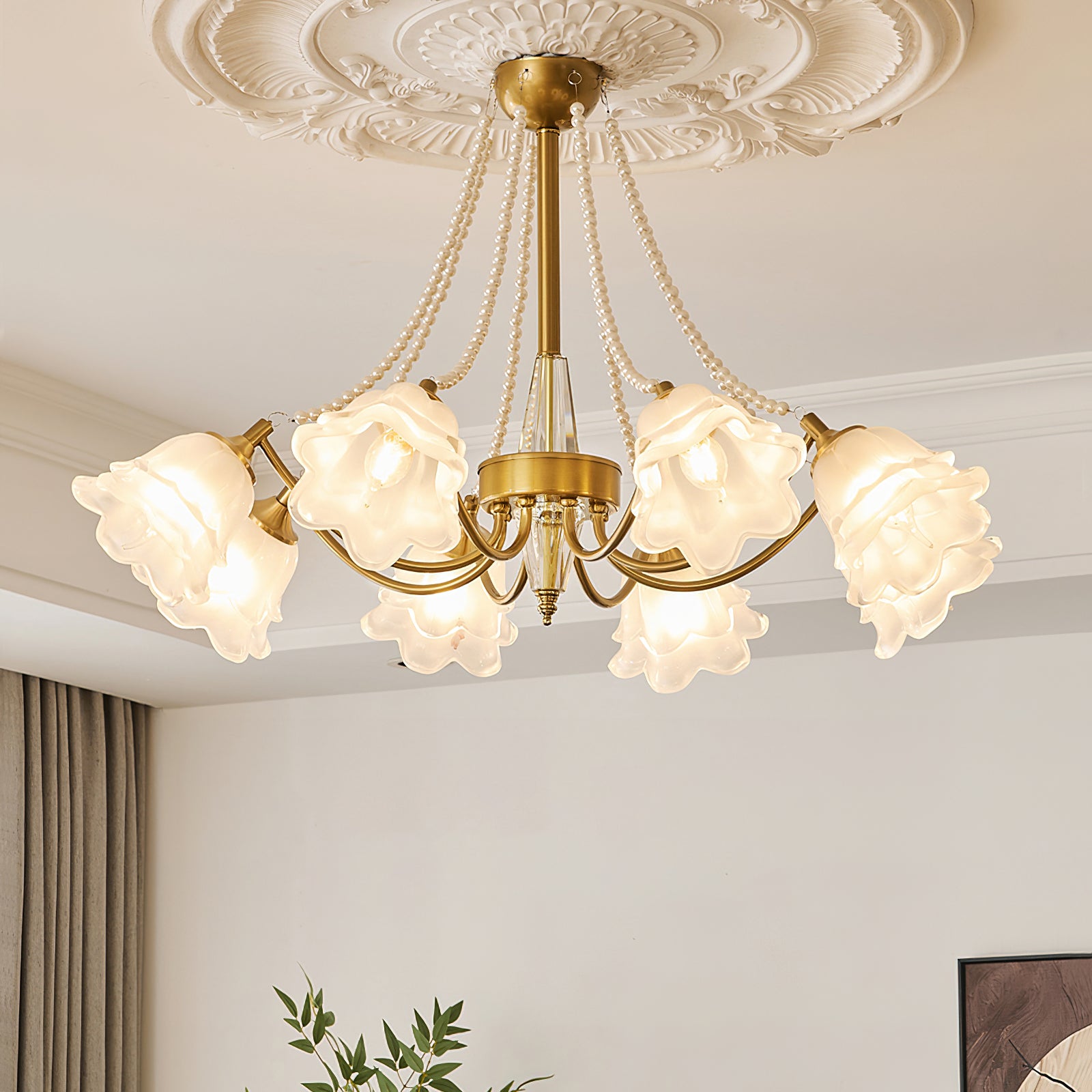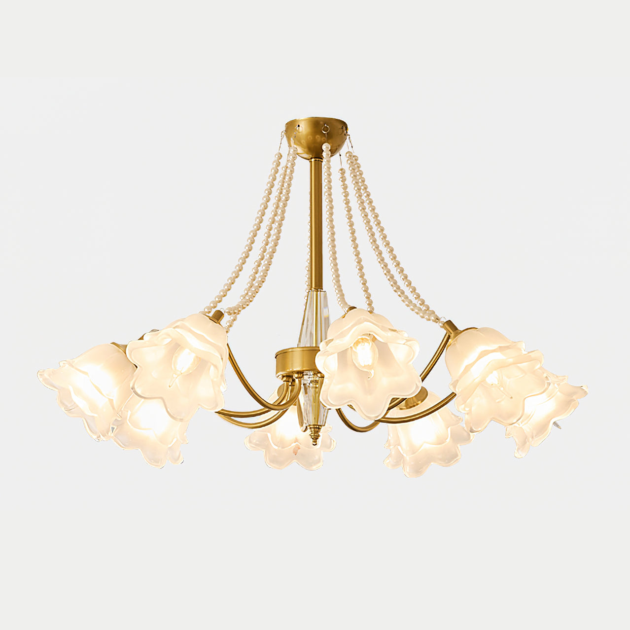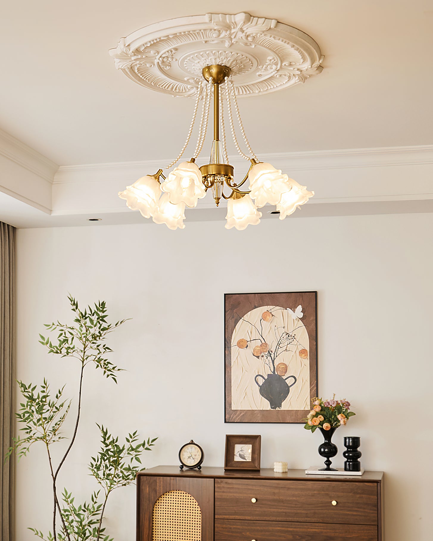 Elevate your living space with the Roses Landi Chandelier from Mooijane. Featuring a bouquet of blooming roses sculpted from luminous glass, this chandelier captures and reflects light for a dazzling effect. The delicate chains and warm golden tones add a touch of regal opulence to your home.