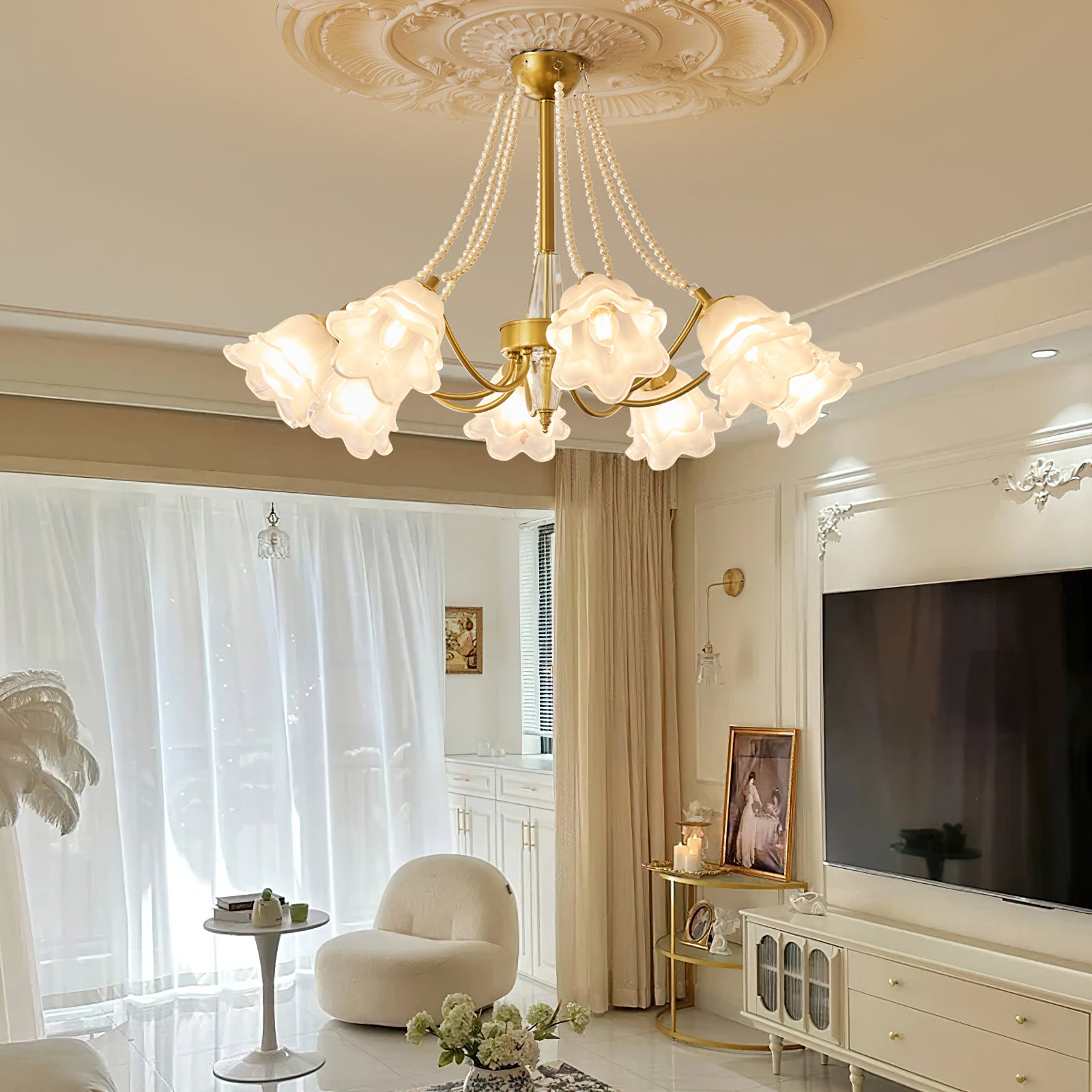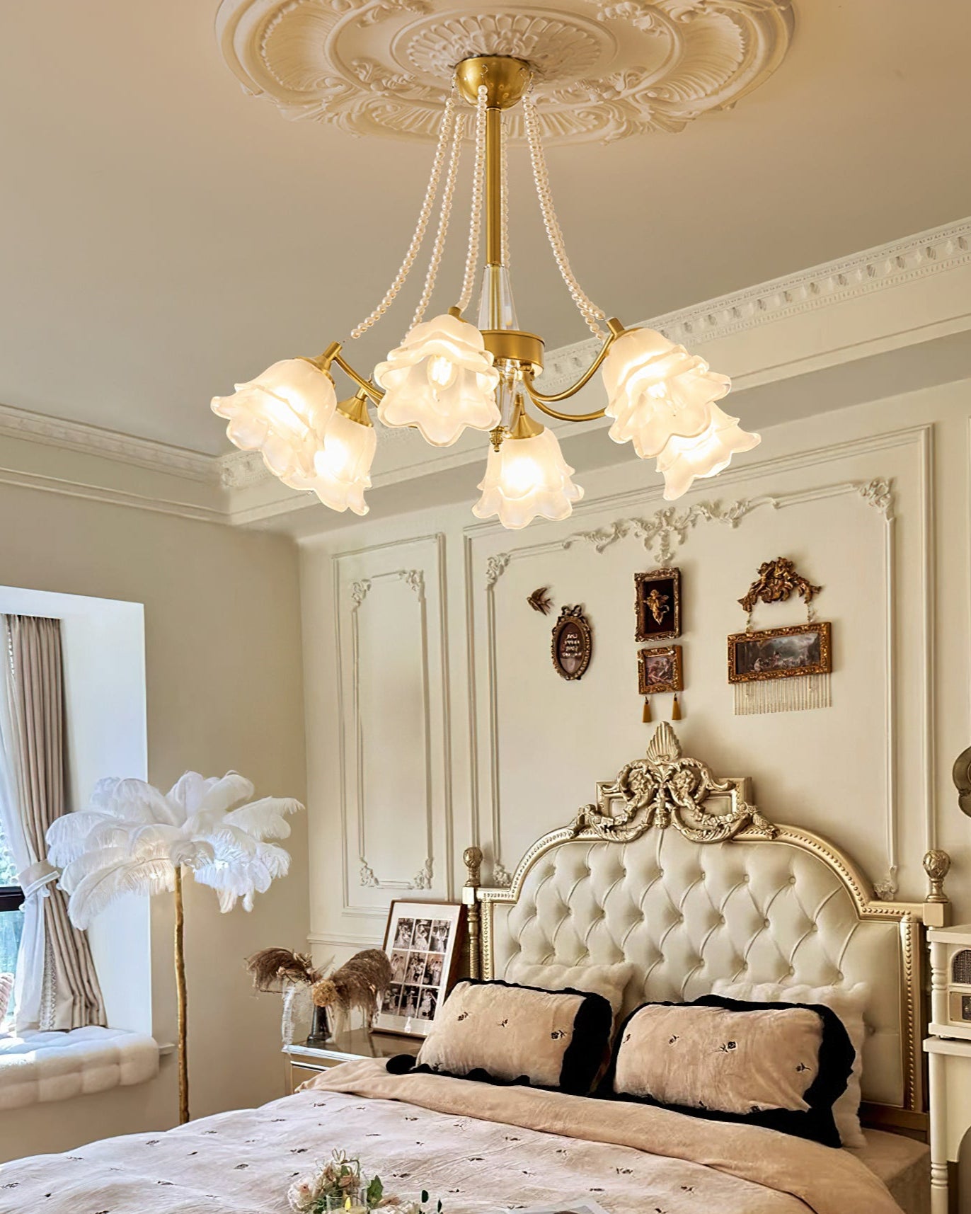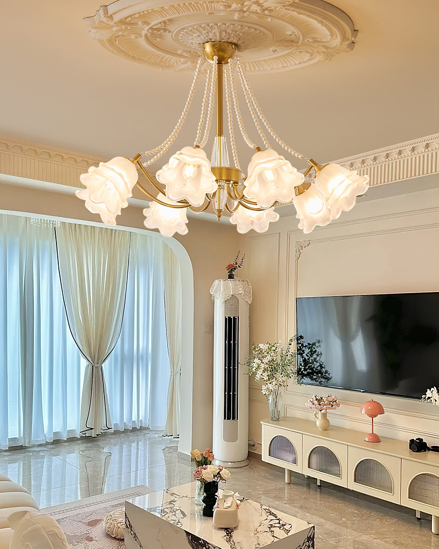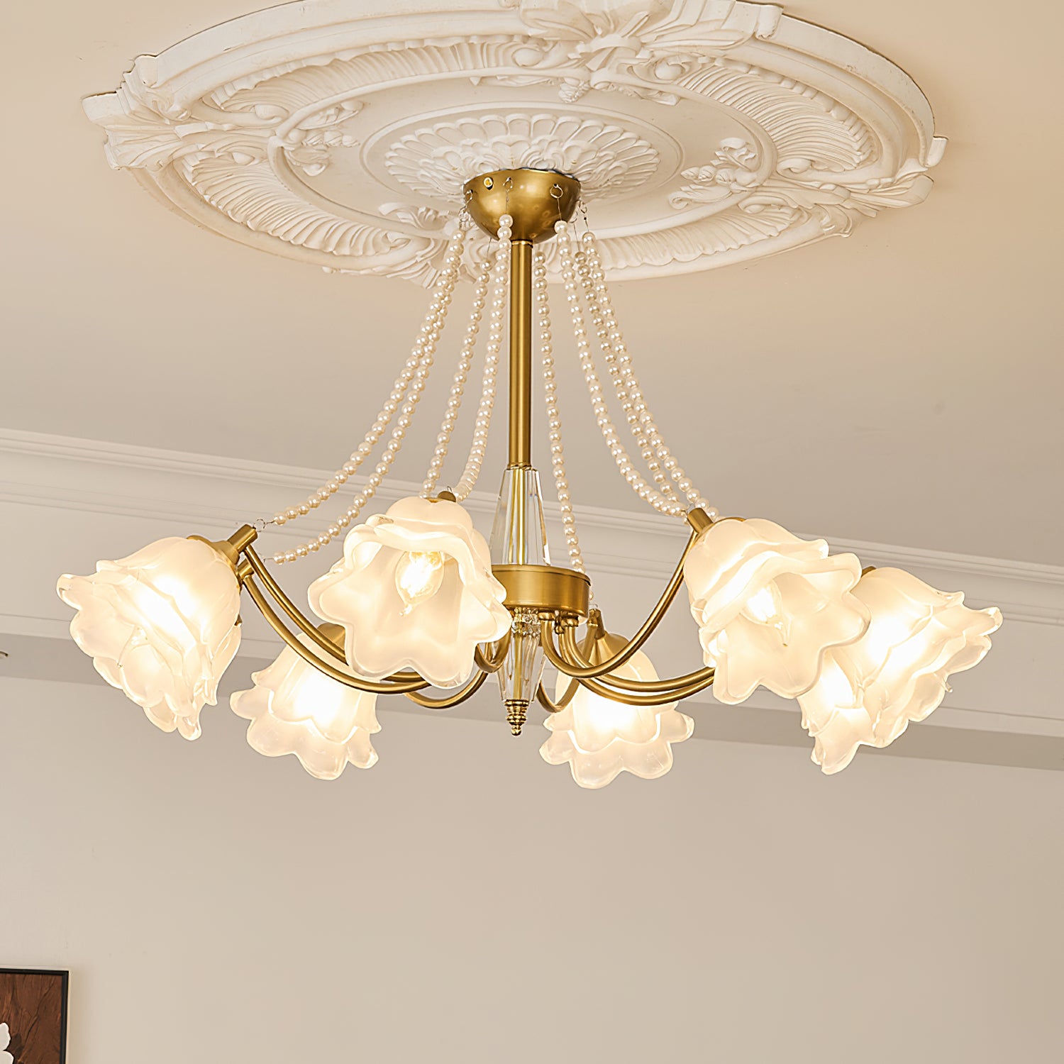 Elevate your living space with the Roses Landi Chandelier from Mooijane. Featuring a bouquet of blooming roses sculpted from luminous glass, this chandelier captures and reflects light for a dazzling effect. The delicate chains and warm golden tones add a touch of regal opulence to your home.