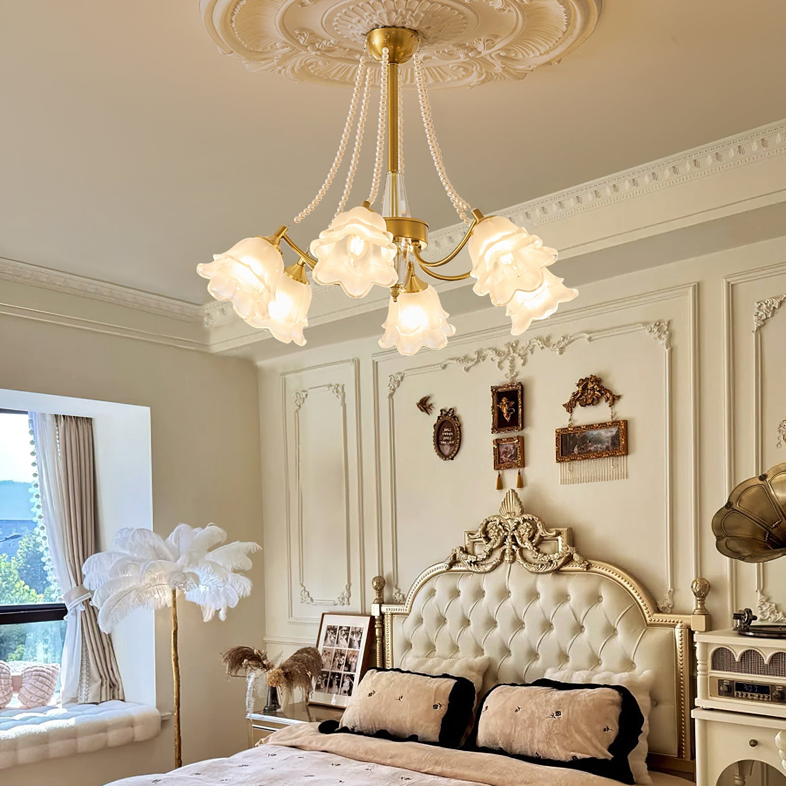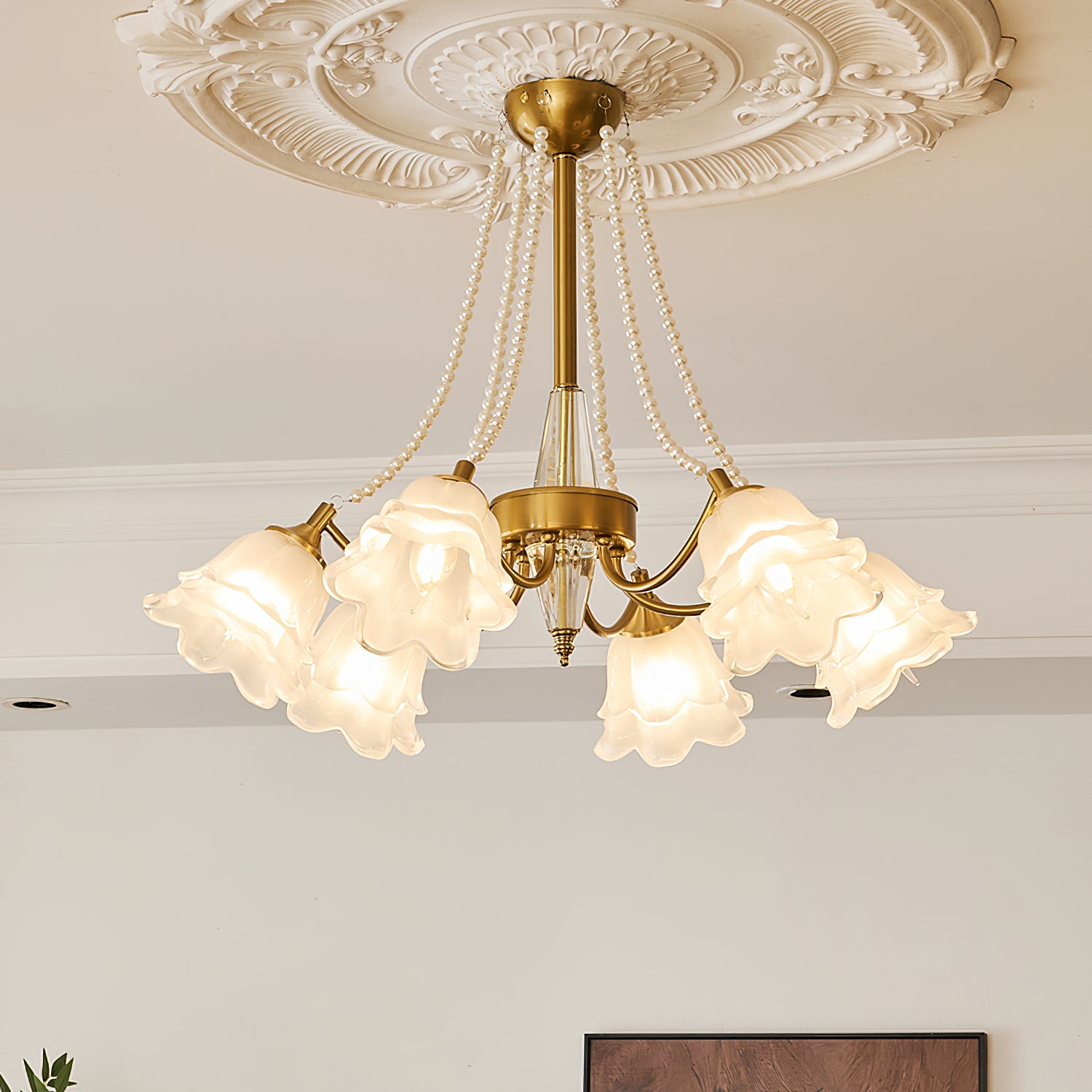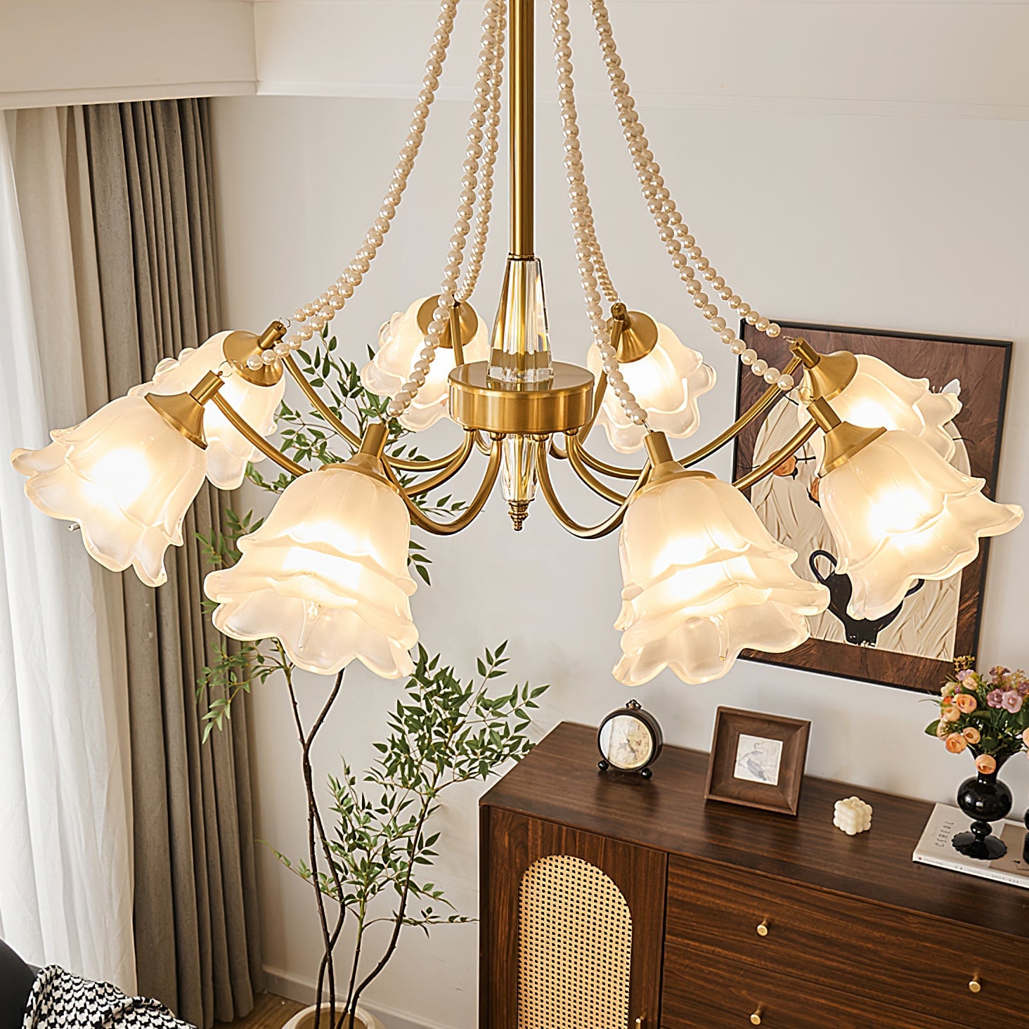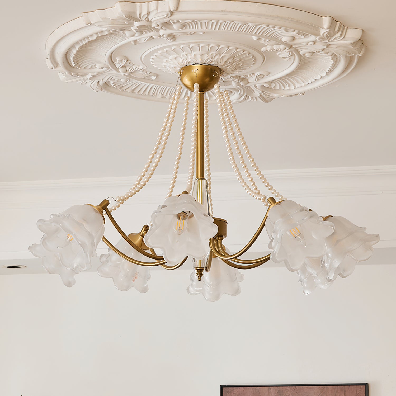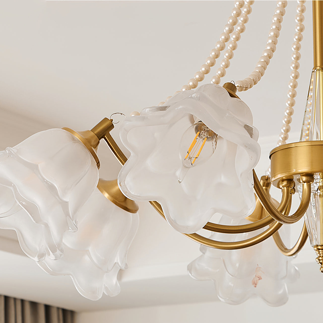 Elevate your living space with the Roses Landi Chandelier from Mooijane. Featuring a bouquet of blooming roses sculpted from luminous glass, this chandelier captures and reflects light for a dazzling effect. The delicate chains and warm golden tones add a touch of regal opulence to your home.