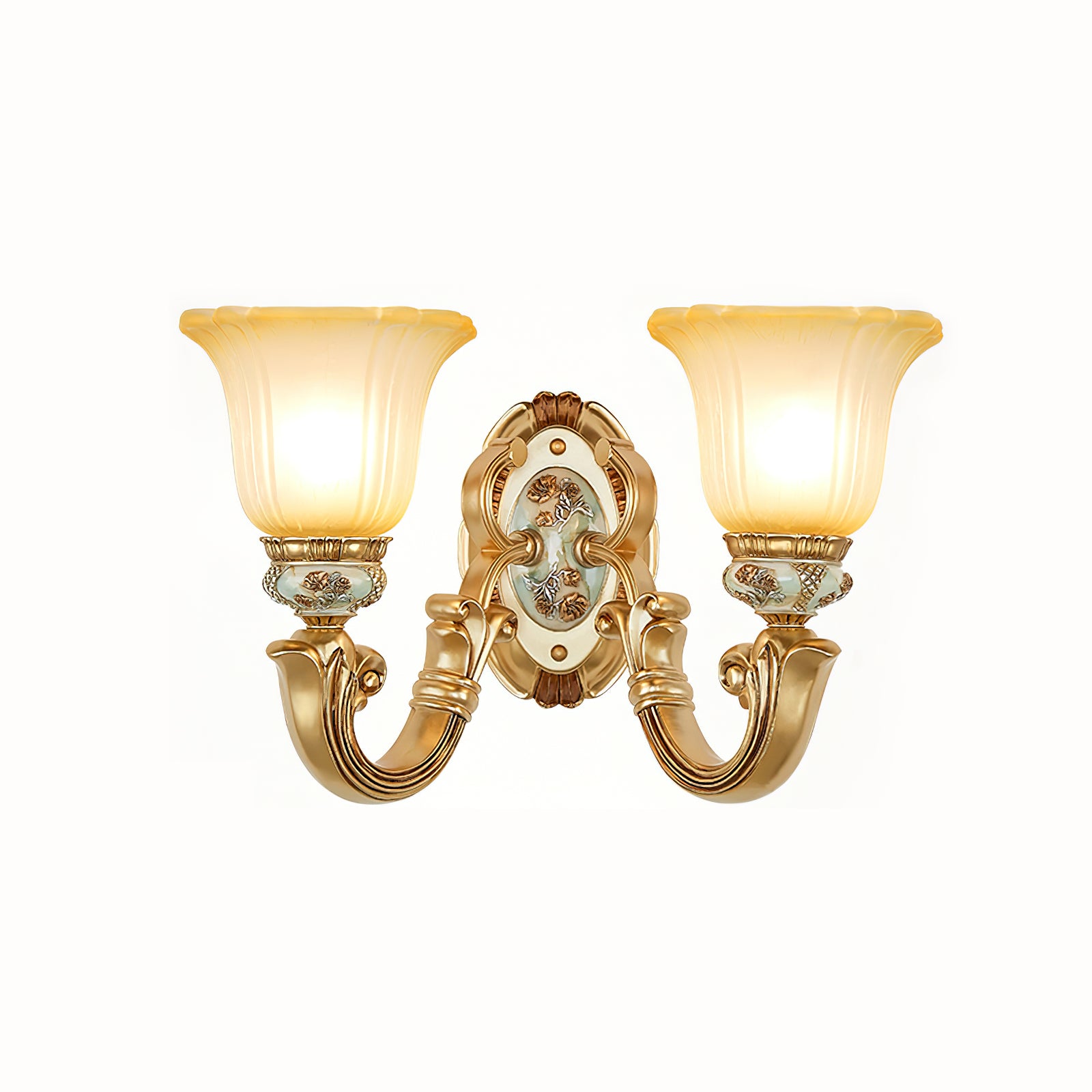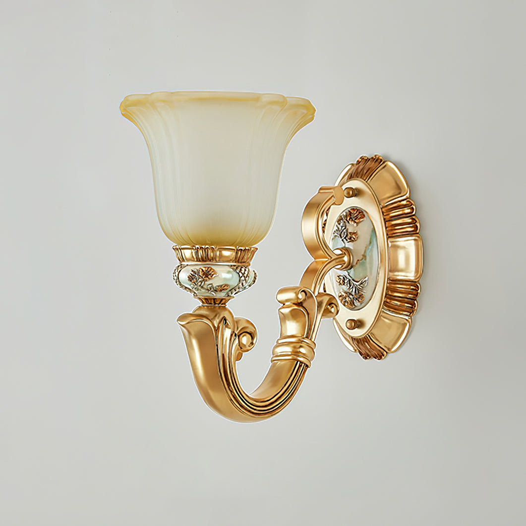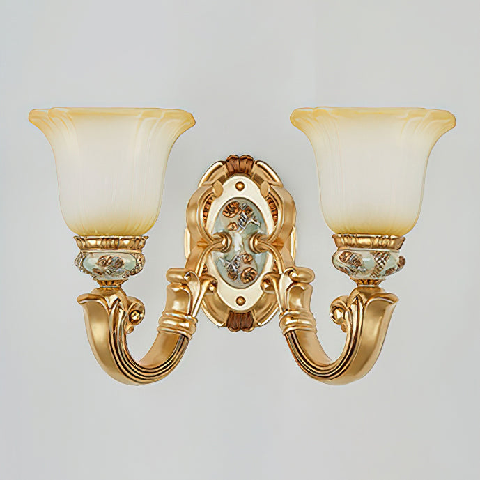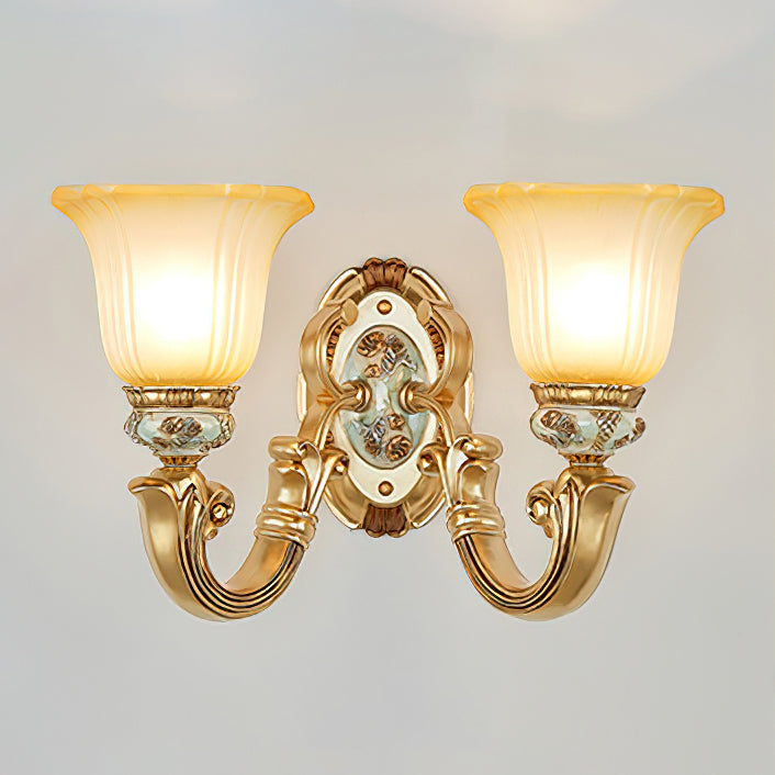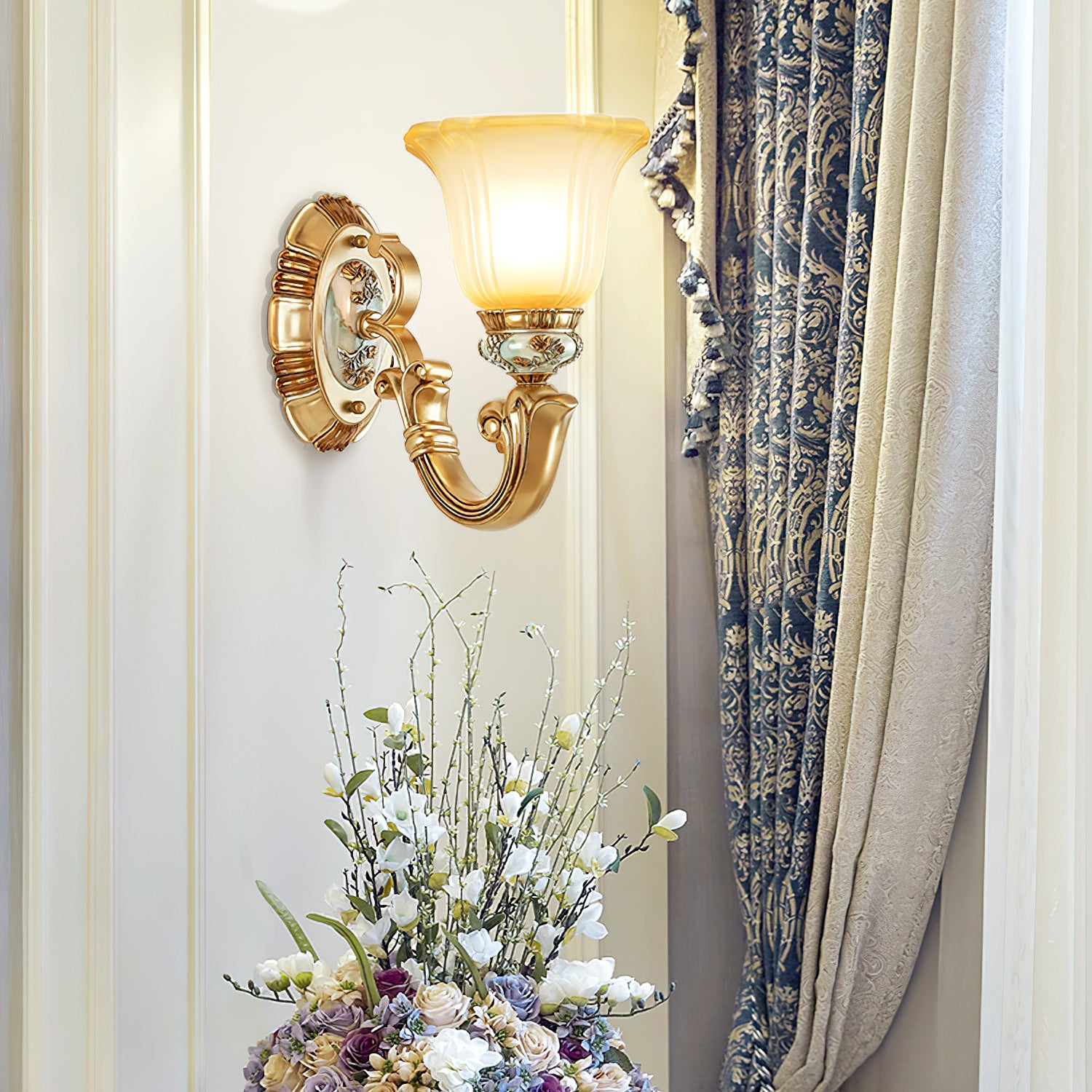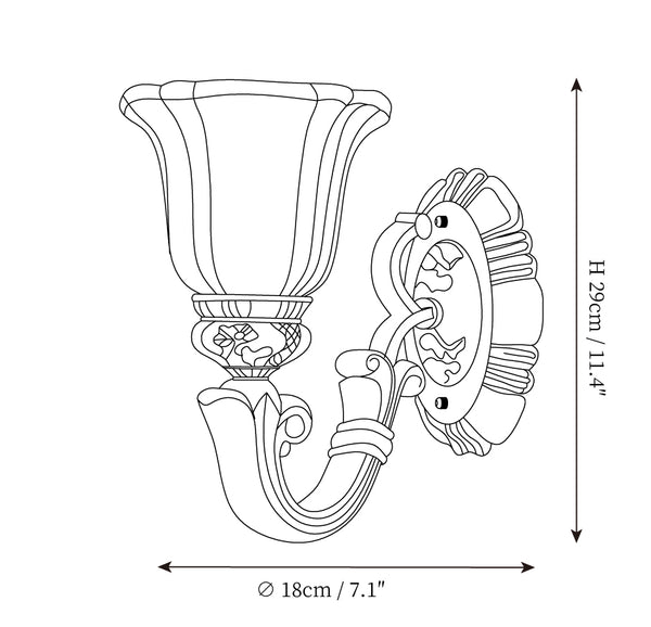 This Royal Big Horn Wall Lamp exudes sophistication and luxury, crafted with beautifully carved resin and a striking glass lampshade, providing a sophisticated statement piece for any space. Its strong iron structure and exquisite floral pattern add an elegant, romantic touch, while the soft warm light adds a royal charm and creates a cozy ambiance.