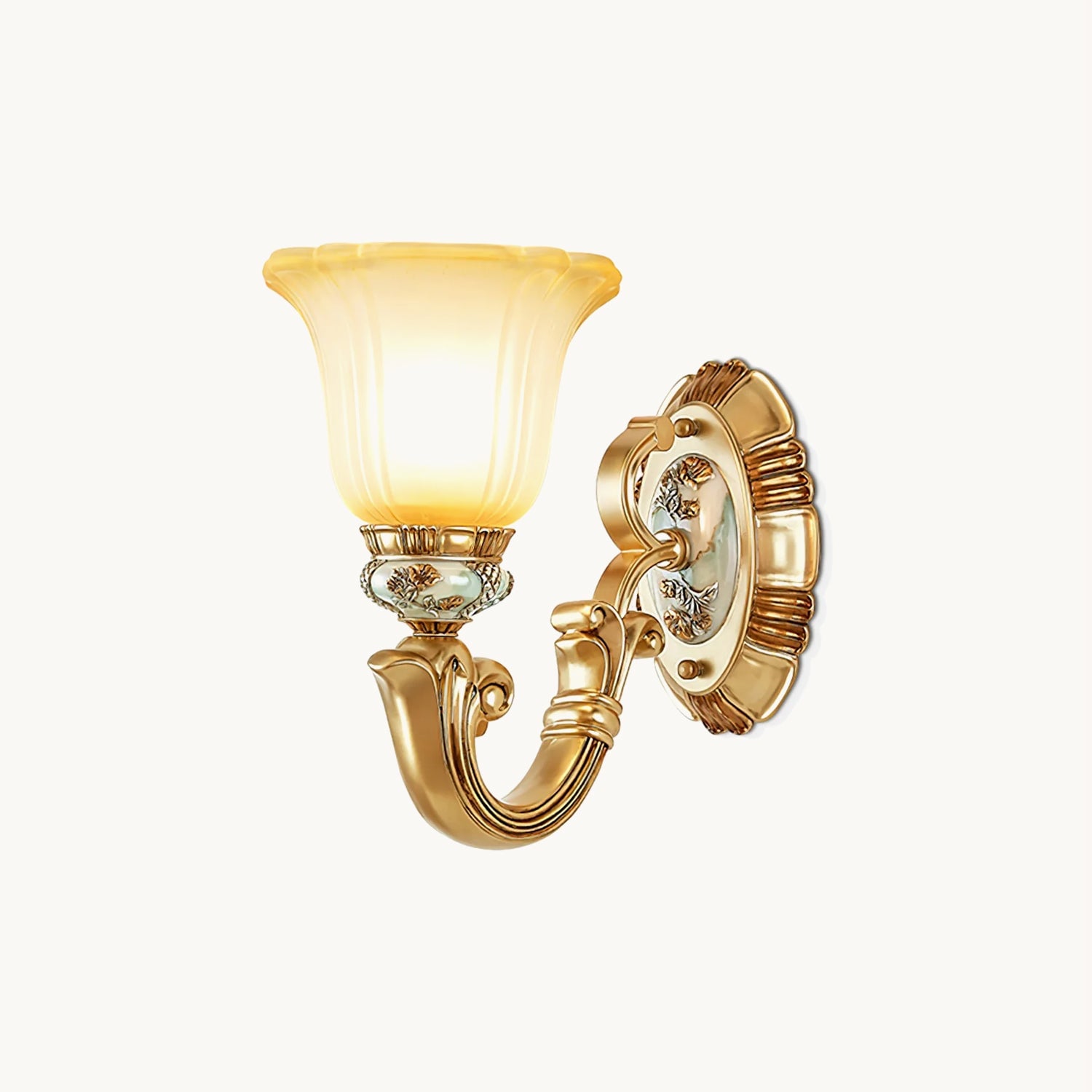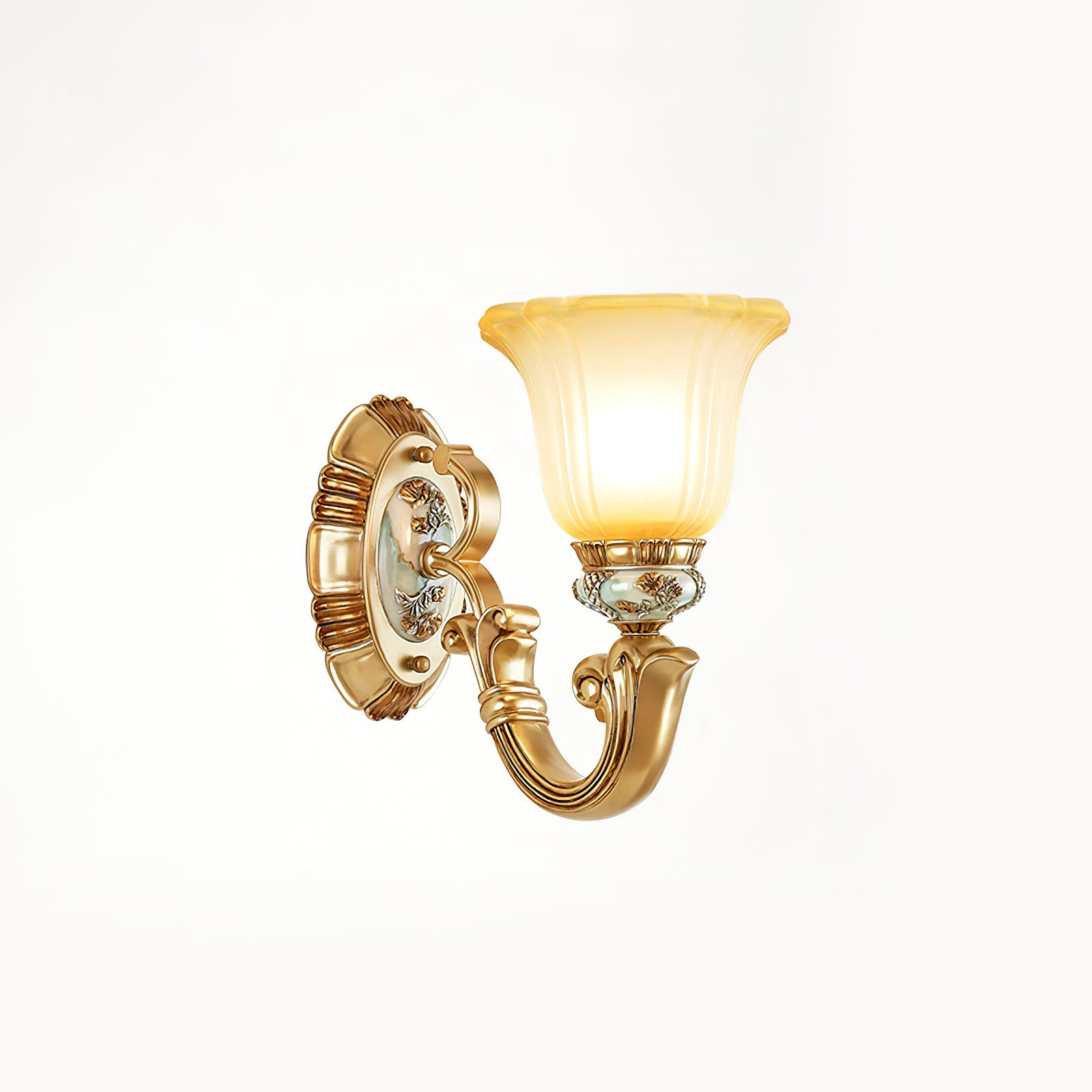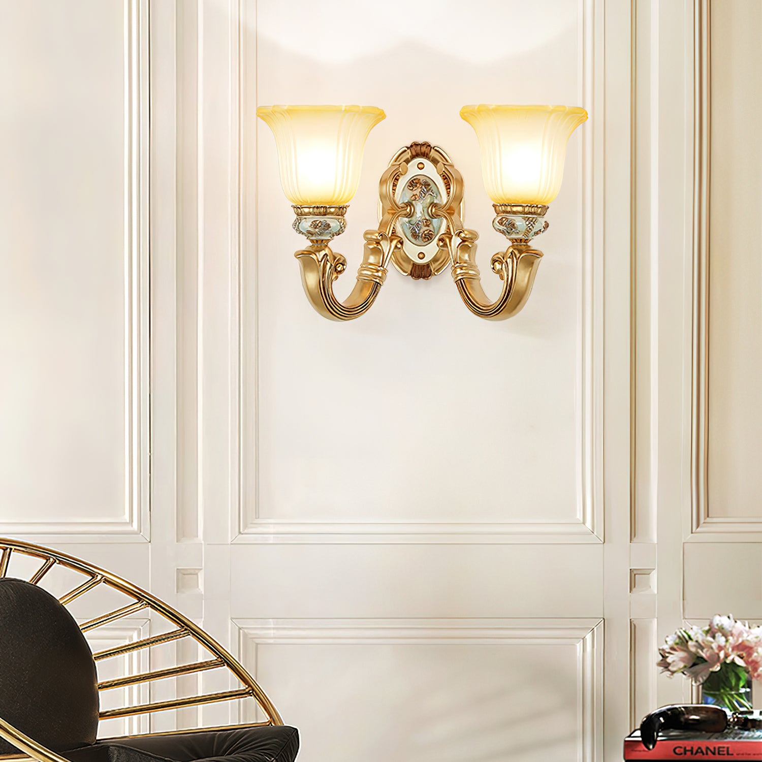 This Royal Big Horn Wall Lamp exudes sophistication and luxury, crafted with beautifully carved resin and a striking glass lampshade, providing a sophisticated statement piece for any space. Its strong iron structure and exquisite floral pattern add an elegant, romantic touch, while the soft warm light adds a royal charm and creates a cozy ambiance.