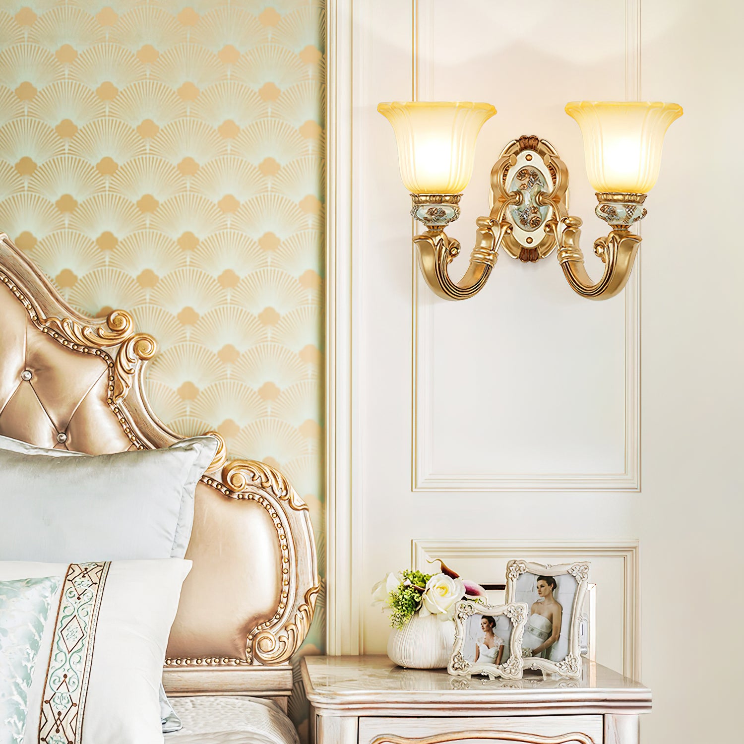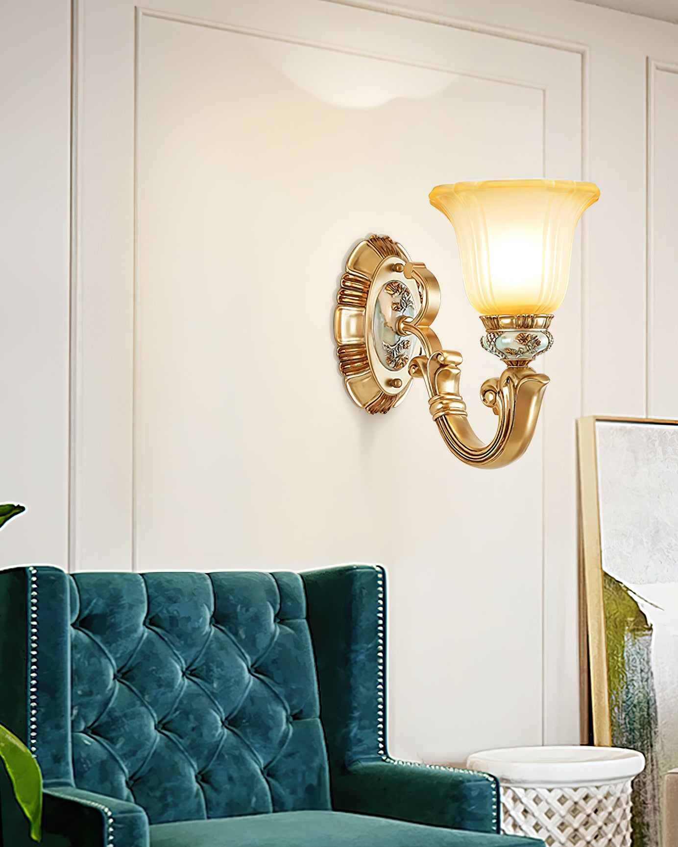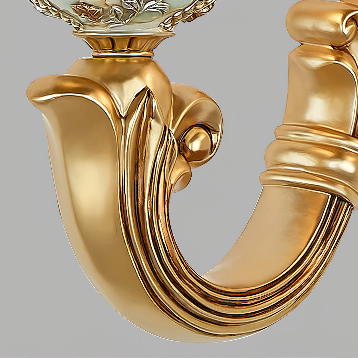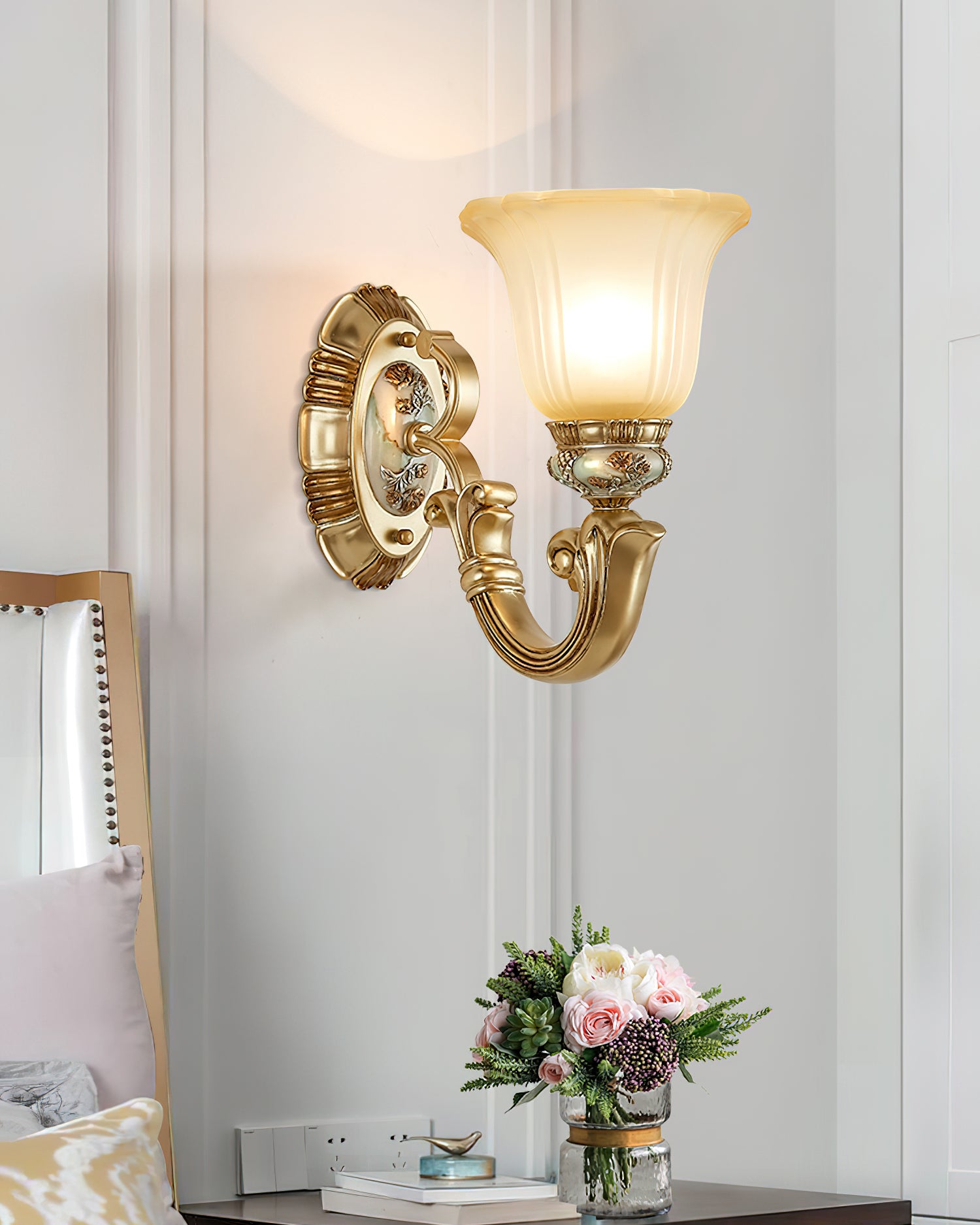 This Royal Big Horn Wall Lamp exudes sophistication and luxury, crafted with beautifully carved resin and a striking glass lampshade, providing a sophisticated statement piece for any space. Its strong iron structure and exquisite floral pattern add an elegant, romantic touch, while the soft warm light adds a royal charm and creates a cozy ambiance.