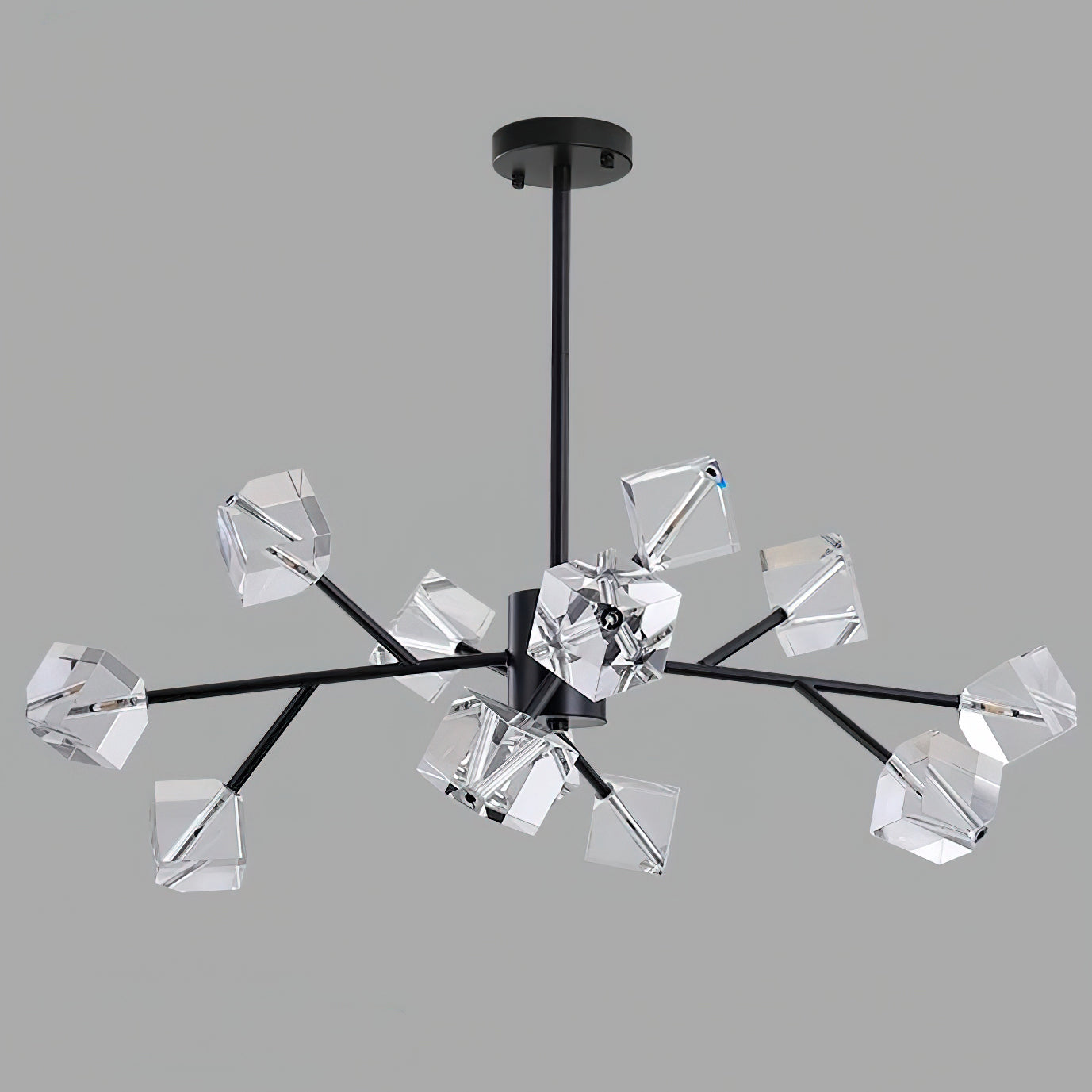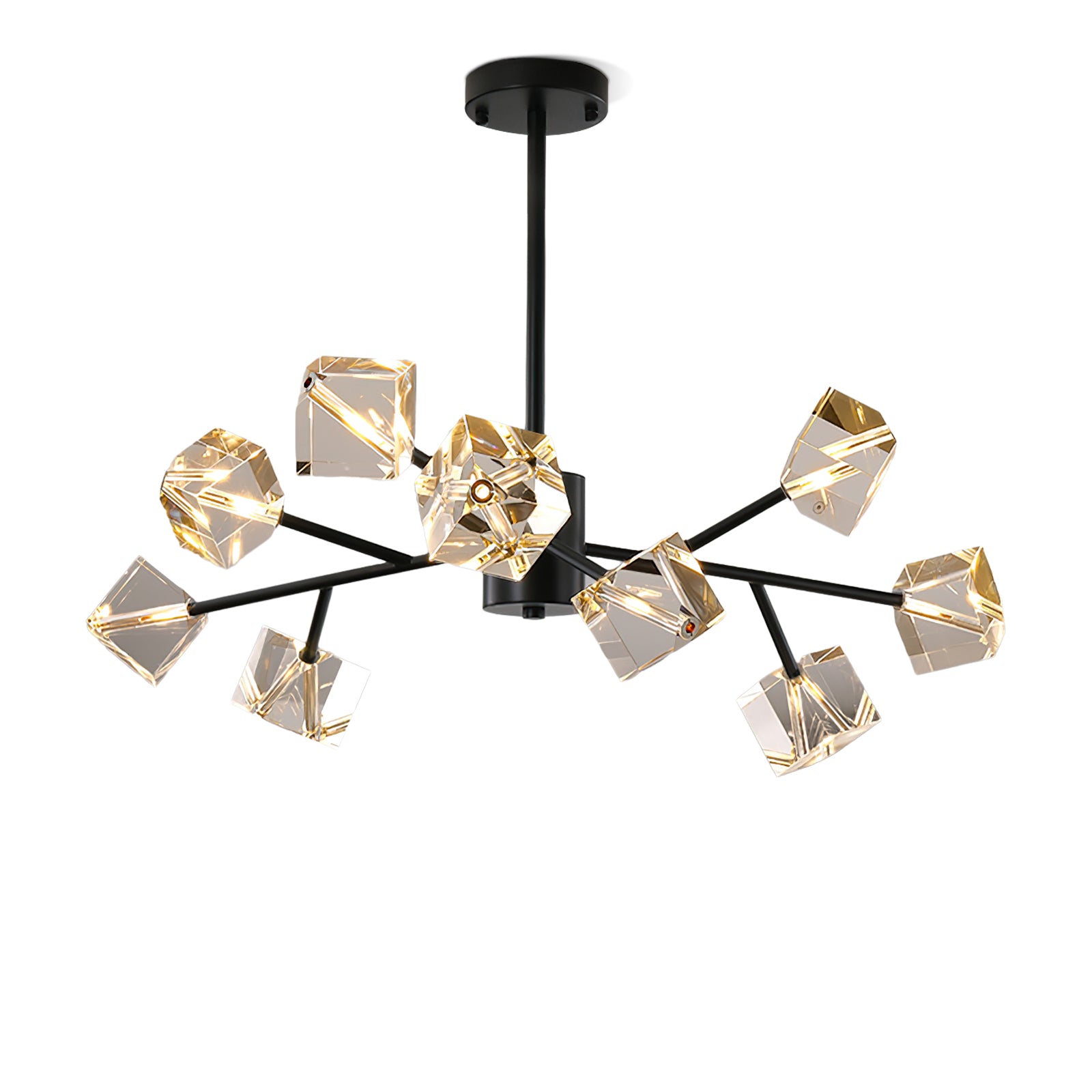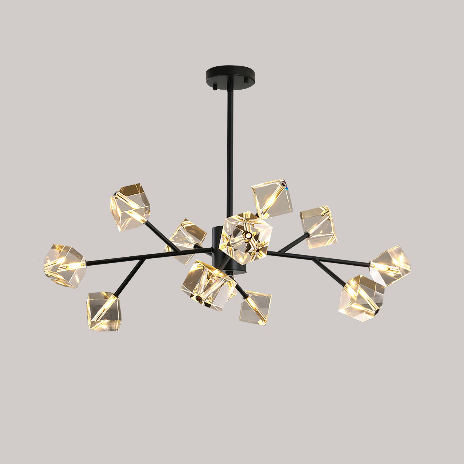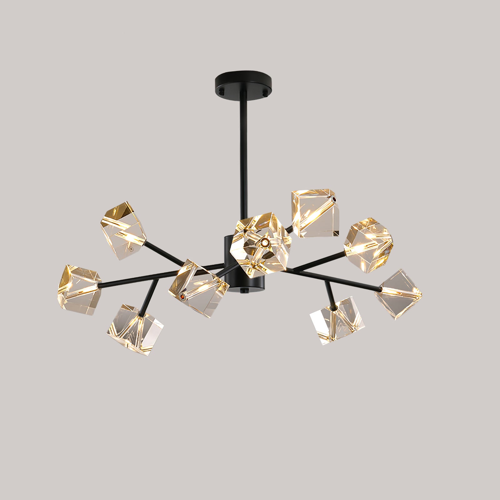 Light up your interior with this Rubik's Cube Ten Positive Chandelier. Crafted with square crystal, its diamond-like internal refraction and reflection illuminate the room with dazzling light. Finished with crystal prismatic cutting, each angle displays a different charm of light and shadow. Enjoy a clutter-free look without too many modifications, even during the day when natural light is available. Soft edges provide a safe touch, while its crystal clarity, delicate texture, and gorgeous refractions make it an opulent touch of sophistication.