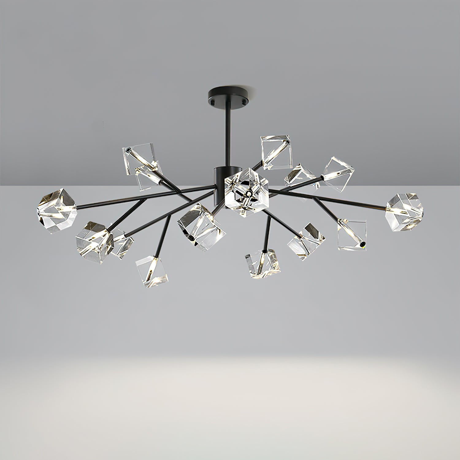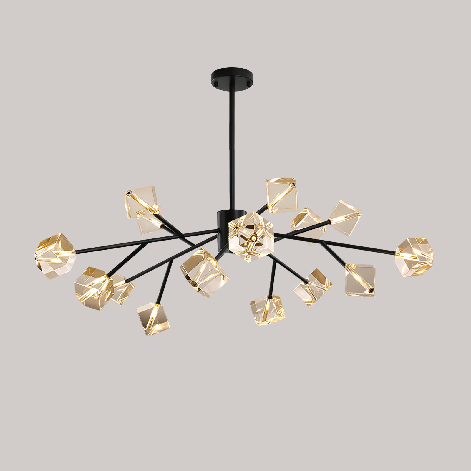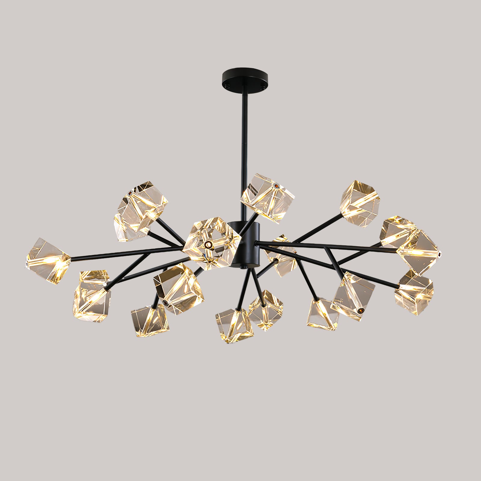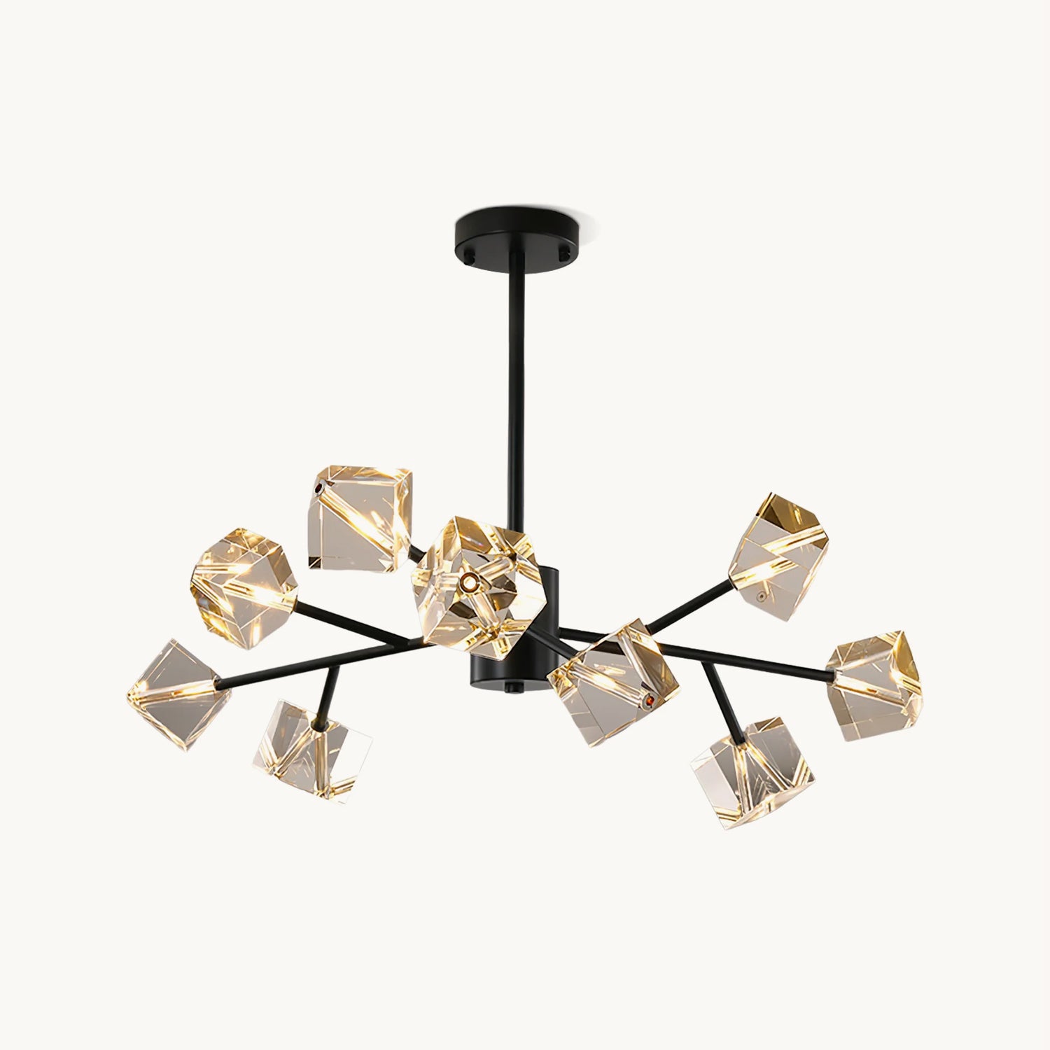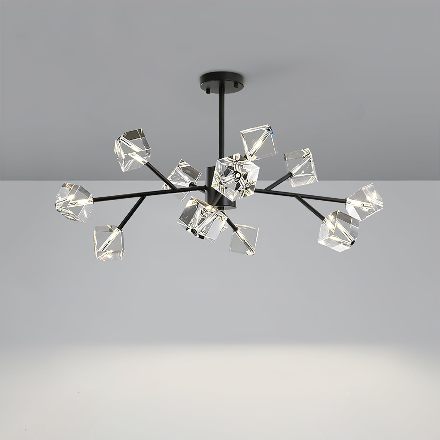 Light up your interior with this Rubik's Cube Ten Positive Chandelier. Crafted with square crystal, its diamond-like internal refraction and reflection illuminate the room with dazzling light. Finished with crystal prismatic cutting, each angle displays a different charm of light and shadow. Enjoy a clutter-free look without too many modifications, even during the day when natural light is available. Soft edges provide a safe touch, while its crystal clarity, delicate texture, and gorgeous refractions make it an opulent touch of sophistication.