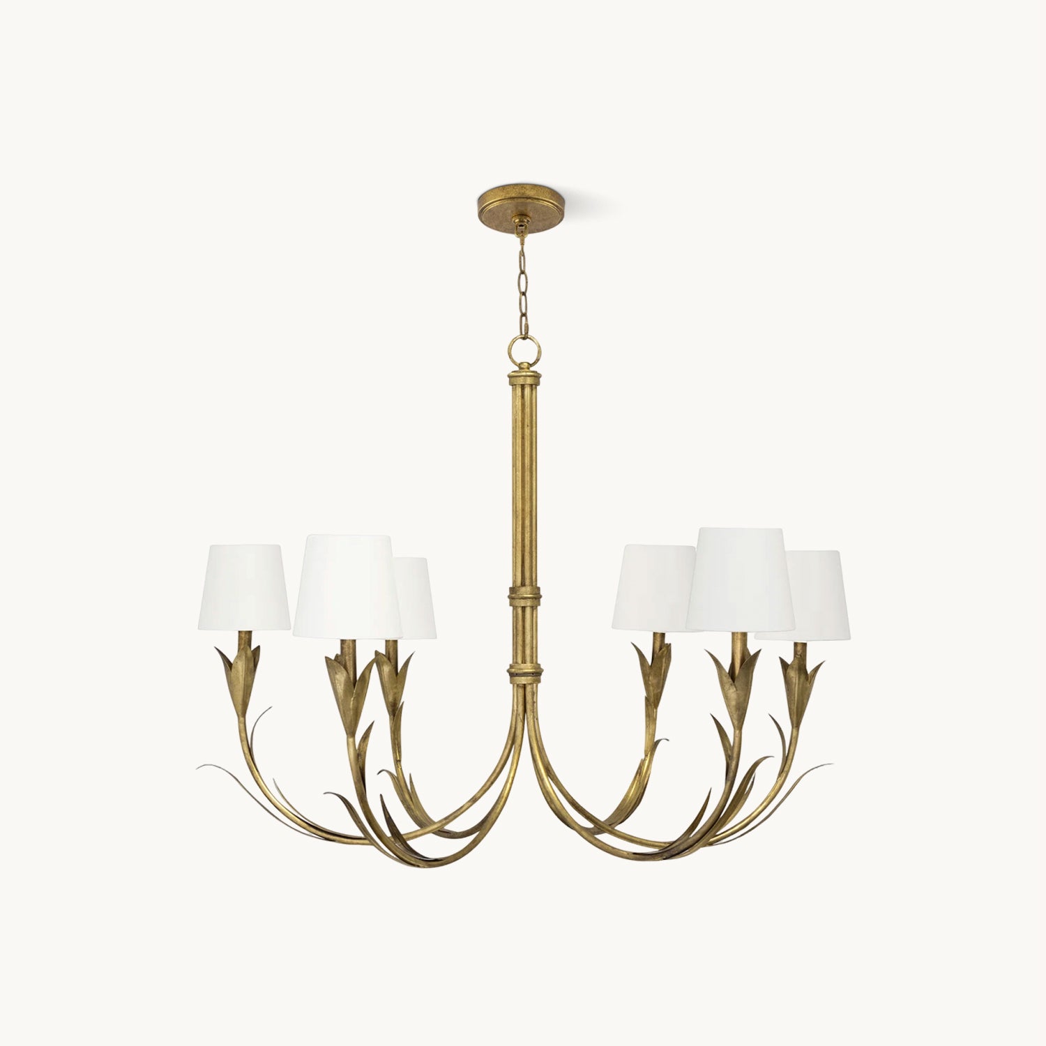 The Ruhlmann Chandelier from Mooijane brings a refined botanical touch to traditional interiors. Featuring gracefully reeded arms and natural linen shades, it evokes organic elegance with a timeless finish. Mounted on a classic round base, this chandelier adds warmth and sophistication to dining rooms, living spaces, or entryways.